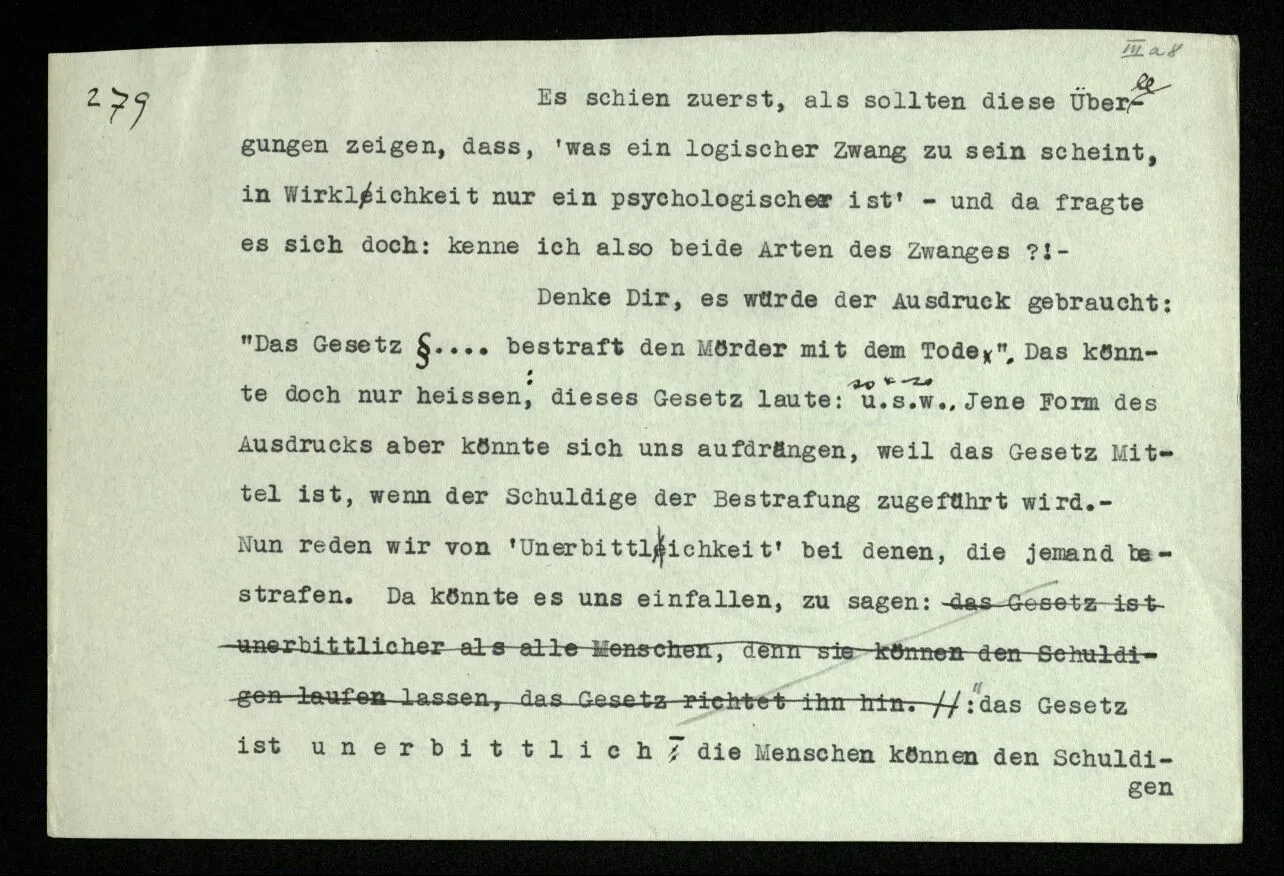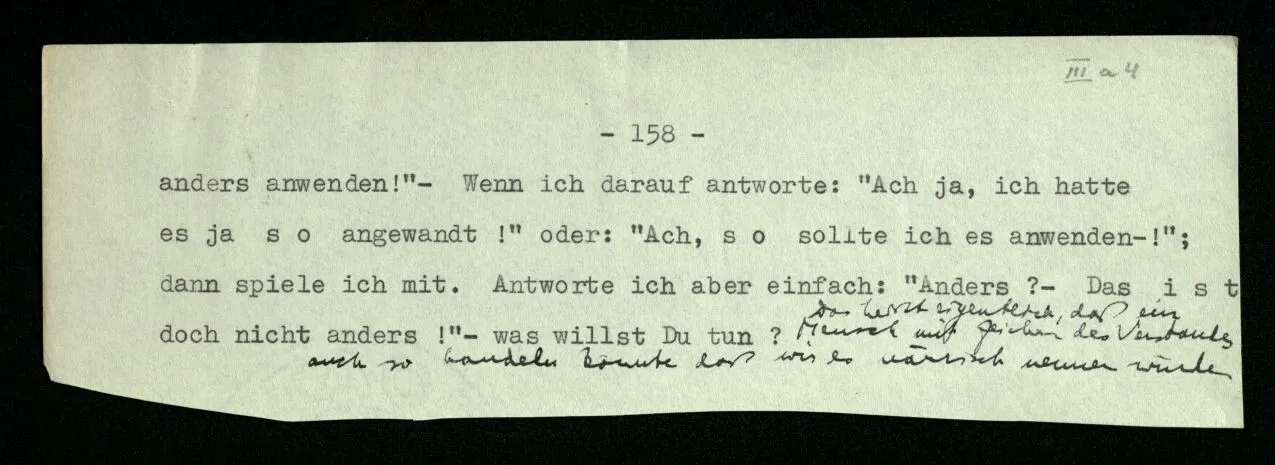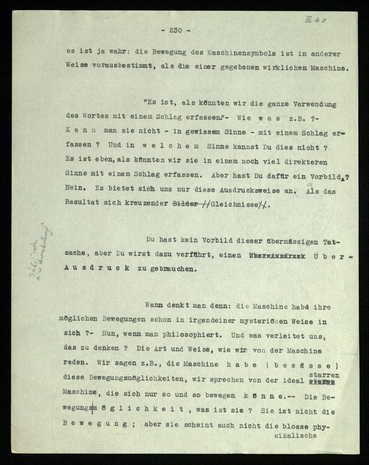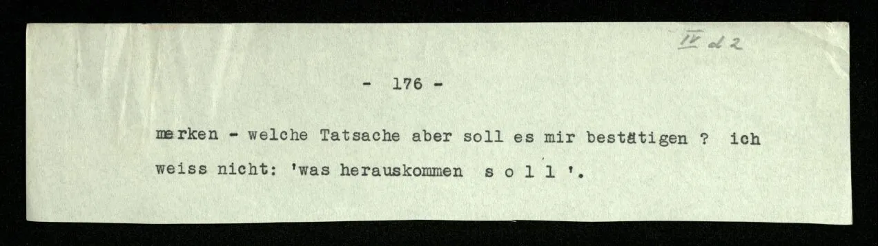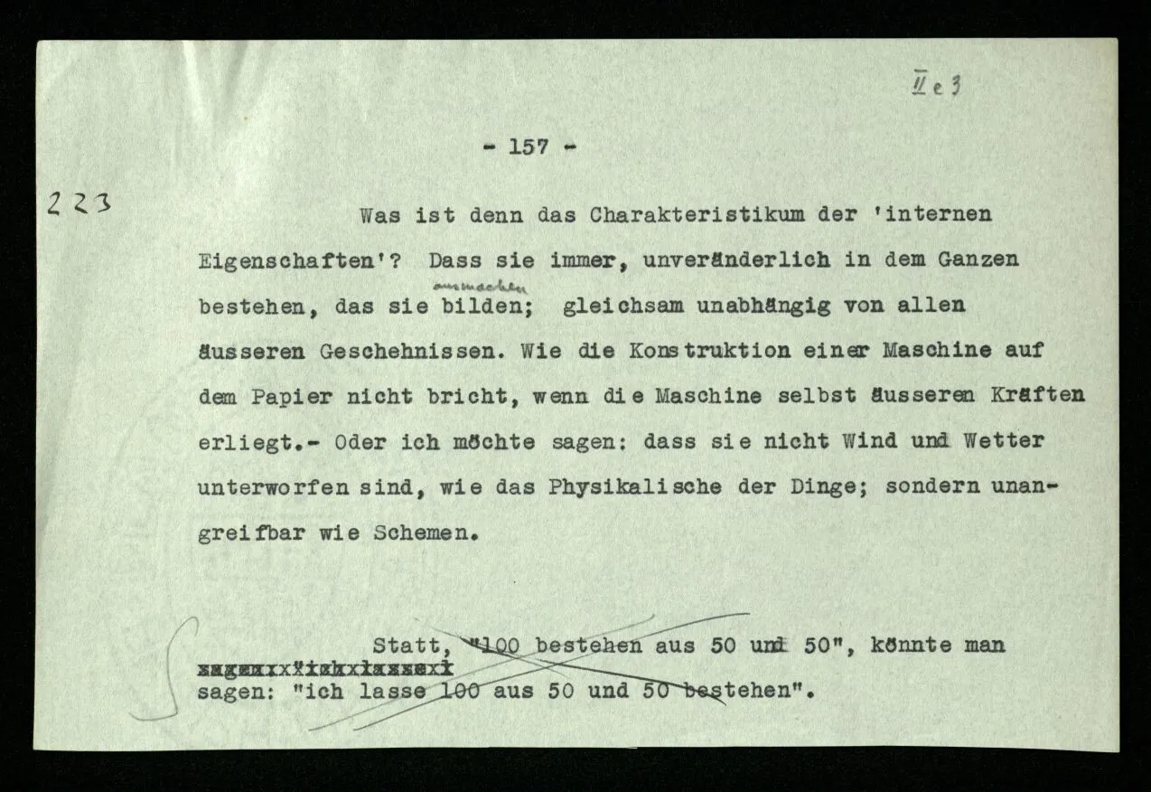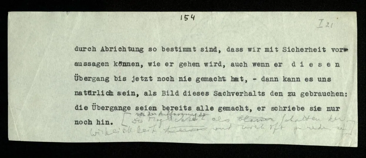 Man möchte etwa von der Funktion, der Tätigkeit, Wirkungsweise des Wortes in diesem Satz reden wie von der Funktion eines Hebels in einer Maschine. Aber worin besteht diese Funktion? Wie tritt sie zutage? Denn es ist ja nichts verborgen! wir sehen ja den ganzen Satz. Die Funktion muß sich im Laufe des Kalküls zeigen. Man will aber sagen: “‘non’ tut dasselbe mit ‘p’, was ‘ne’ tut: es kehrt ihn um”. Aber das sind nur andere Worte für: “non p = ne p”. Immer wieder der Gedanke, das Bild daß, was wir vom Zeichen sehen, nur eine Außenseite zu einem Innern ist, worin sich die eigentlichen Prozesse des Sinnes und der Bedeutung abspielen.