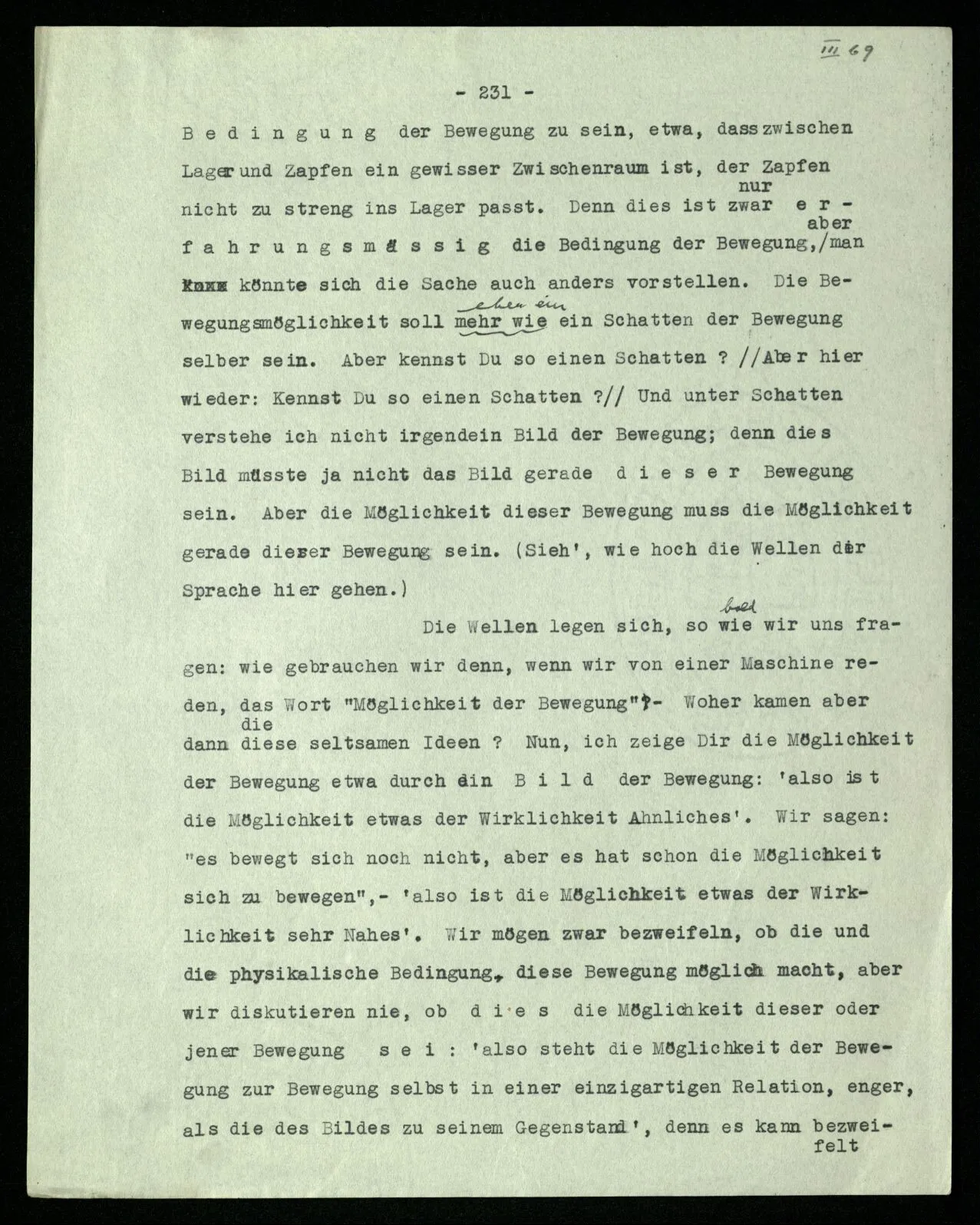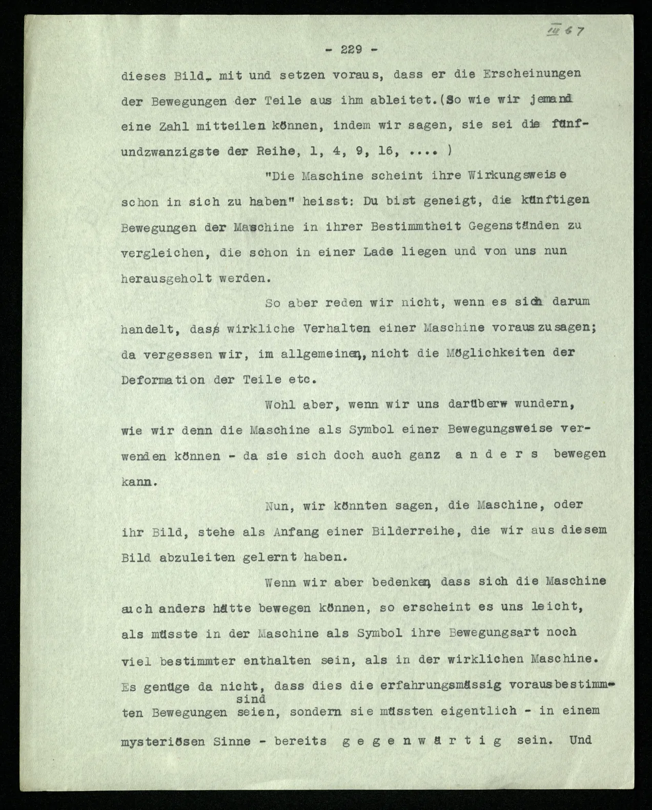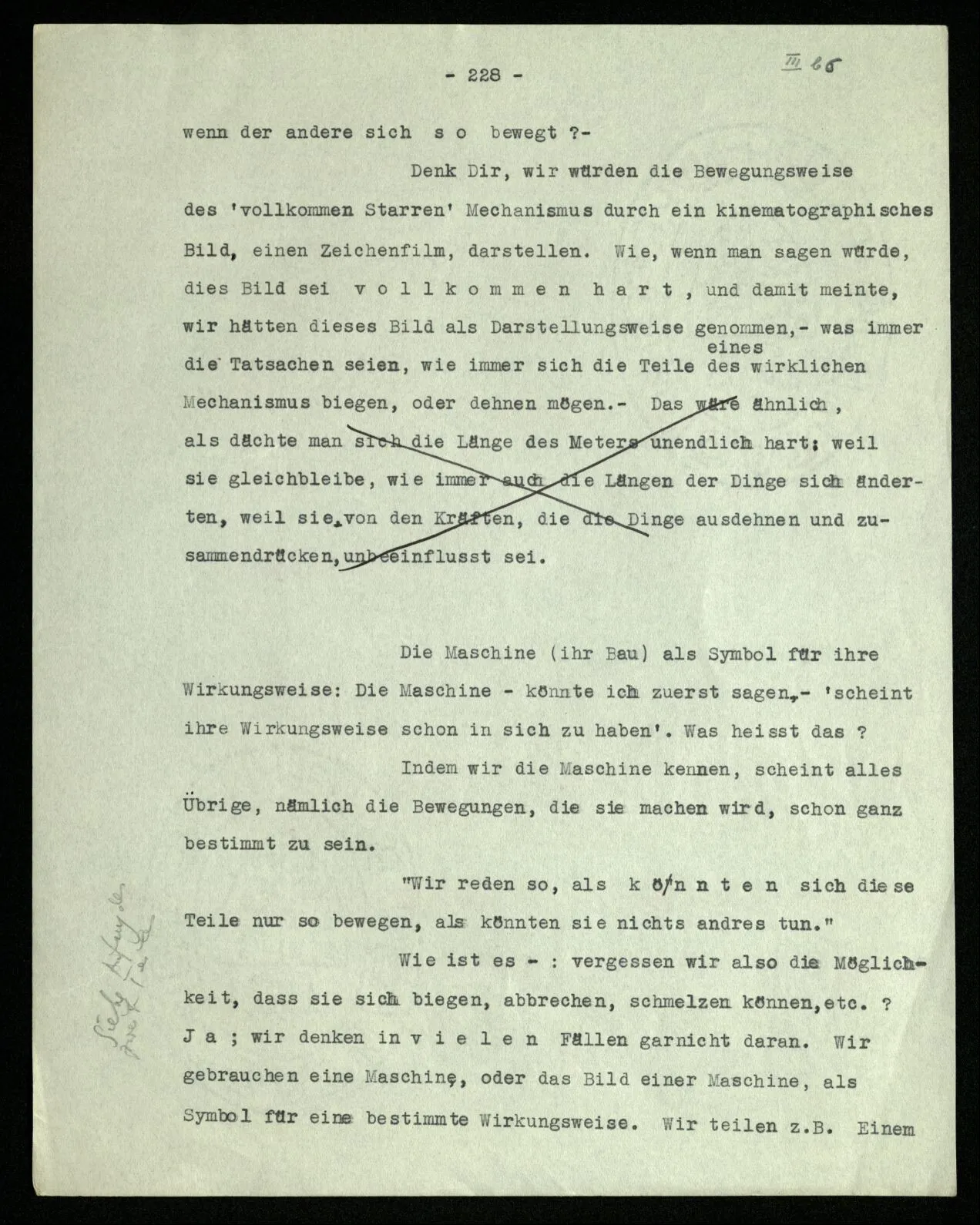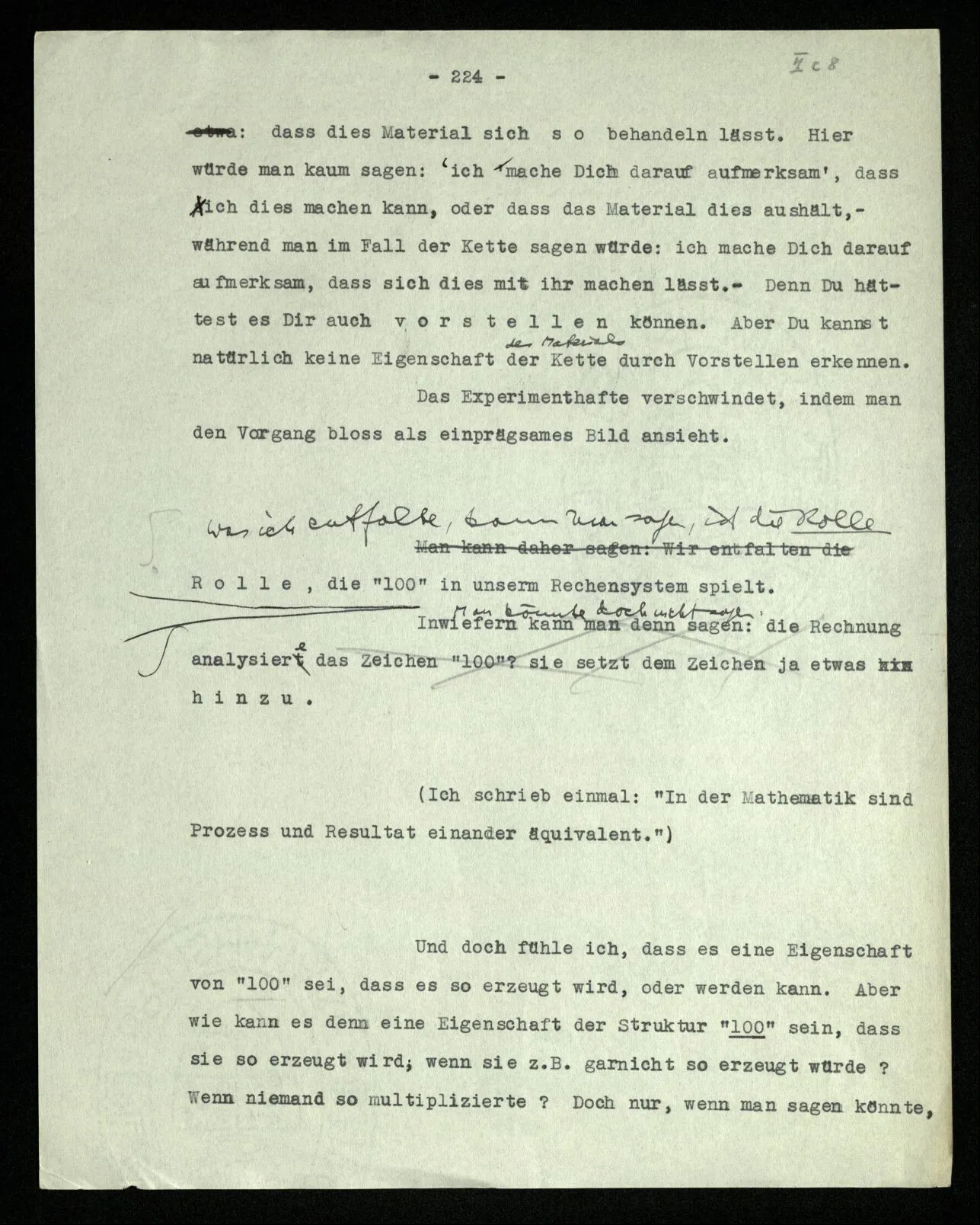 Man möchte etwa von der Funktion, der Tätigkeit, Wirkungsweise des Wortes in diesem Satz reden wie von der Funktion eines Hebels in einer Maschine. Aber worin besteht diese Funktion? Wie tritt sie zutage? Denn es ist ja nichts verborgen! wir sehen ja den ganzen Satz. Die Funktion muß sich im Laufe des Kalküls zeigen. Man will aber sagen: “‘non’ tut dasselbe mit ‘p’, was ‘ne’ tut: es kehrt ihn um”. Aber das sind nur andere Worte für: “non p = ne p”. Immer wieder der Gedanke, das Bild daß, was wir vom Zeichen sehen, nur eine Außenseite zu einem Innern ist, worin sich die eigentlichen Prozesse des Sinnes und der Bedeutung abspielen.