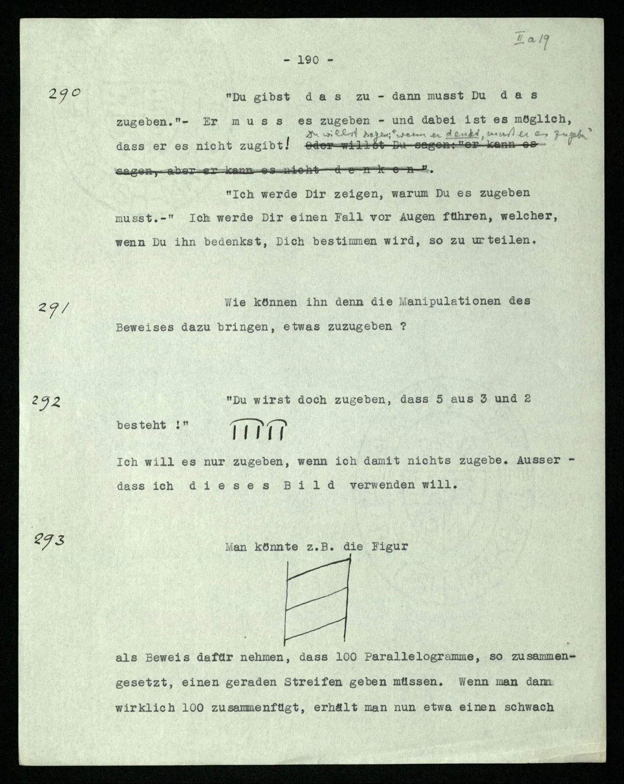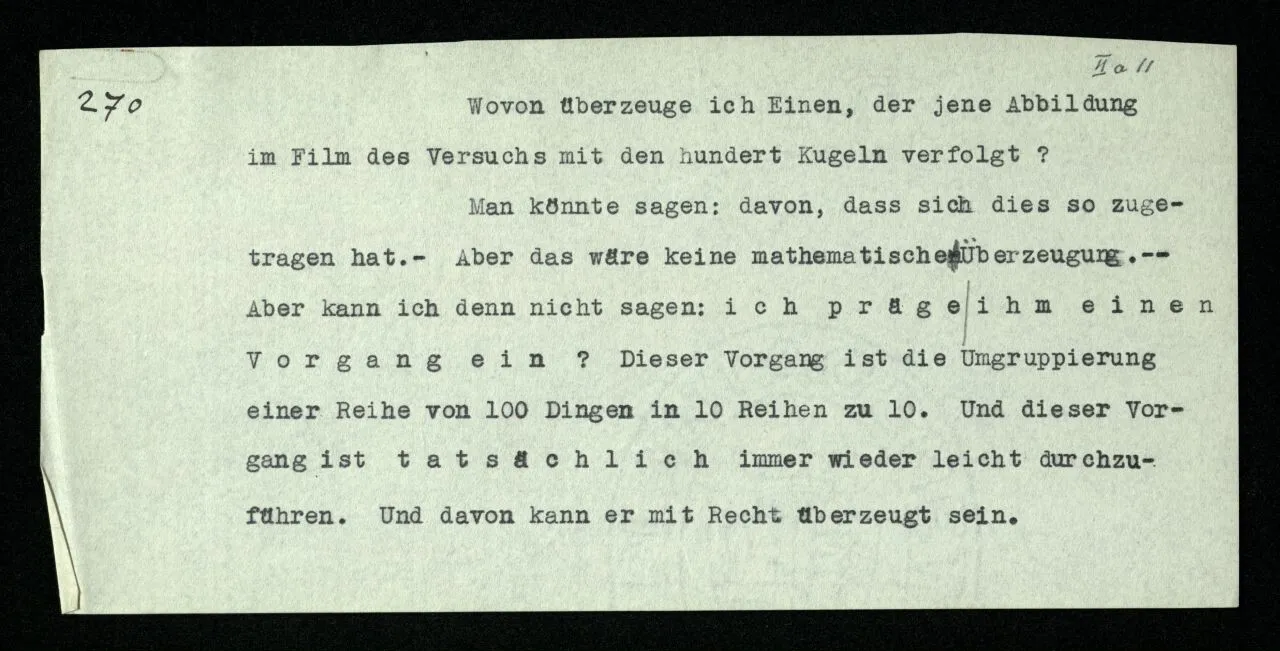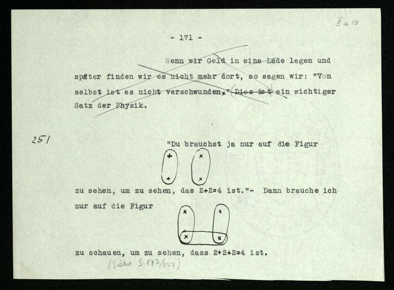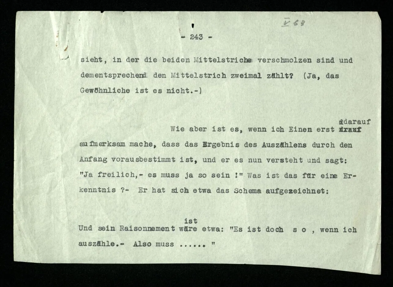 Erfahrung lehrt, daß beim Auszählen, wenn wir die Finger einer Hand brauchen, oder irgend eine Gruppe von Dingen, die so ❘ ❘ ❘ ❘ ❘ ausschaut, und an ihnen abzählen: Ich, Du, Ich, Du, etc. das erste Wort auch das letzte ist. “Aber muß es denn nicht so sein?” ‒ ‒ Ist es denn so unvorstellbar, daß Einer die Gruppe ❘ ❘ ❘ ❘ ❘ (z.B.) als Gruppe ❘ ❘ ❘❘ ❘ ❘ sieht, in der die beiden Mittelstriche verschmolzen sind und dementsprechend den Mittelstrich zweimal zählt. (Ja, das Gewöhnliche ist es nicht. –)