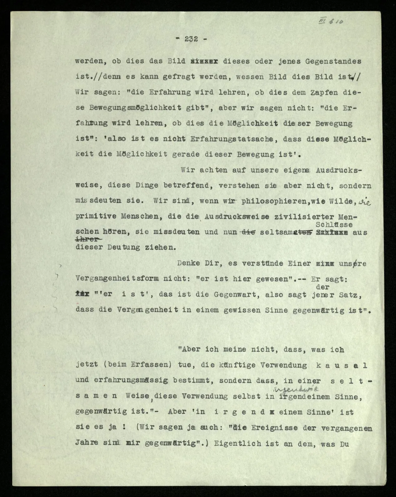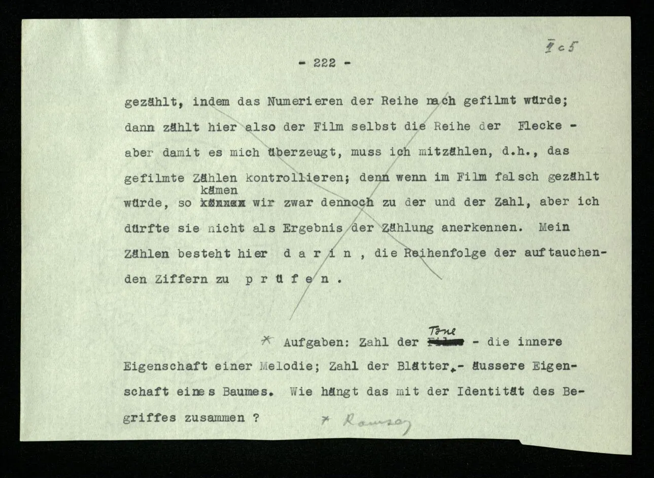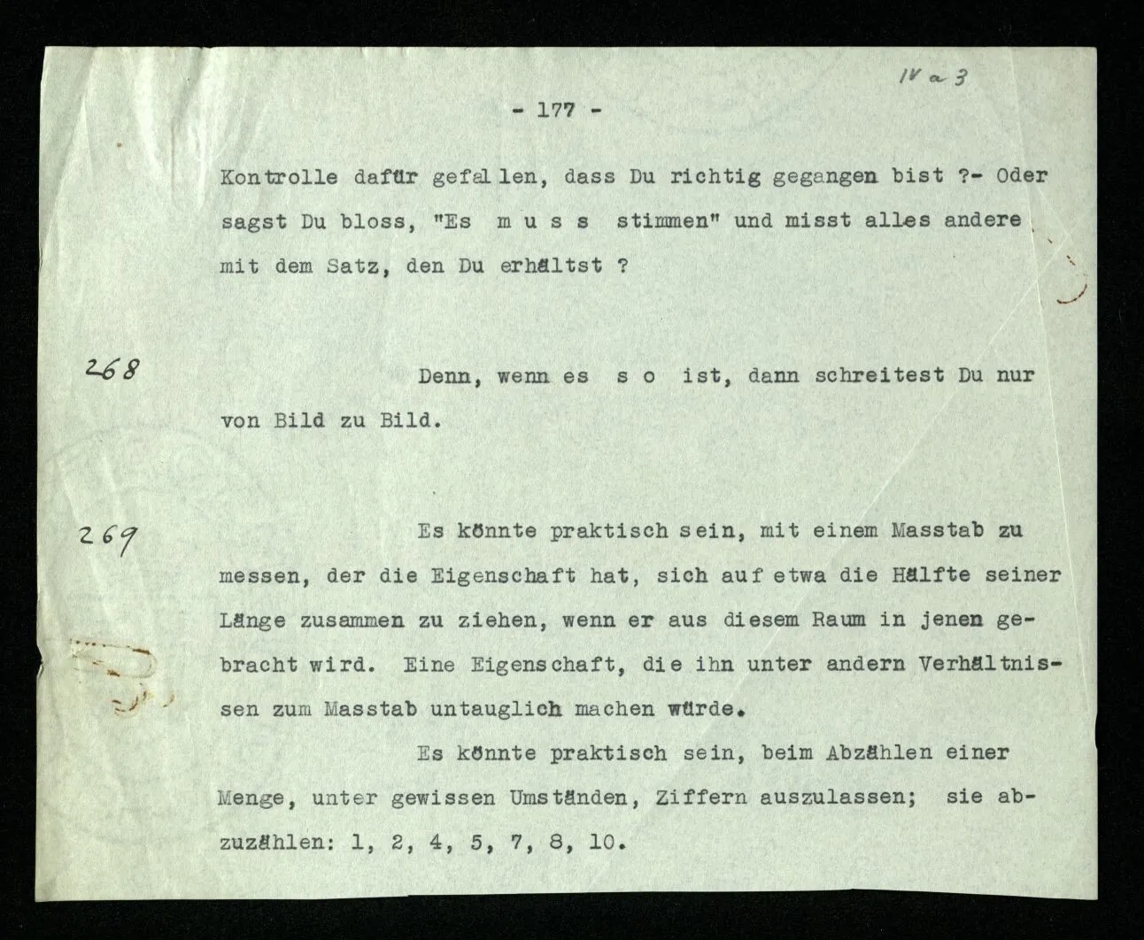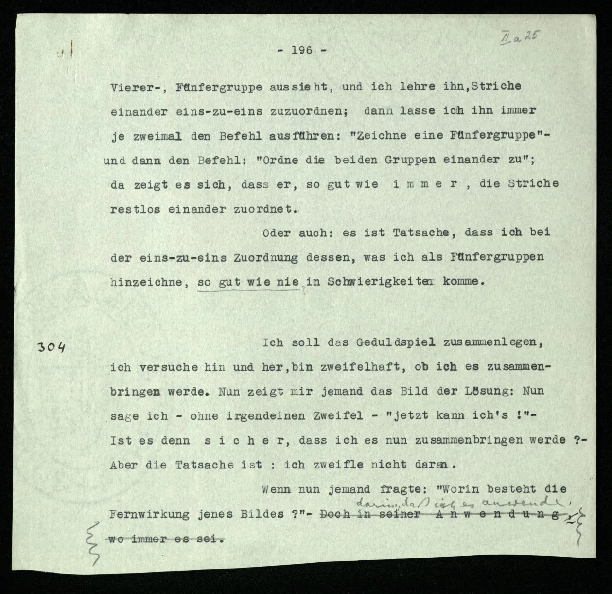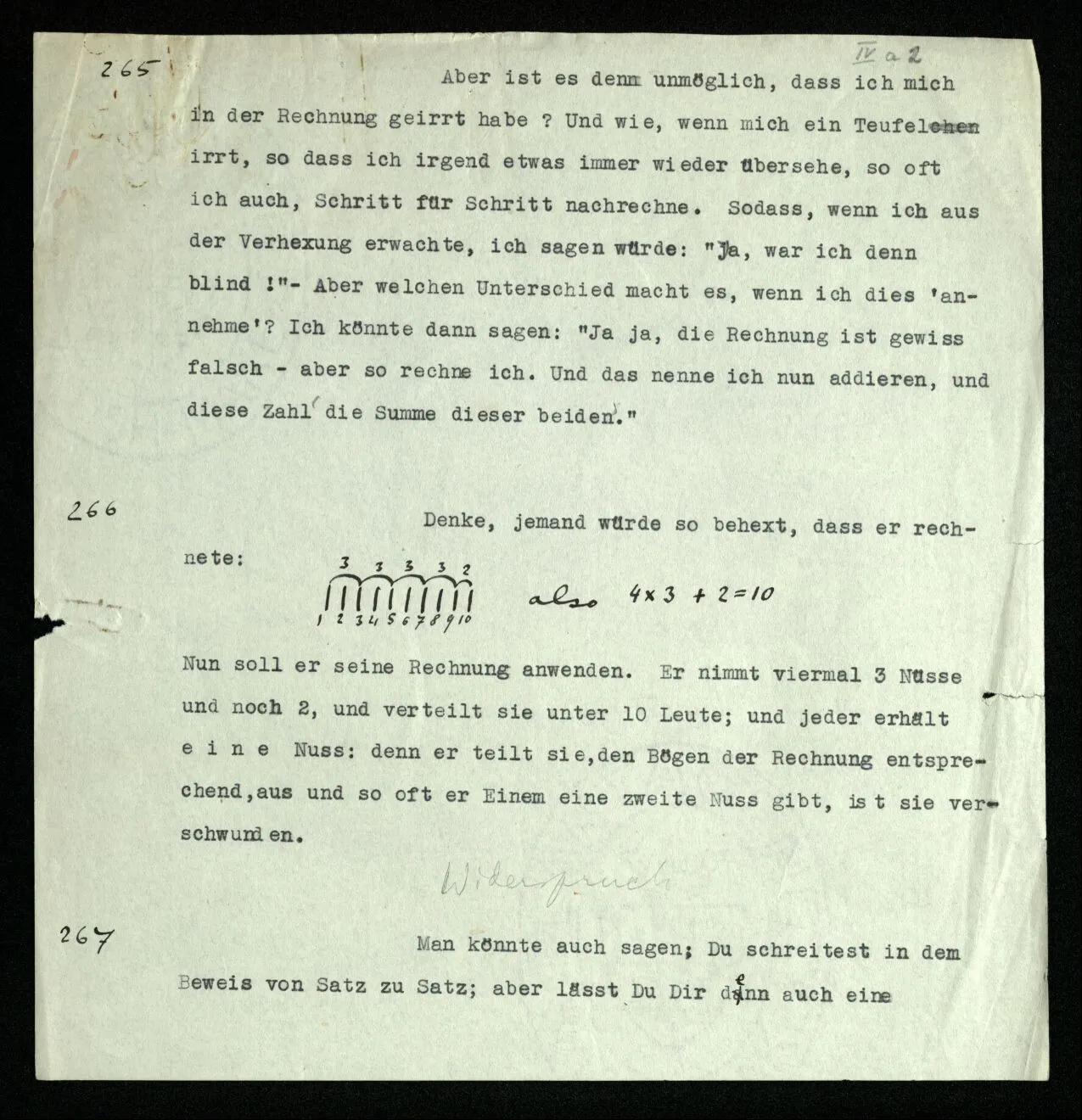 Erfahrung lehrt, daß beim Auszählen, wenn wir die Finger einer Hand brauchen, oder irgend eine Gruppe von Dingen, die so ❘ ❘ ❘ ❘ ❘ ausschaut, und an ihnen abzählen: Ich, Du, Ich, Du, etc. das erste Wort auch das letzte ist. “Aber muß es denn nicht so sein?” ‒ ‒ Ist es denn so unvorstellbar, daß Einer die Gruppe ❘ ❘ ❘ ❘ ❘ (z.B.) als Gruppe ❘ ❘ ❘❘ ❘ ❘ sieht, in der die beiden Mittelstriche verschmolzen sind und dementsprechend den Mittelstrich zweimal zählt. (Ja, das Gewöhnliche ist es nicht. –)