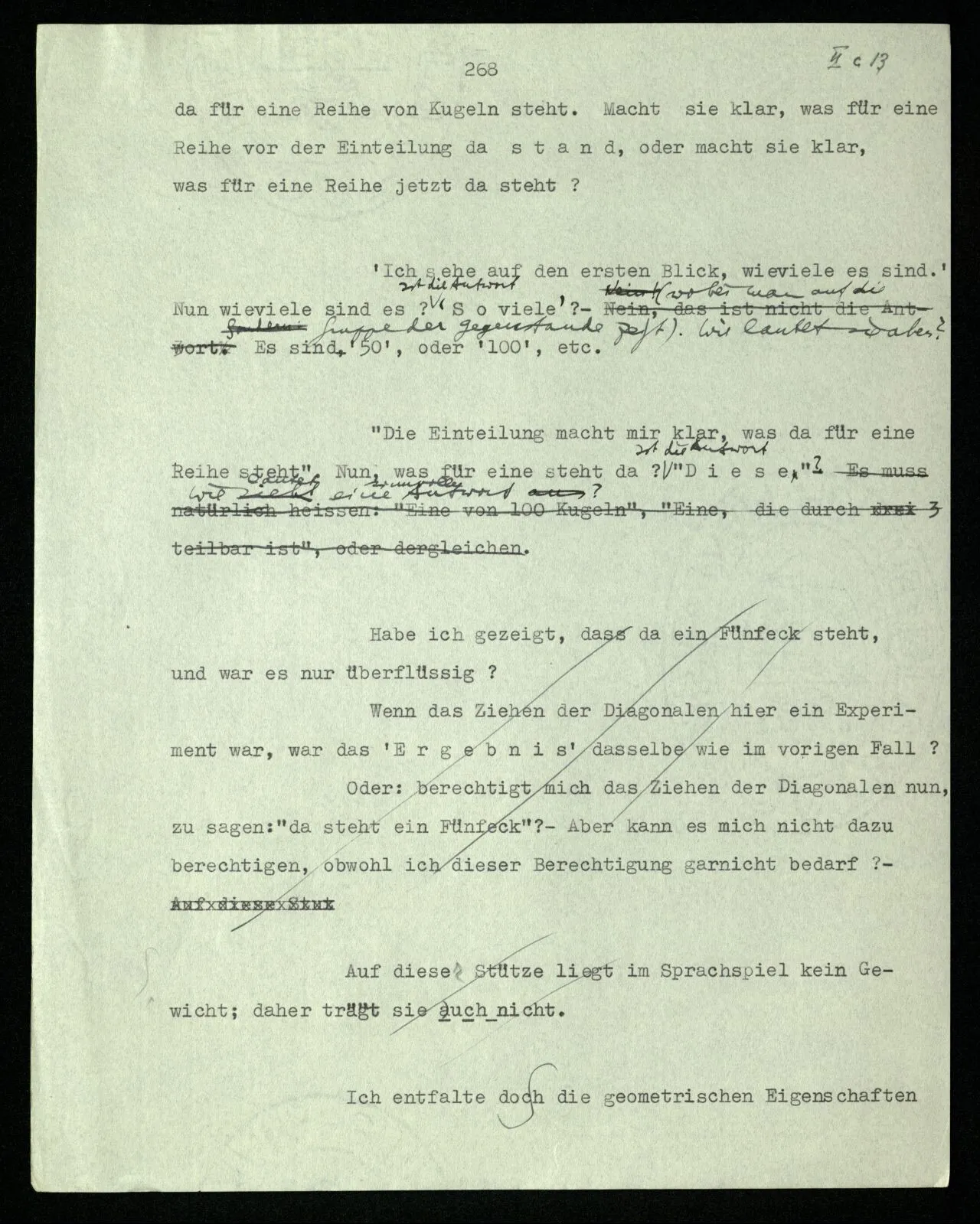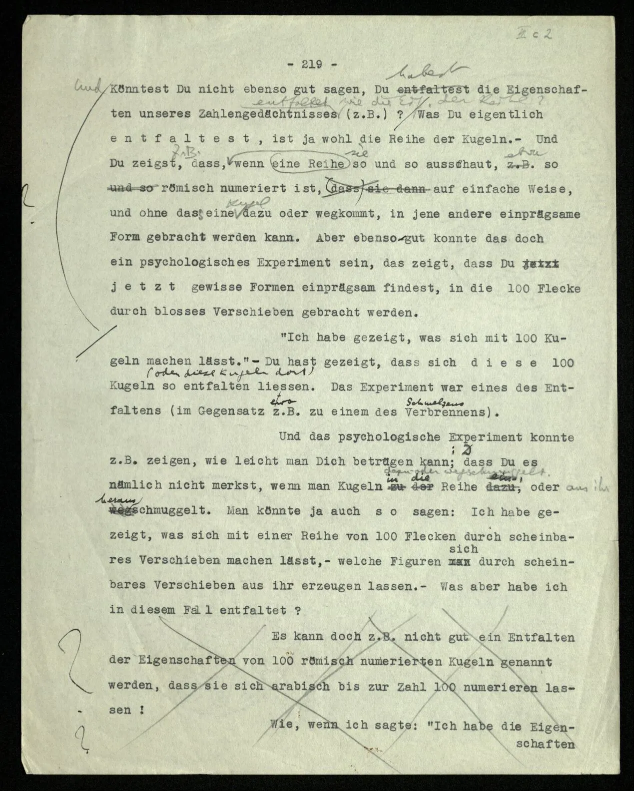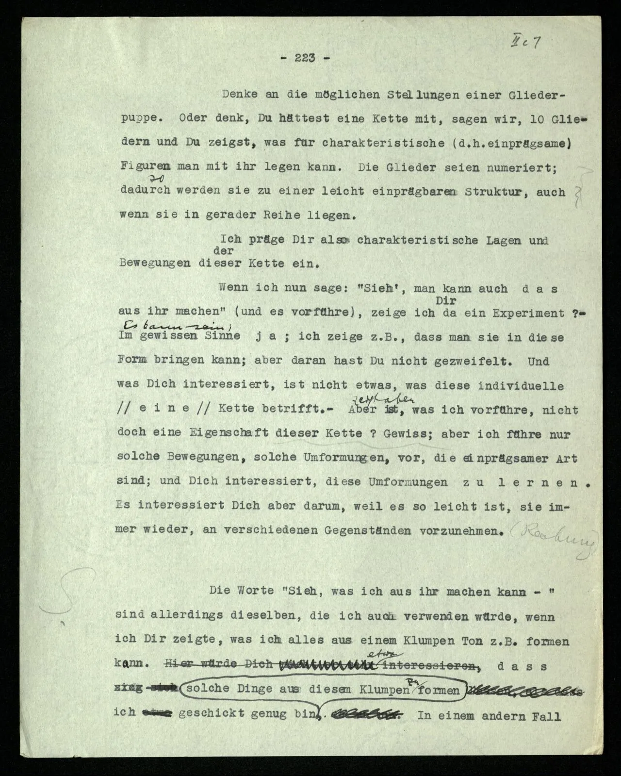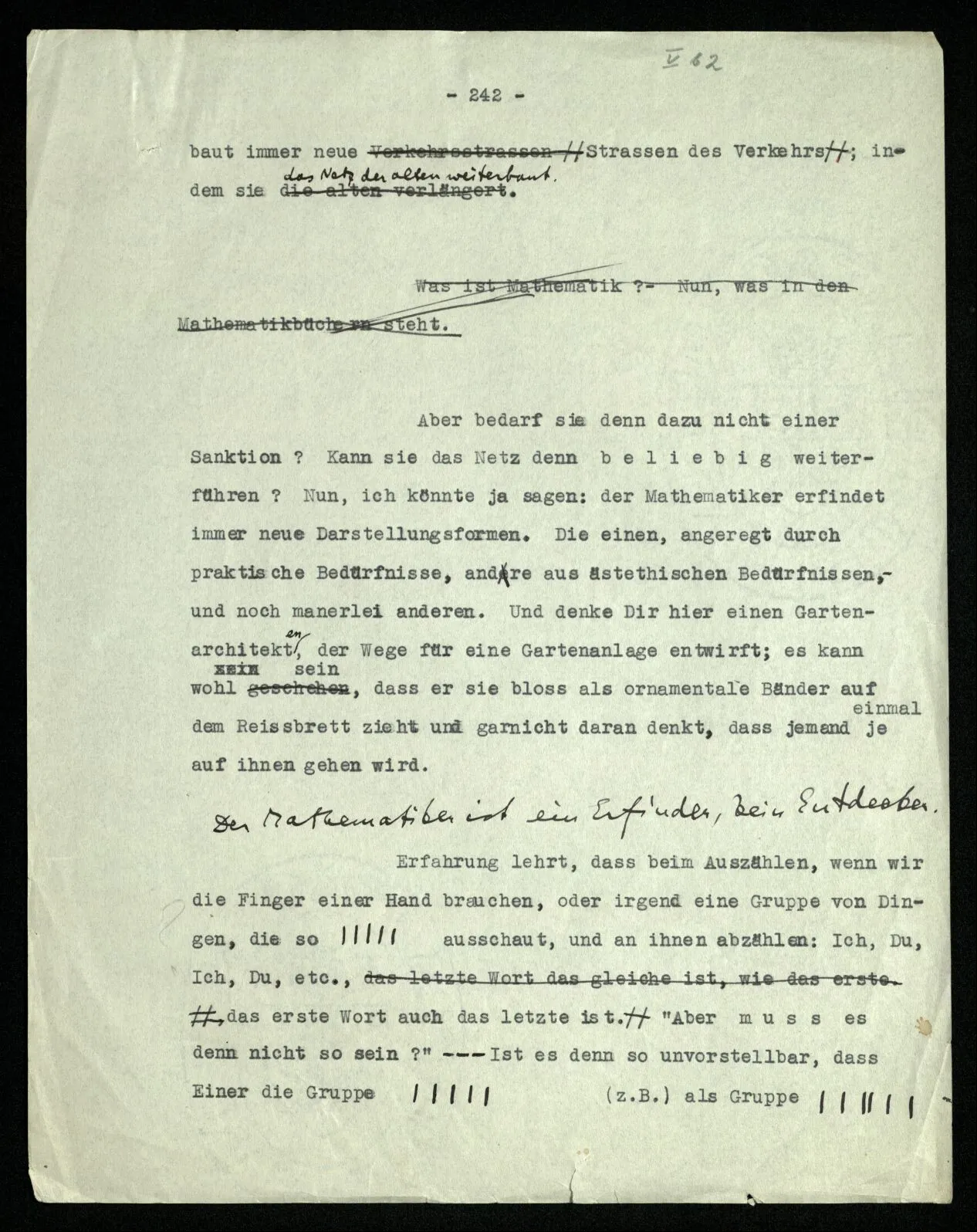 Erfahrung lehrt, daß beim Auszählen, wenn wir die Finger einer Hand brauchen, oder irgend eine Gruppe von Dingen, die so ❘ ❘ ❘ ❘ ❘ ausschaut, und an ihnen abzählen: Ich, Du, Ich, Du, etc. das erste Wort auch das letzte ist. “Aber muß es denn nicht so sein?” ‒ ‒ Ist es denn so unvorstellbar, daß Einer die Gruppe ❘ ❘ ❘ ❘ ❘ (z.B.) als Gruppe ❘ ❘ ❘❘ ❘ ❘ sieht, in der die beiden Mittelstriche verschmolzen sind und dementsprechend den Mittelstrich zweimal zählt. (Ja, das Gewöhnliche ist es nicht. –)