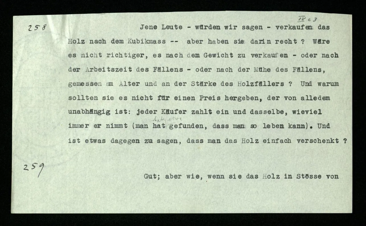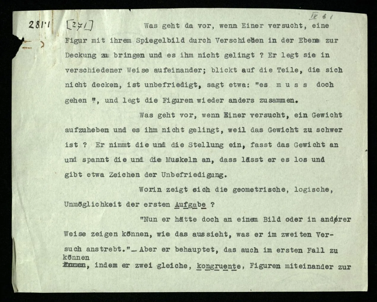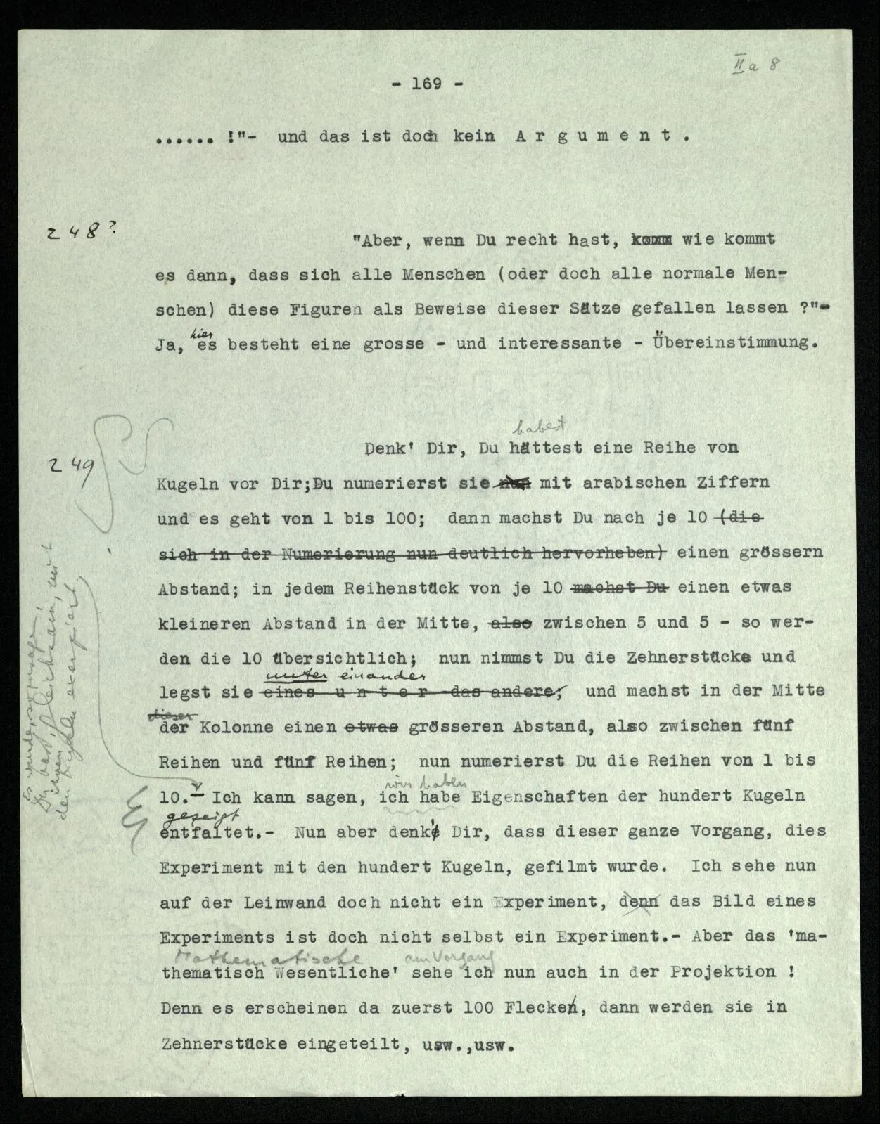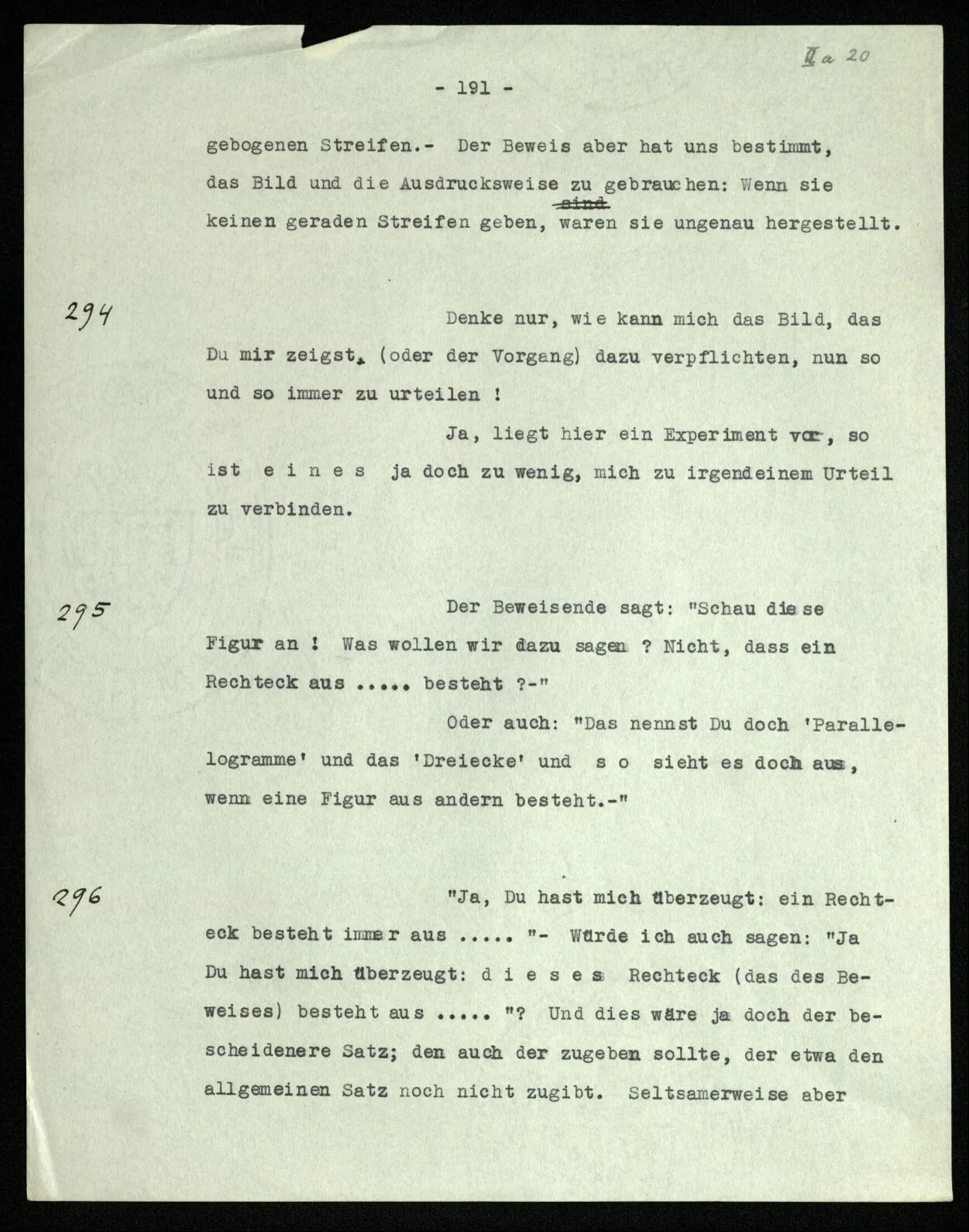 Erfahrung lehrt, daß beim Auszählen, wenn wir die Finger einer Hand brauchen, oder irgend eine Gruppe von Dingen, die so ❘ ❘ ❘ ❘ ❘ ausschaut, und an ihnen abzählen: Ich, Du, Ich, Du, etc. das erste Wort auch das letzte ist. “Aber muß es denn nicht so sein?” ‒ ‒ Ist es denn so unvorstellbar, daß Einer die Gruppe ❘ ❘ ❘ ❘ ❘ (z.B.) als Gruppe ❘ ❘ ❘❘ ❘ ❘ sieht, in der die beiden Mittelstriche verschmolzen sind und dementsprechend den Mittelstrich zweimal zählt. (Ja, das Gewöhnliche ist es nicht. –)