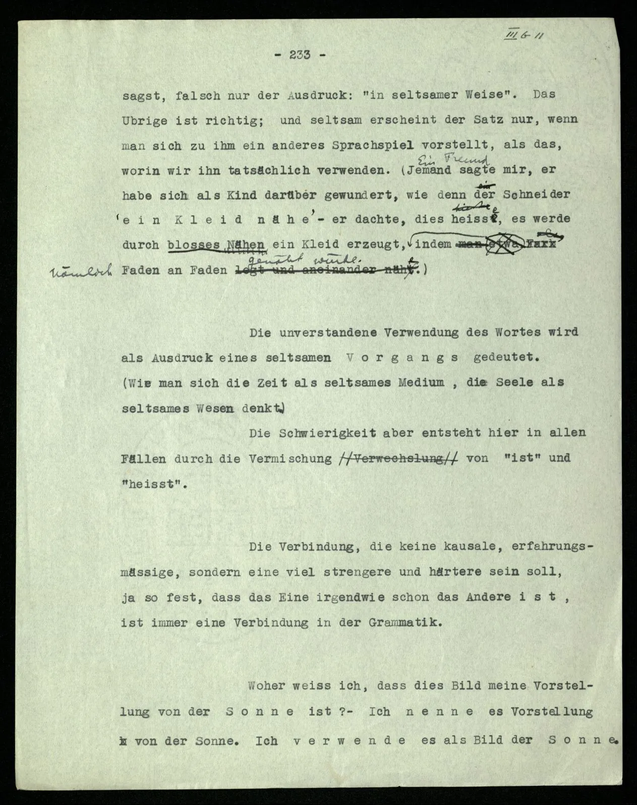Wenn aber der Gebrauch der Zeichen seine Bedeutung ist … Ist es nun nicht merkwürdig, daß ich sage, das Wort “ist” werde in zwei verschiedenen Bedeutungen (als ‘ε’ und ‘ = ’) gebraucht, und nicht sagen möchte, seine Bedeutung sei sein Gebrauch als Man möchte sagen, diese beiden Arten des Gebrauchs geben nicht eine Bedeutung; die Personalunion durch das gleiche Wort sei ein unwesentlicher Zufall.