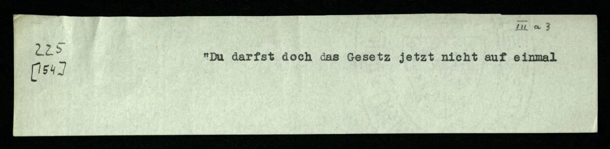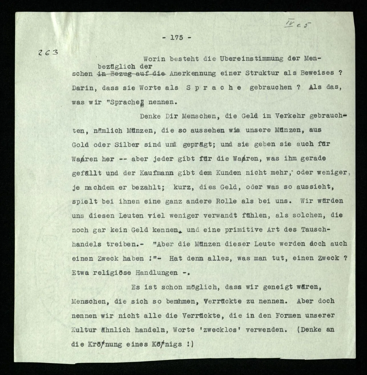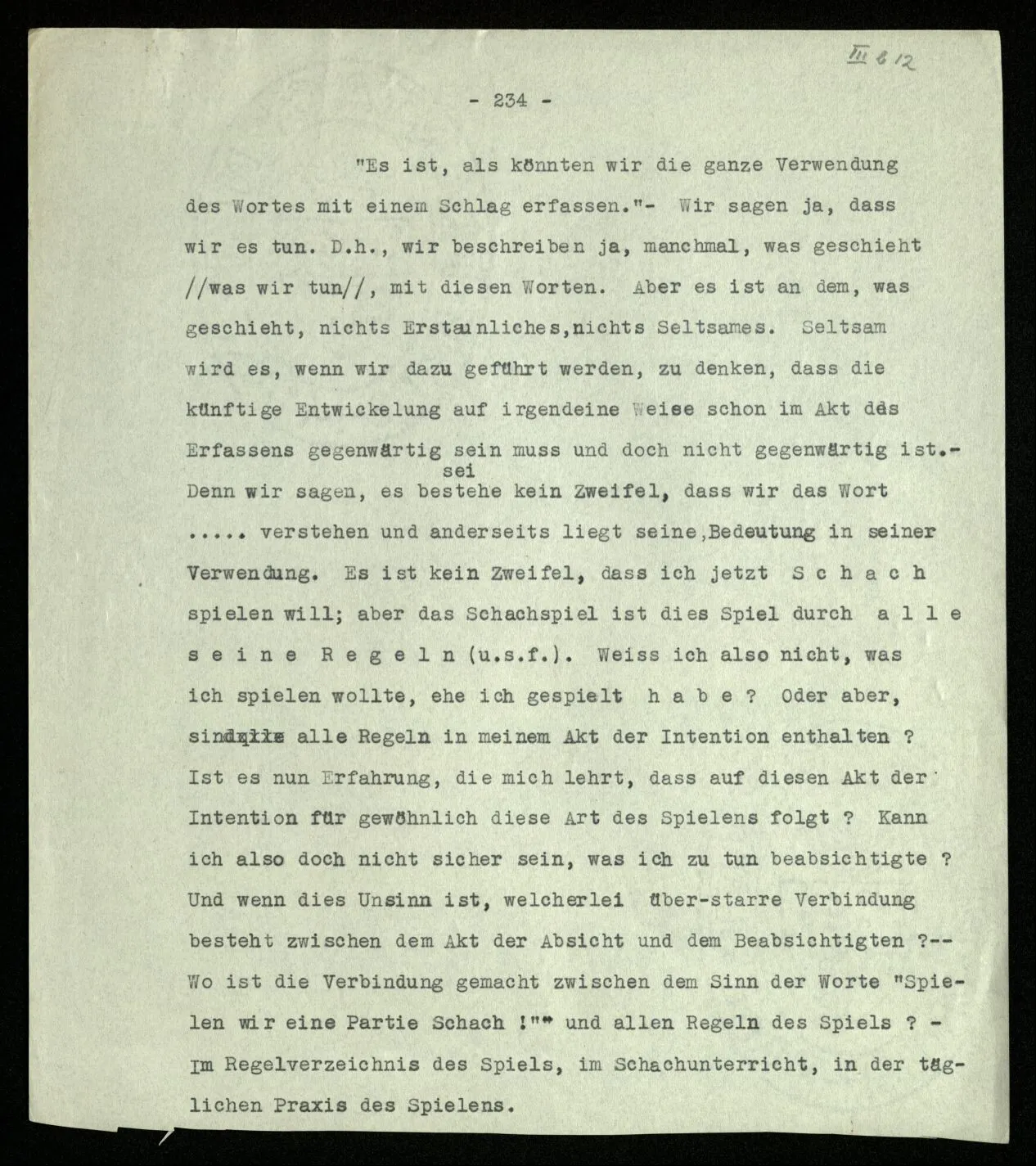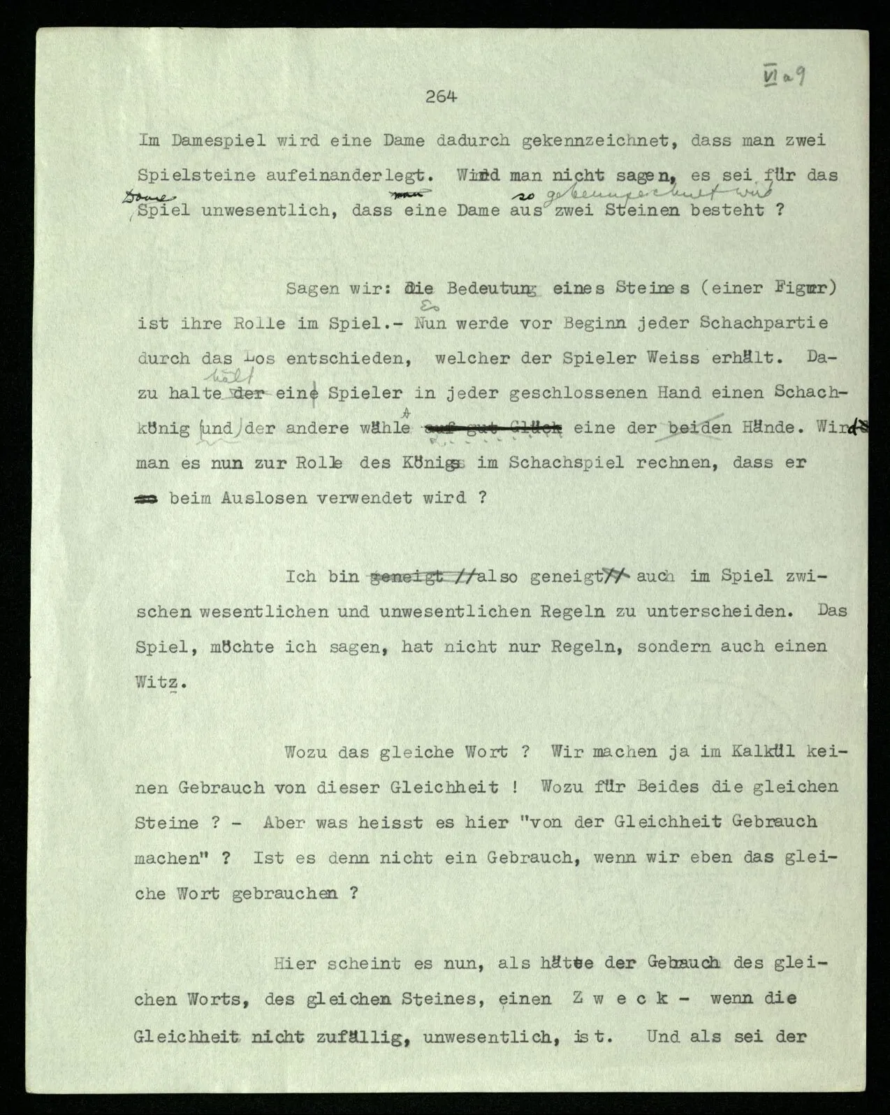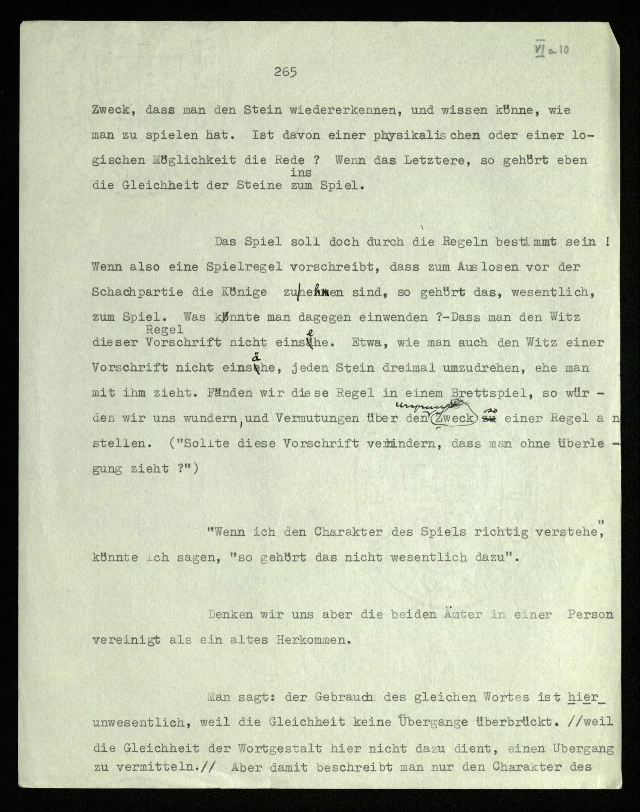 Das Spiel soll doch durch die Regeln bestimmt sein! Wenn also eine Spielregel vorschreibt, daß zum Auslosen vor der Schachpartie die Könige zu nehmen sind, so gehört das, wesentlich, zum Spiel. Was könnte man dagegen einwenden? Daß man den Witz dieser Vorschrift nicht einsehe. Etwa, wie man auch den Witz einer Vorschrift nicht einsähe, jeden Stein dreimal umzudrehen, ehe man mit ihm zieht. Fänden wir diese Regel in einem Brettspiel, so würden wir uns wundern, und Vermutungen über den Zweck so einer Regel anstellen. (“Sollte diese Vorschrift verhindern, daß man ohne Überlegung zieht?”)