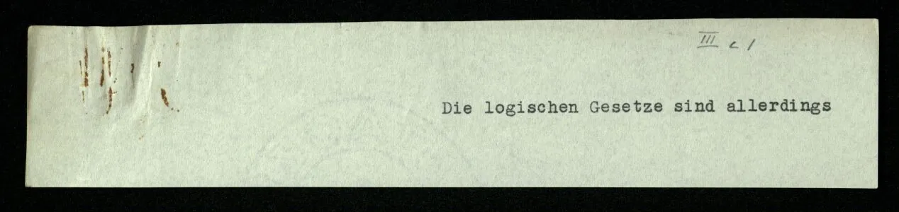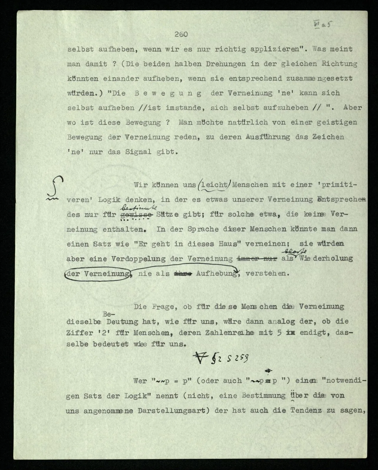 Wir können uns (leicht) Menschen mit einer ‘primitiveren’ Logik denken, in der es etwas unserer Verneinung Entsprechendes nur für gewisse Sätze gibt; für solche etwa, die keine Verneinung enthalten. In der Sprache dieser Menschen könnte man dann einen Satz wie “Er geht in dieses Haus” verneinen; sie würden aber eine Verdoppelung der Verneinung als bloße Wiederholung, nie als Aufhebung der Verneinung verstehen.