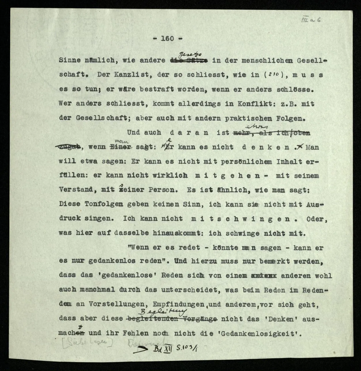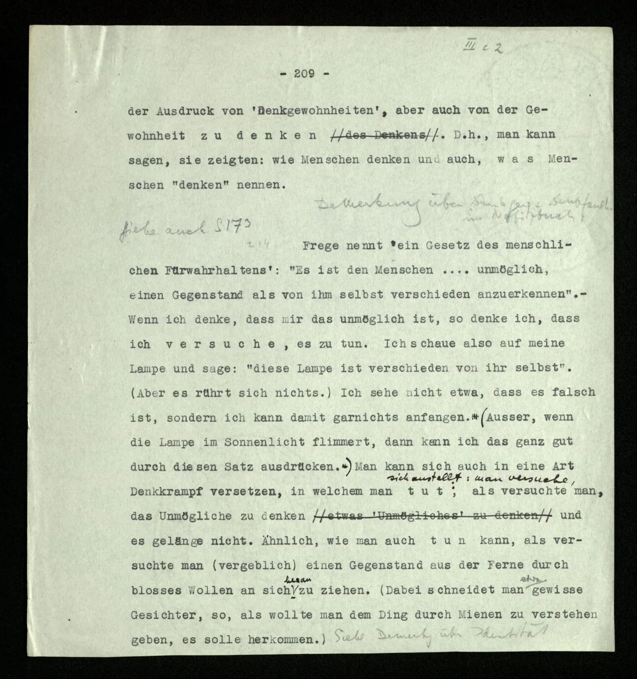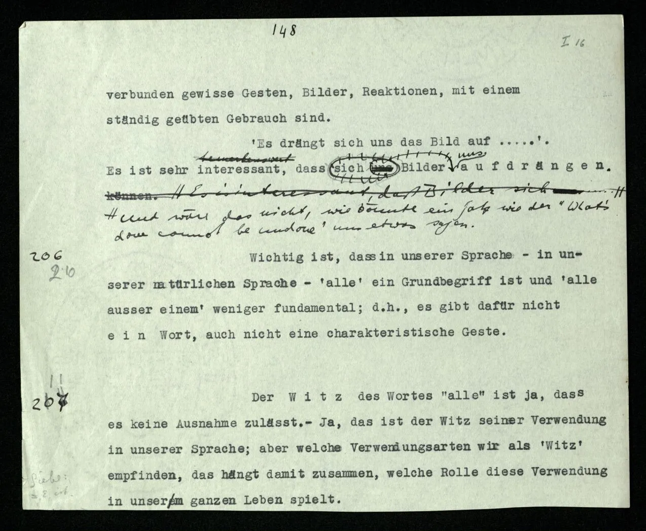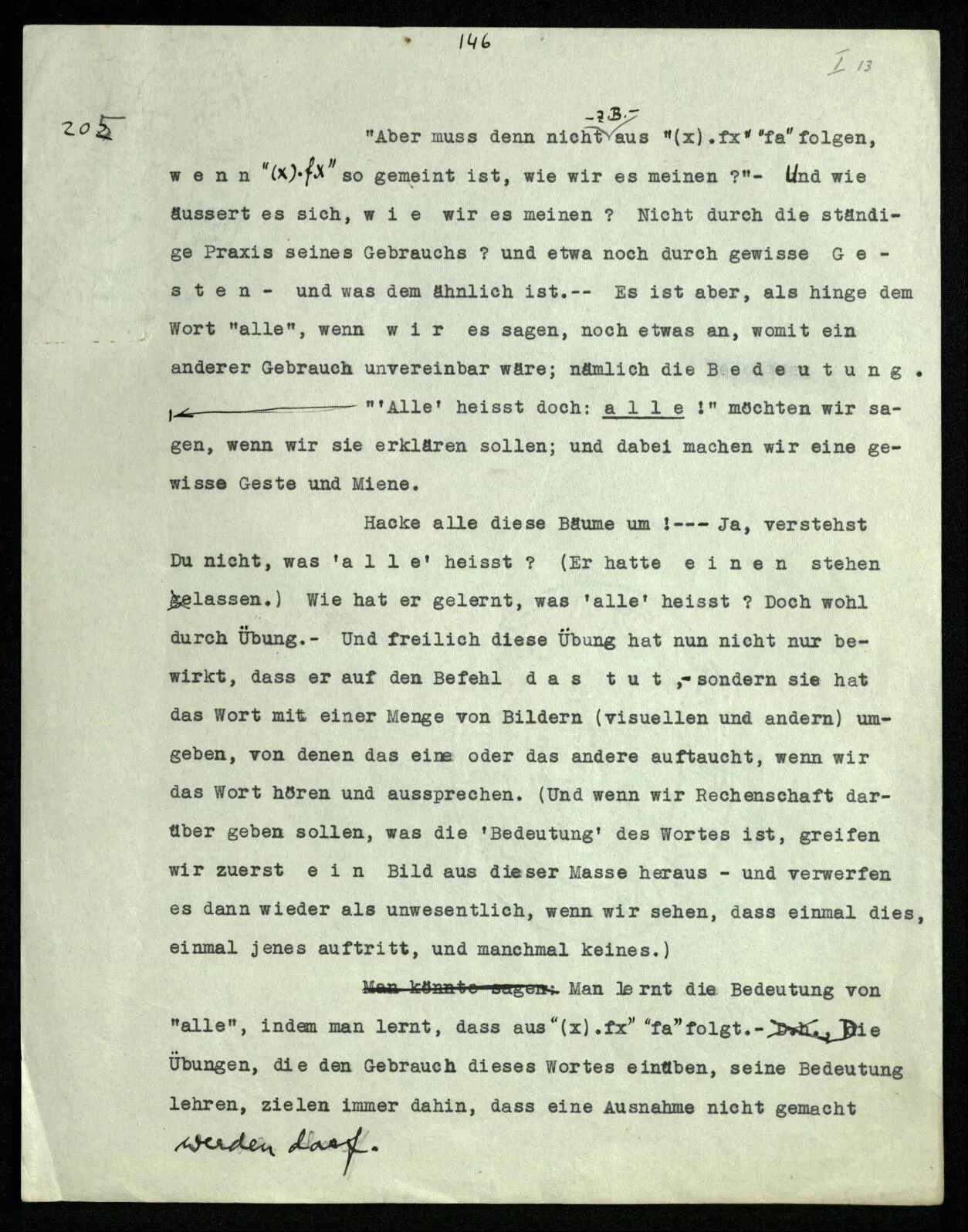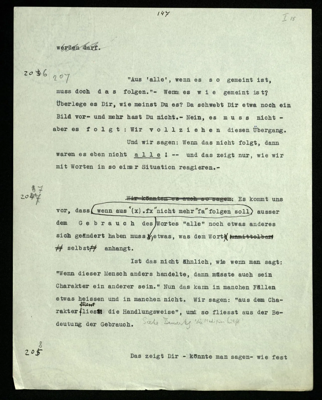 207 “Aus ‘alle’, wenn es so gemeint ist, muß doch das folgen.” – Wenn es wie gemeint ist? Überlege es Dir, wie meinst Du es? Da schwebt Dir etwa noch ein Bild vor – und mehr hast Du nicht. – Nein, es muß nicht – aber es folgt: Wir vollziehen diesen Übergang. Und wir sagen: Wenn das nicht folgt, dann waren es eben nicht alle! – – und das zeigt nur, wie wir mit Worten in so einer Situation reagieren. –