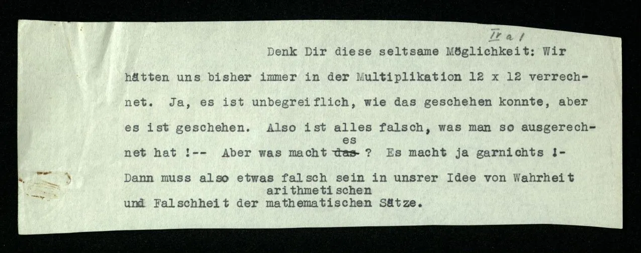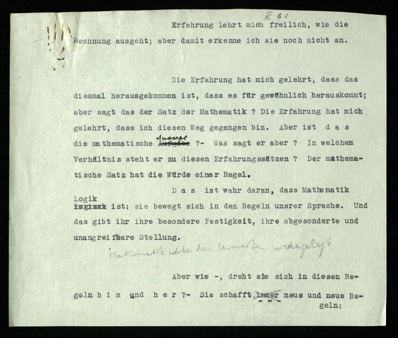 Die Erfahrung hat mich gelehrt, daß das diesmal herausgekommen ist, daß es für gewöhnlich herauskommt; aber sagt das der Satz der Mathematik? Die Erfahrung hat mich gelehrt, daß ich diesen Weg gegangen bin. Aber ist das die mathematische Aussage? – Was sagt er aber? In welchem Verhältnis steht er zu diesen Erfahrungssätzen? Der mathematische Satz hat die Würde einer Regel. Das ist wahr daran, daß Mathematik Logik ist: sie bewegt sich in den Regeln unsrer Sprache. Und das gibt ihr ihre besondere Festigkeit, ihre abgesonderte und unangreifbare Stellung.