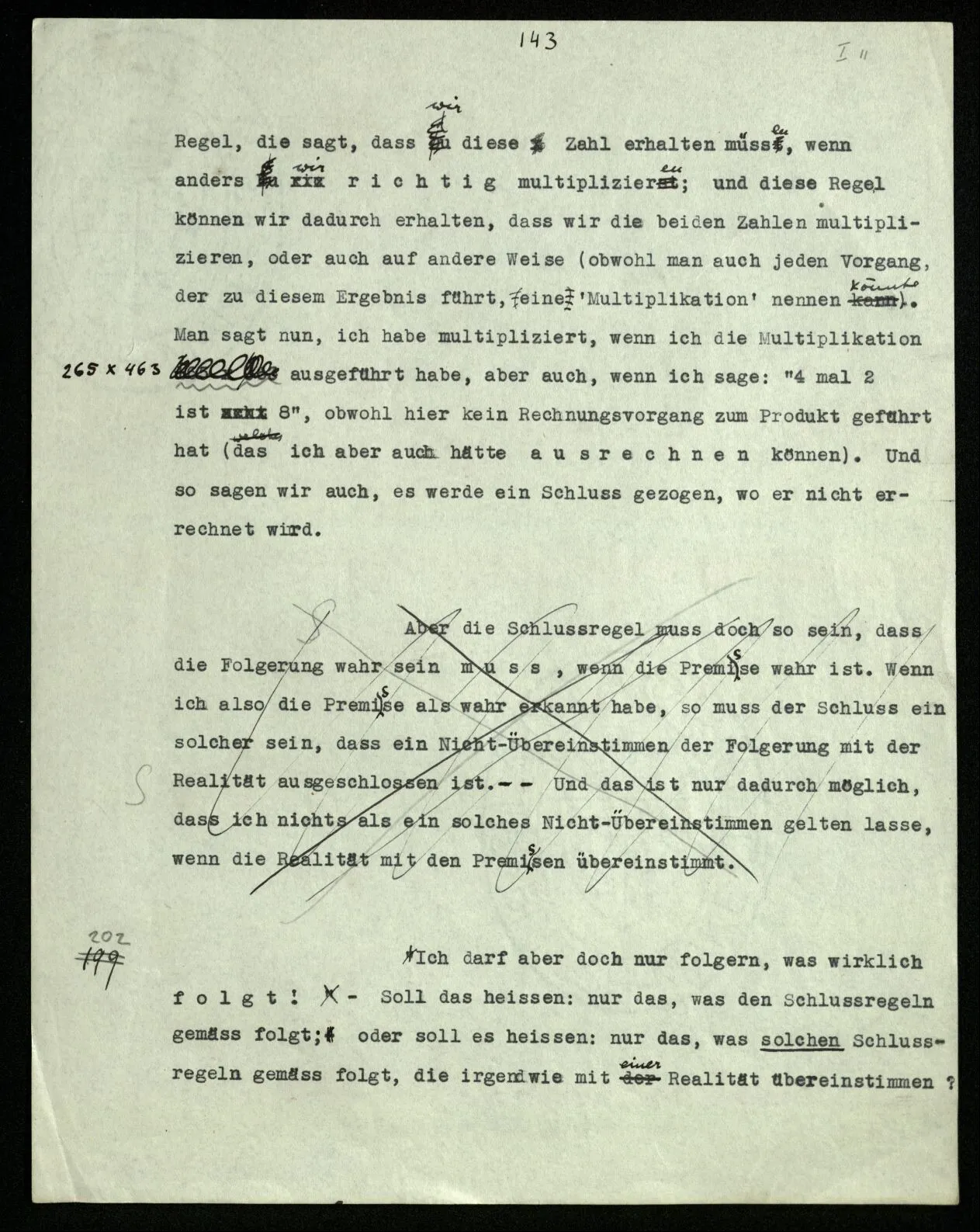 207 Was heißt es nun, daß sich ein Satz aus einem andern, vermittels einer Regel, ableiten läßt? Läßt sich nicht alles aus allem vermittels irgend einer Regel – ja nach jeder Regel mit entsprechender Deutung – ableiten? Was heißt es, wenn ich z.B. sage: diese Zahl läßt sich durch die Multiplikation jener beiden erhalten? Dies ist eine Regel, die sagt, daß wir diese Zahl erhalten müssen, wenn anders wir richtig multiplizieren; und diese Regel können wir dadurch erhalten, daß wir die beiden Zahlen multiplizieren, oder auch auf andere Weise (obwohl man auch jeden Vorgang, der zu diesem Ergebnis führt, eine ‘Multiplikation’ nennen könnte). Man sagt nun, ich habe multipliziert, wenn ich die Multiplikation 265 × 463 ausgeführt habe, aber auch, wenn ich sage: “4 mal 2 ist 8”, obwohl hier kein Rechnungsvorgang zum Produkt geführt hat (das ich aber auch hätte ausrechnen können). Und so sagen wir auch, es werde ein Schluß gezogen, wo er nicht errechnet wird.