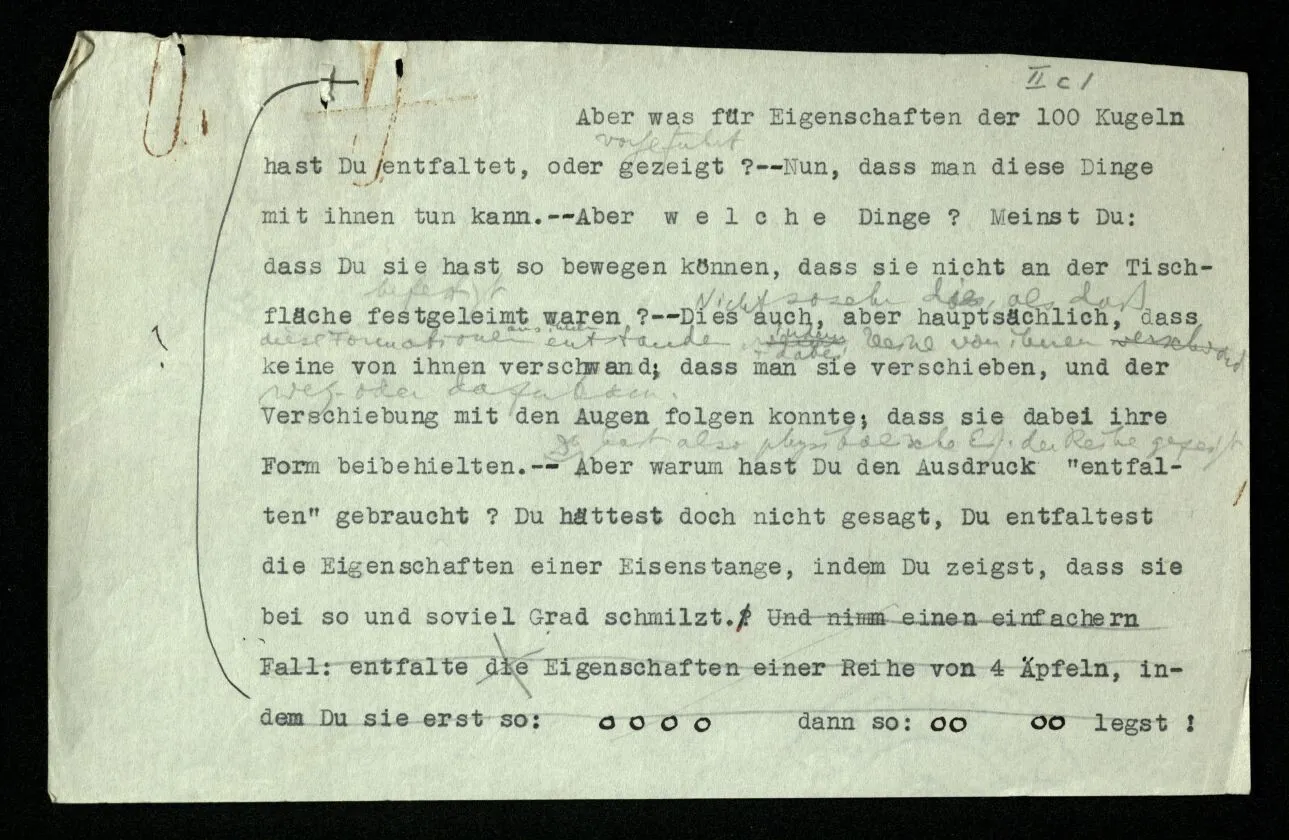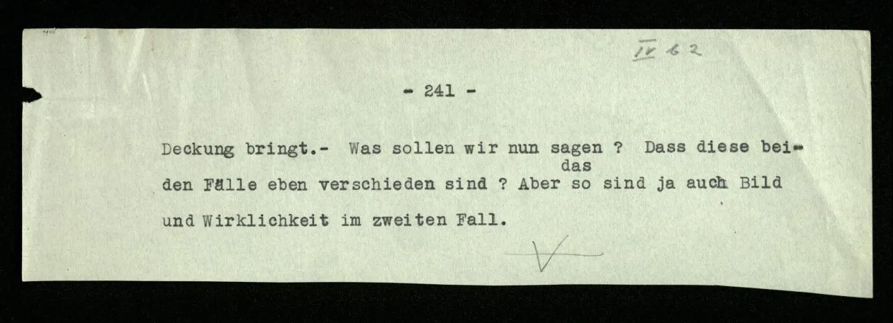 Aber wie kann ich entscheiden, welches ein wesentlicher und welches ein unwesentlicher, zufälliger Zug der Notation ist? Liegt denn eine Realität hinter der Notation, nach der sich ihre Grammatik richtet? Denken wir an einen ähnlichen Fall im Spiel: Im Damespiel wird eine Dame dadurch gekennzeichnet, daß man zwei Spielsteine aufeinanderlegt. Wird man nun nicht sagen, es sei für das Spiel unwesentlich, daß eine Dame aus zwei Steinen besteht?
