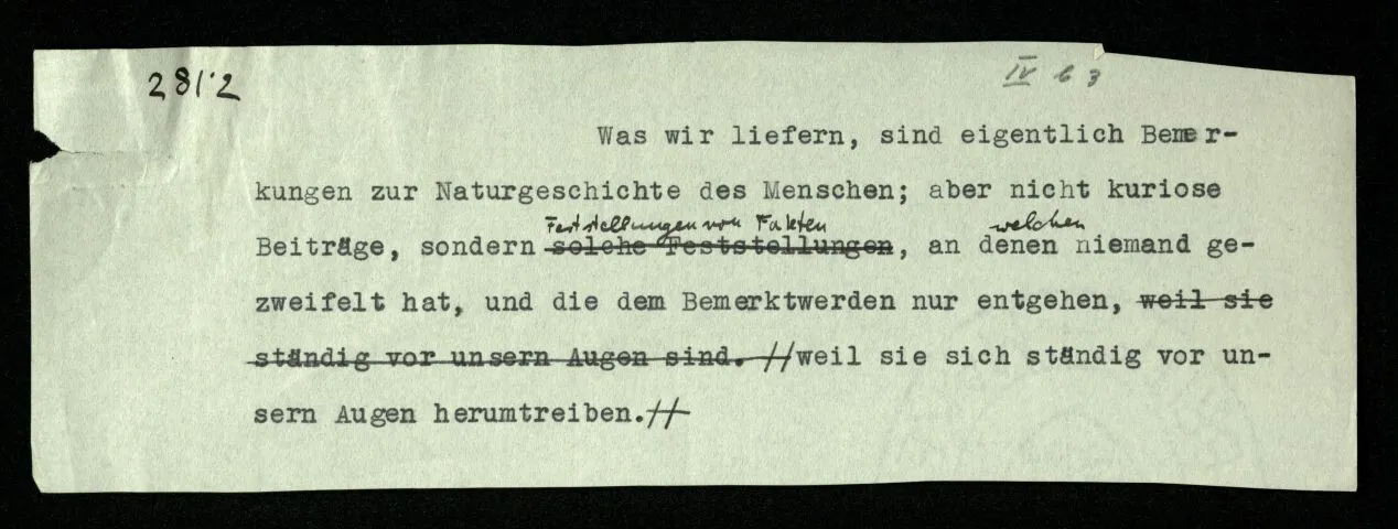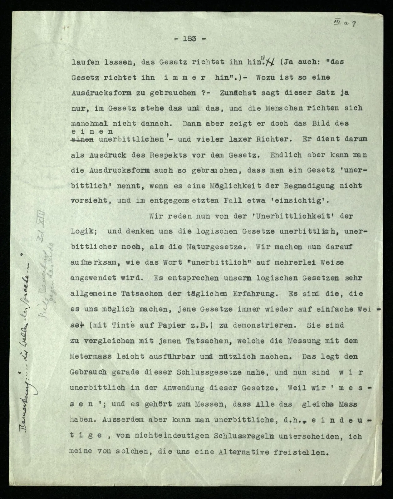 Wer “~~p = p” (oder auch “~~p ≡ p”) einen “notwendigen Satz der Logik” nennt (nicht, eine Bestimmung über die von uns angenommene Darstellungsart) der hat auch die Tendenz zu sagen, dieser Satz gehe aus der Bedeutung der Verneinung hervor. Wenn in einer dialektischen Redeweise die doppelte Verneinung als Verneinung gebraucht wird, wie in “er hat nirgends nichts gefunden”, so sind wir geneigt zu sagen: eigentlich heiße das, er habe überall etwas gefunden. Überlegen wir, was dieses “eigentlich” heißt! –