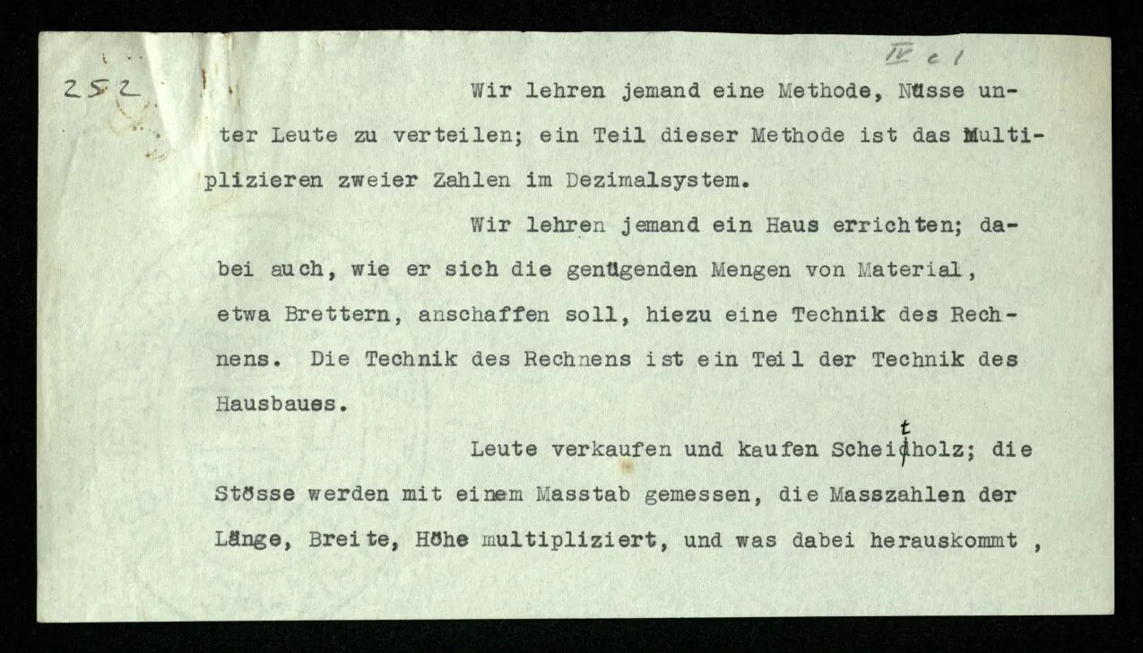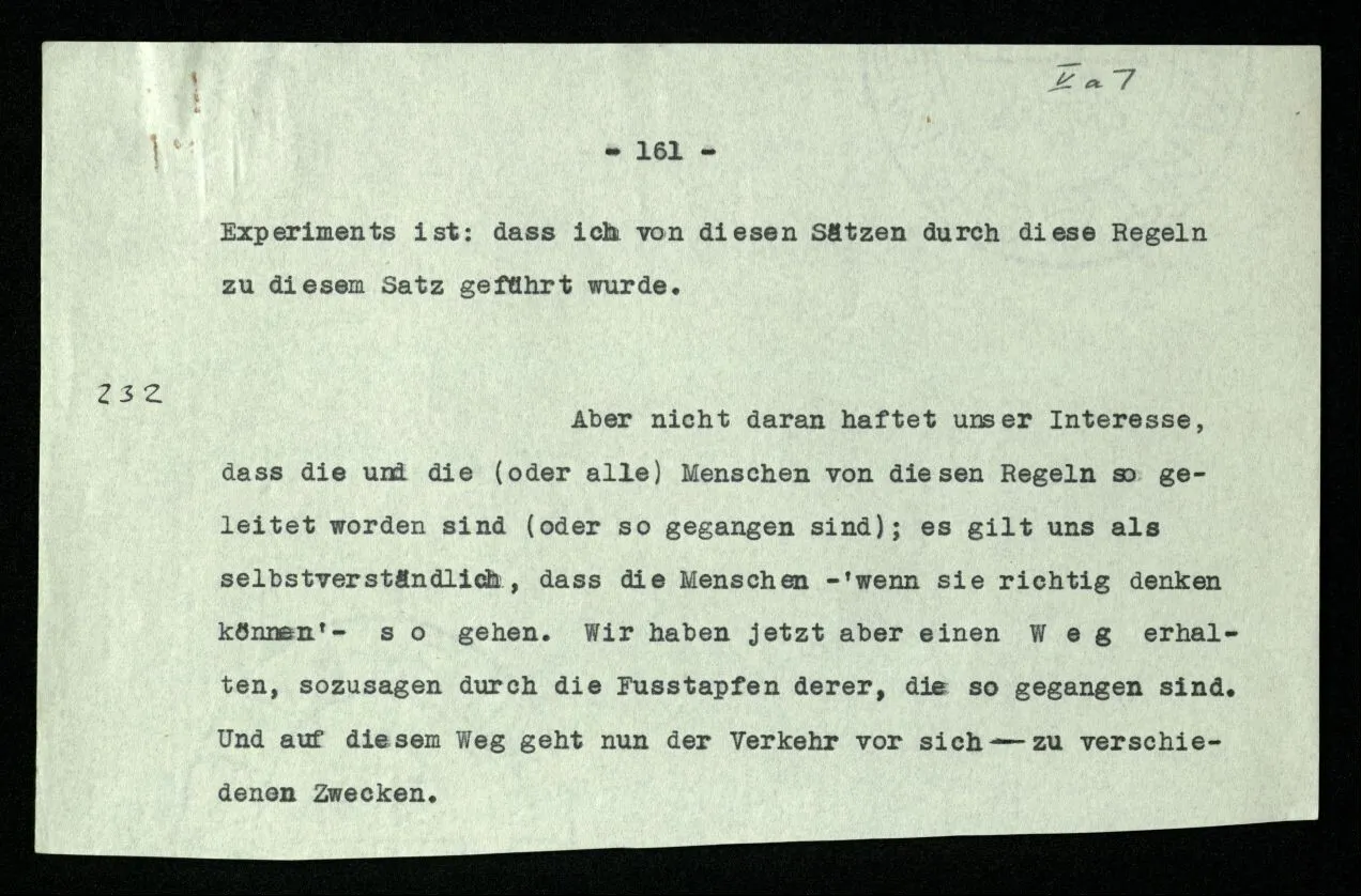 232 Aber nicht daran haftet unser Interesse, daß die und die (oder alle) Menschen von diesen Regeln so geleitet worden sind (oder so gegangen sind); es gilt uns als selbstverständlich, daß die Menschen – ‘wenn sie richtig denken können’ – so gehen. Wir haben jetzt aber einen Weg erhalten, sozusagen durch die Fußstapfen derer, die so gegangen sind. Und auf diesem Weg geht nun der Verkehr vor sich – zu verschiedenen Zwecken.