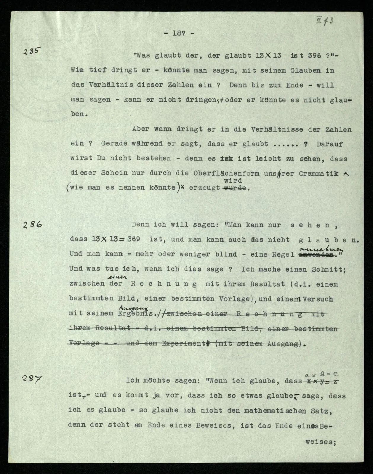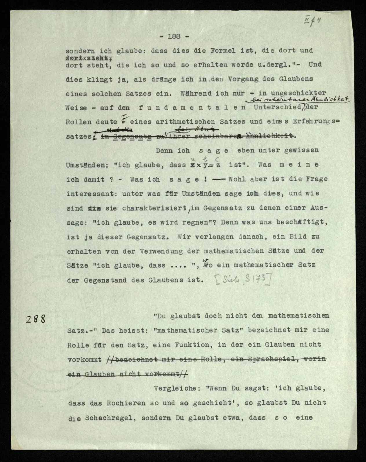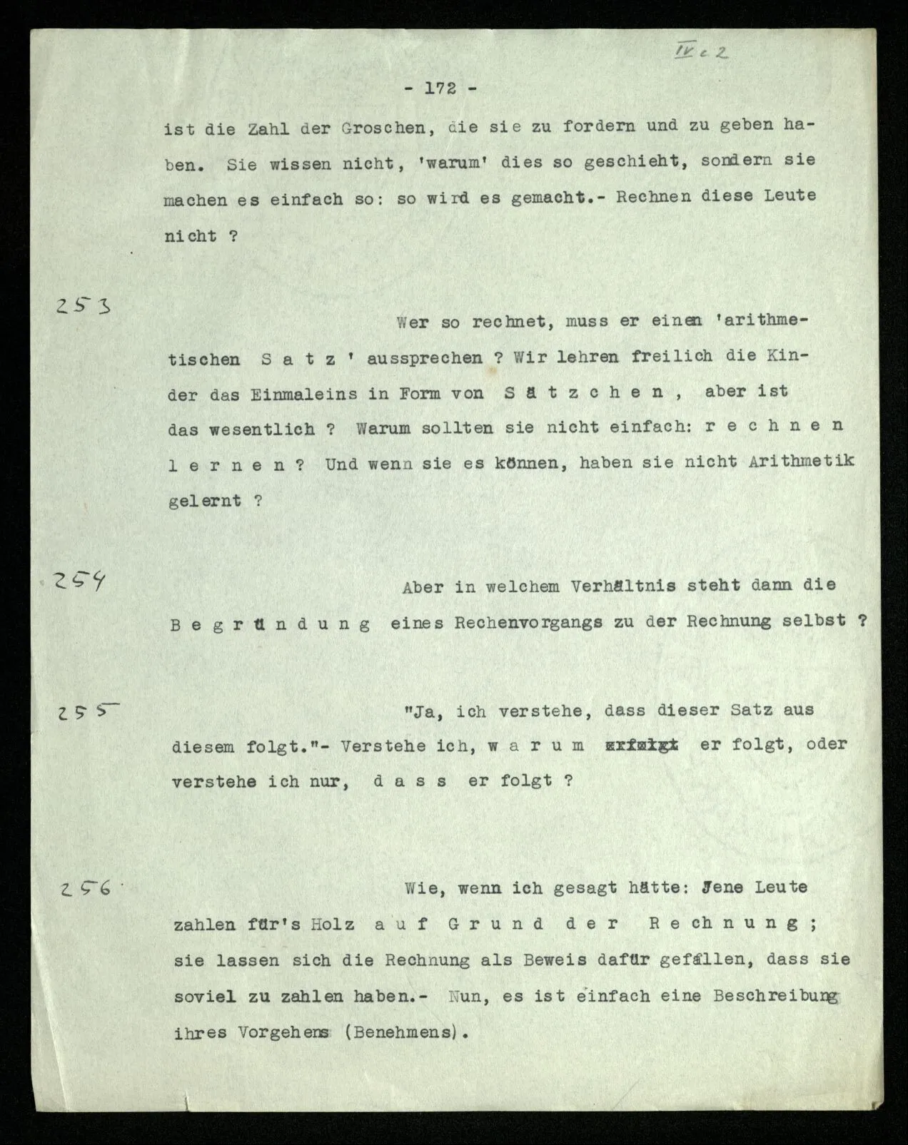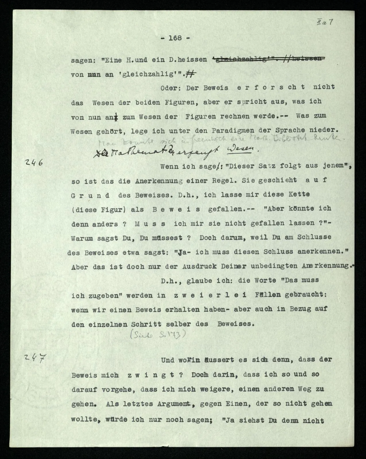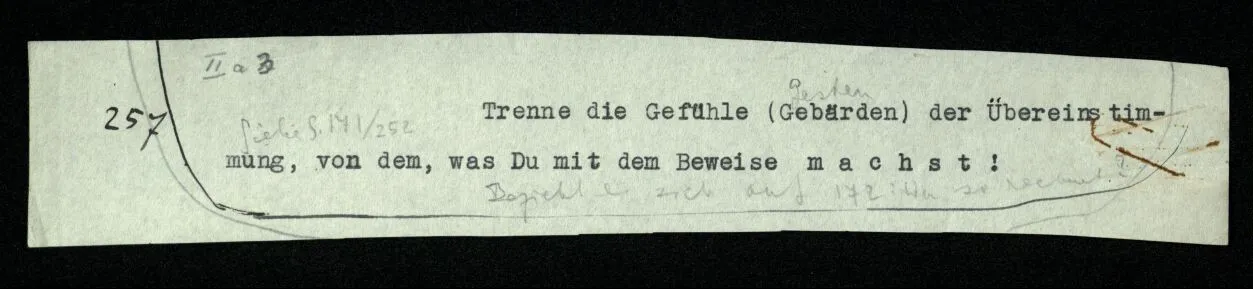 257 [→ Siehe S. 171/252] Trenne die Gefühle (Gebärden) der Übereinstimmung, von dem, was Du mit dem Beweise machst! Bezieht es sich auf [→ 172: Wer so rechnet]?