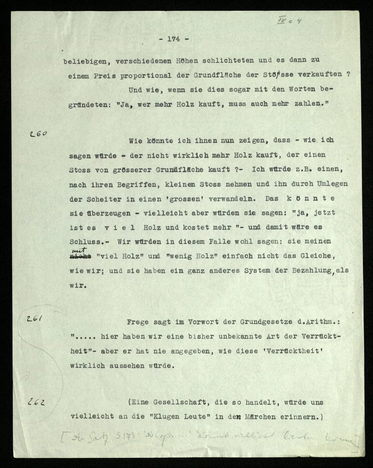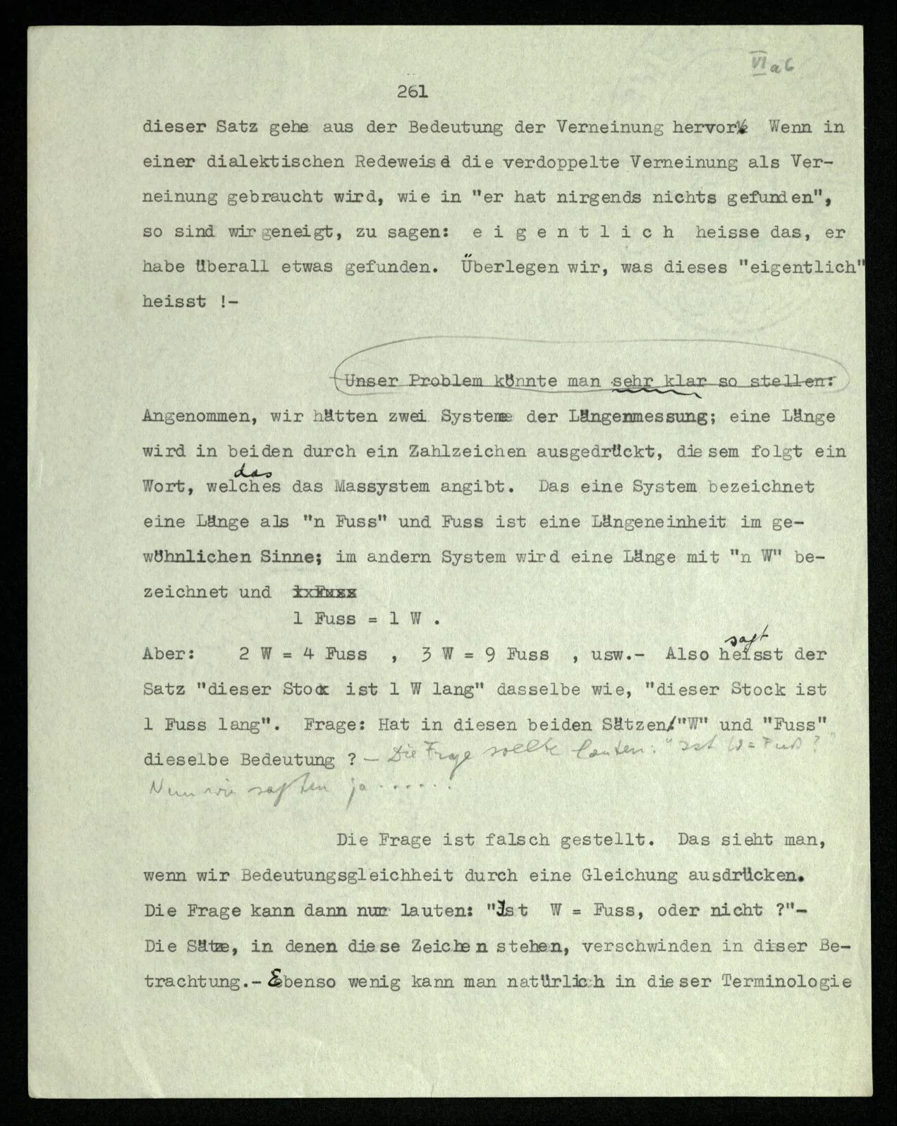 Aber: 2 W = 4 Fuß, 3 W = 9 Fuß, usw. – Also heißt der Satz “dieser Stock ist 1 W lang” dasselbe wie, “dieser Stock ist 1 Fuß lang”. Frage: Hat in diesen beiden Sätzen “W” und “Fuß” dieselbe Bedeutung? Die Frage sollte lauten: “Ist W = Fuß?” Nun wir sagten ja ‥‥‥