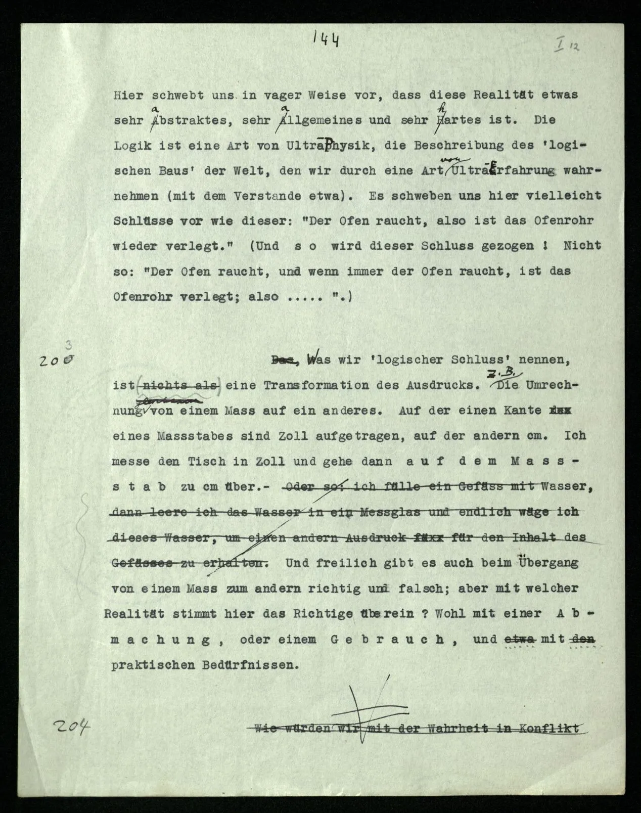 202 Ich darf aber doch nur folgern, was wirklich folgt! – Soll das heißen: nur das, was den Schlußregeln gemäß folgt; oder soll es heißen: nur das, was solchen Schlußregeln gemäß folgt, die irgendwie mit einer Realität übereinstimmen? Hier schwebt uns in vager Weise vor, daß diese Realität etwas sehr abstraktes, sehr allgemeines und sehr hartes ist. Die Logik ist eine Art von Ultra-Physik, die Beschreibung des ‘logischen Baus’ der Welt, den wir durch eine Art von Ultra-Erfahrung wahrnehmen (mit dem Verstande etwa). Es schweben uns hier vielleicht Schlüsse vor wie dieser: “Der Ofen raucht, also ist das Ofenrohr wieder verlegt.” (Und so wird dieser Schluß gezogen! Nicht so: “Der Ofen raucht, und wenn immer der Ofen raucht, ist das Ofenrohr verlegt; also ‥‥․”.)