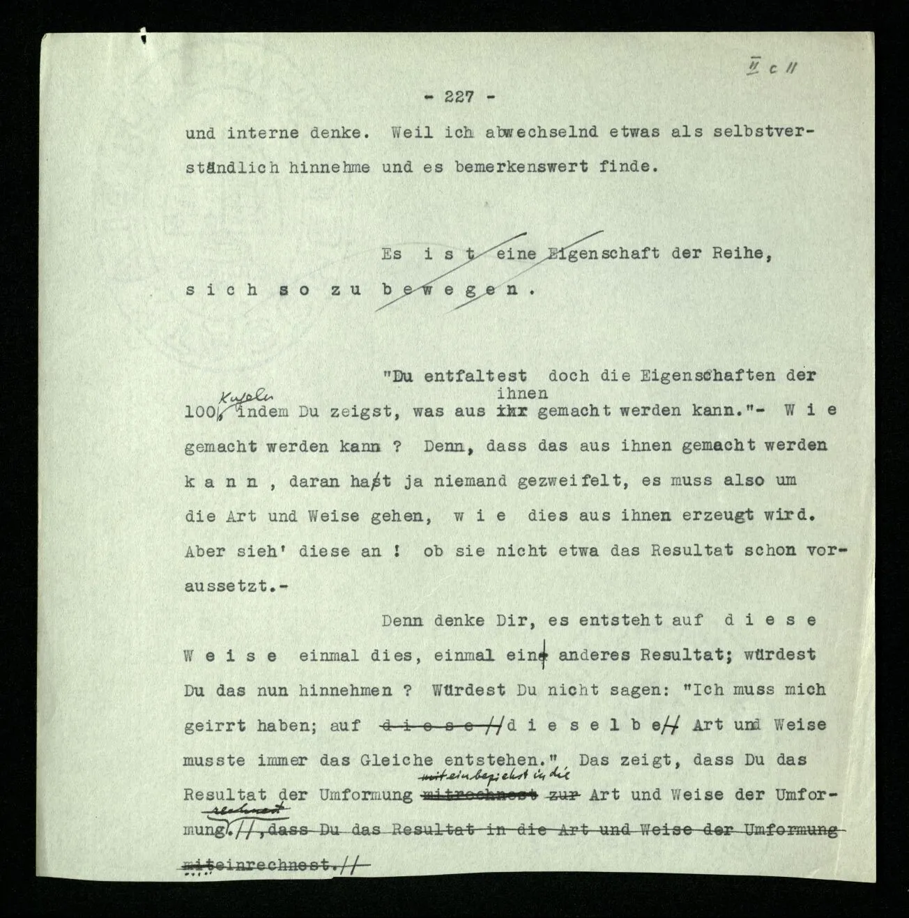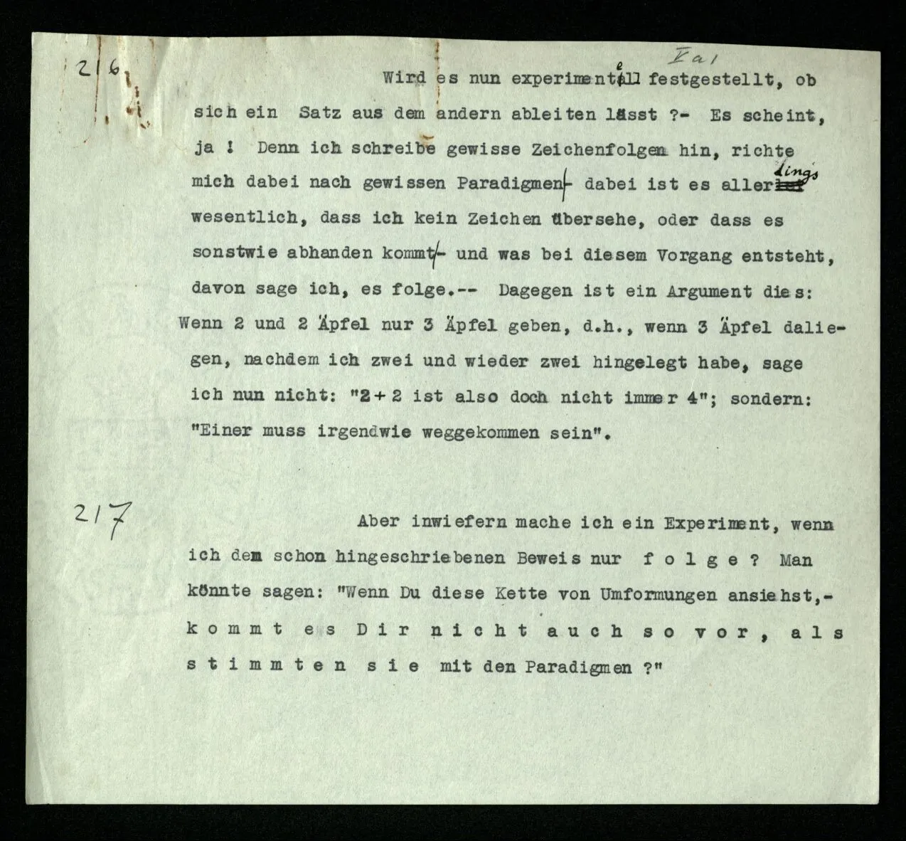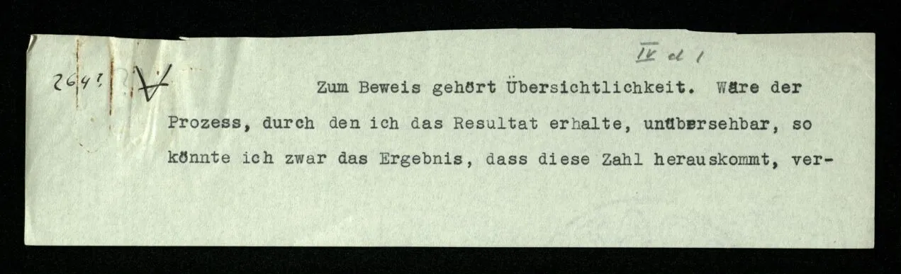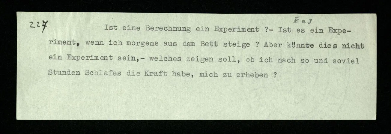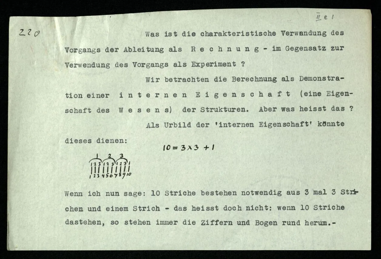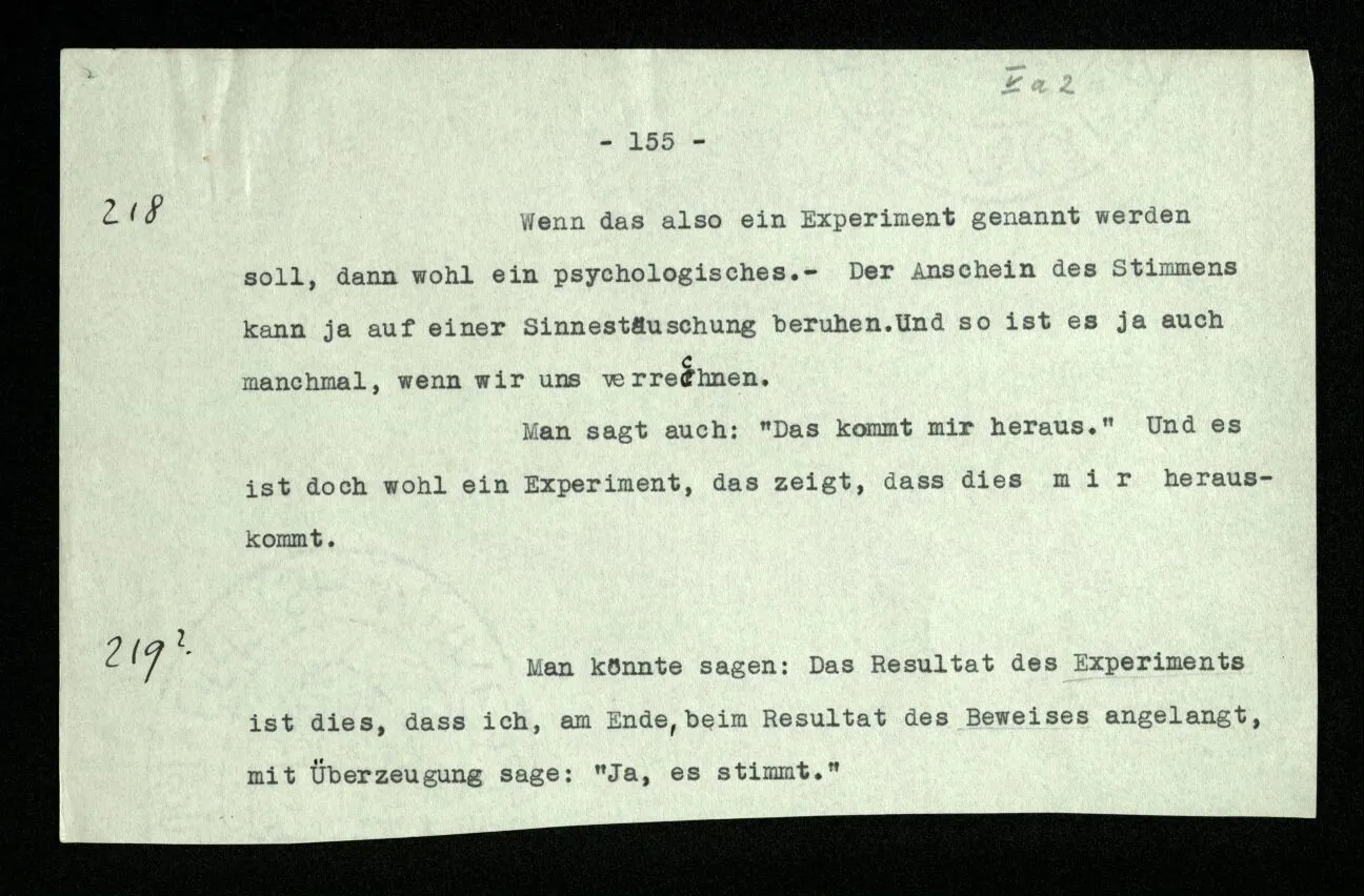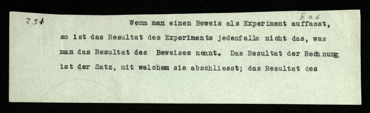 231 Wenn man einen Beweis als Experiment auffaßt, so ist das Resultat des Experiments jedenfalls nicht das, was man das Resultat des Beweises nennt. Das Resultat der Rechnung ist der Satz, mit welchem sie abschließt; das Resultat des Experiments ist: daß ich von diesen Sätzen durch diese Regeln zu diesem Satz geführt wurde.