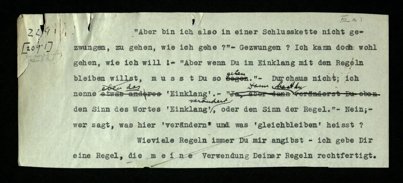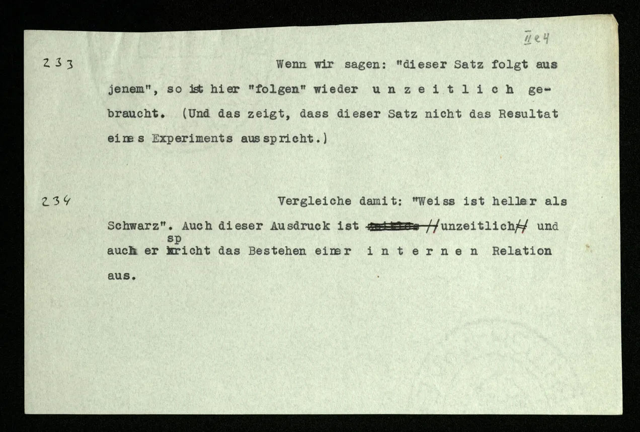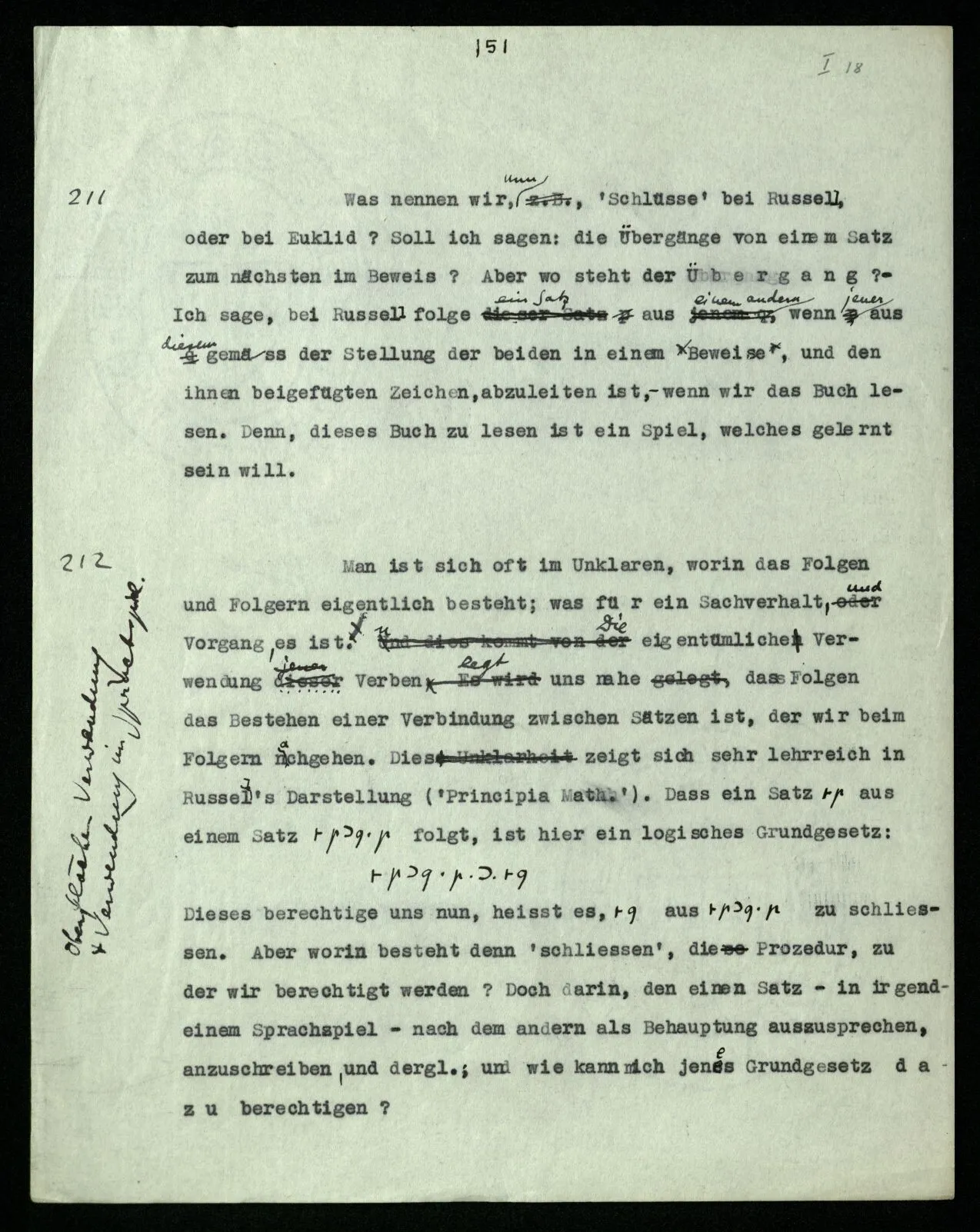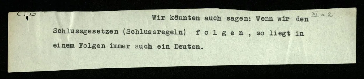 Russell will doch sagen: “So werde ich schließen und so ist es richtig.” Er will uns also einmal mitteilen, wie er schließen will: das geschieht durch eine Regel des Schließens. Wie lautet sie? Daß dieser Satz jenen impliziert? — – – Doch wohl, daß in den Beweisen dieses Buchs ein solcher Satz nach einem solchen stehen soll. – Aber es soll ja ein logisches Grundgesetz sein, daß es richtig ist, so zu schließen! – Dann müßte das Grundgesetz lauten: “Es ist richtig vom ‥‥․ auf ‥‥․ zu schließen”; und dieses Grundgesetz sollte nun wohl einleuchten – – aber dann wird uns eben die Regel selbst als richtig, oder berechtigt, einleuchten. “Aber diese Regel handelt doch von Sätzen in einem Buch, und das gehört doch nicht in die Logik!” – Ganz richtig; die Regel ist wirklich nur eine Mitteilung, daß in diesem Buche nur dieser Übergang von einem Satz zum andern gebraucht wird (gleichsam eine Mitteilung aus dem Index) denn die Richtigkeit des Übergangs muß an Ort und Stelle einleuchten; und der Ausdruck des ‘logischen Grundgesetzes’ ist dann die Folge der Sätze selbst.