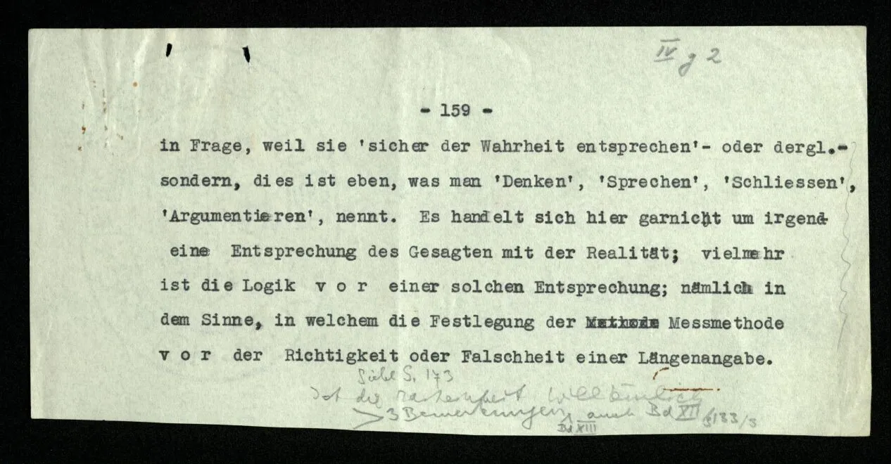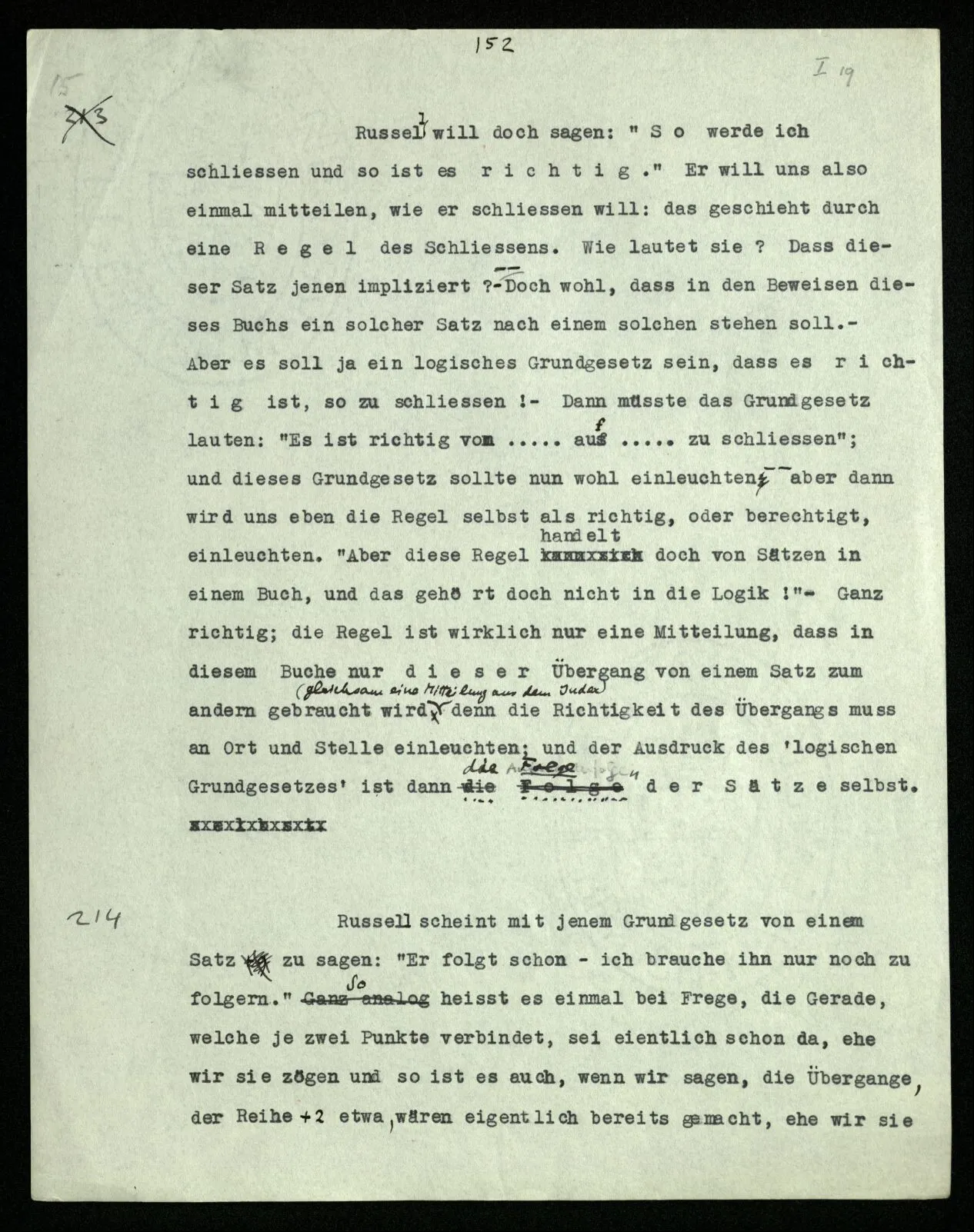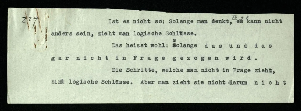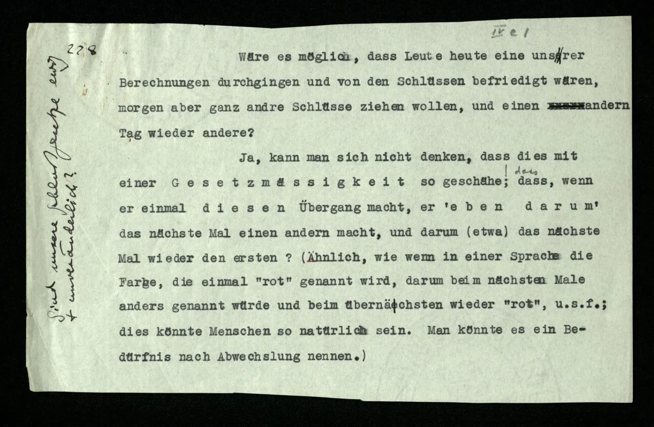 Russell will doch sagen: “So werde ich schließen und so ist es richtig.” Er will uns also einmal mitteilen, wie er schließen will: das geschieht durch eine Regel des Schließens. Wie lautet sie? Daß dieser Satz jenen impliziert? — – – Doch wohl, daß in den Beweisen dieses Buchs ein solcher Satz nach einem solchen stehen soll. – Aber es soll ja ein logisches Grundgesetz sein, daß es richtig ist, so zu schließen! – Dann müßte das Grundgesetz lauten: “Es ist richtig vom ‥‥․ auf ‥‥․ zu schließen”; und dieses Grundgesetz sollte nun wohl einleuchten – – aber dann wird uns eben die Regel selbst als richtig, oder berechtigt, einleuchten. “Aber diese Regel handelt doch von Sätzen in einem Buch, und das gehört doch nicht in die Logik!” – Ganz richtig; die Regel ist wirklich nur eine Mitteilung, daß in diesem Buche nur dieser Übergang von einem Satz zum andern gebraucht wird (gleichsam eine Mitteilung aus dem Index) denn die Richtigkeit des Übergangs muß an Ort und Stelle einleuchten; und der Ausdruck des ‘logischen Grundgesetzes’ ist dann die Folge der Sätze selbst.