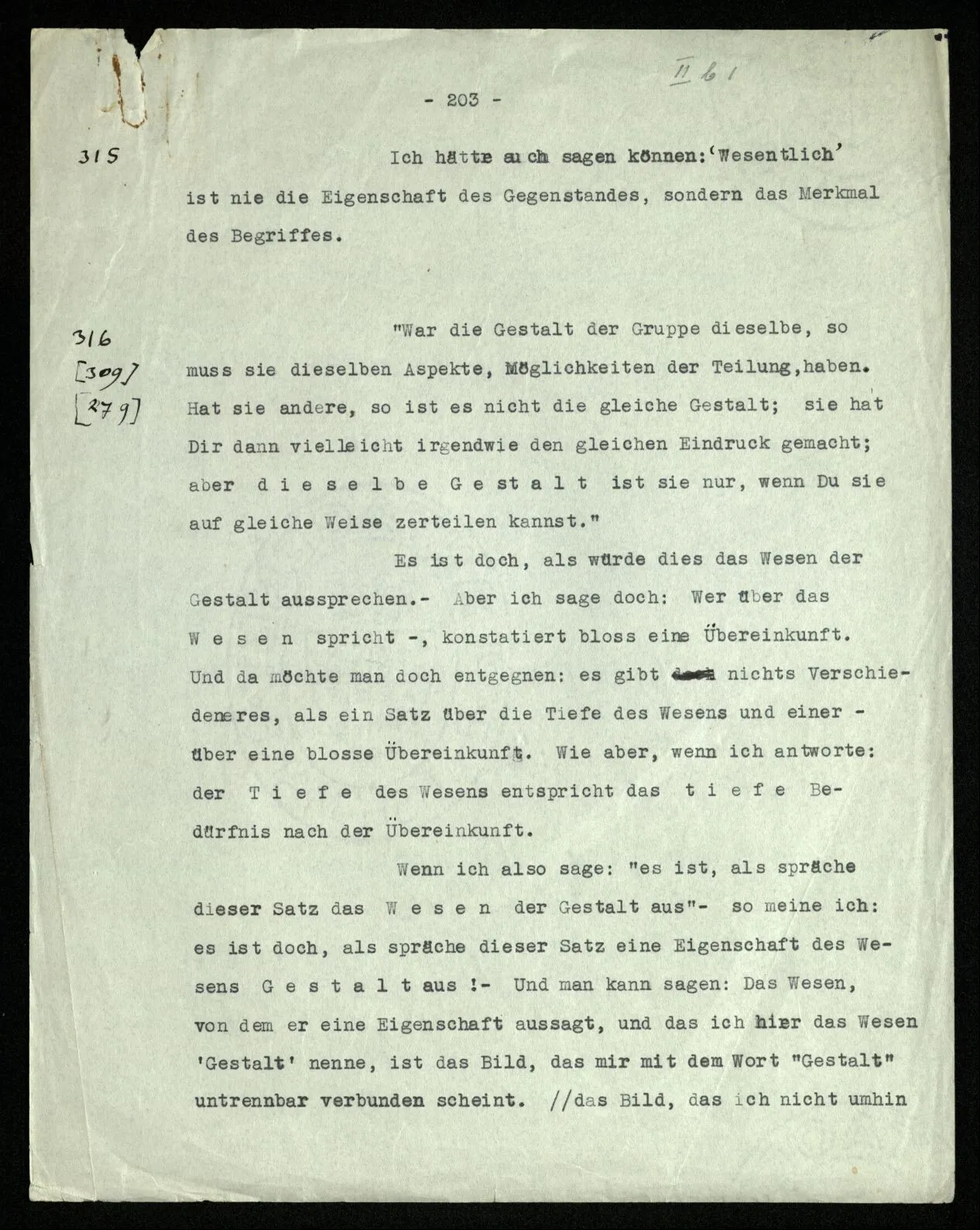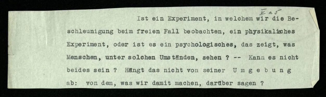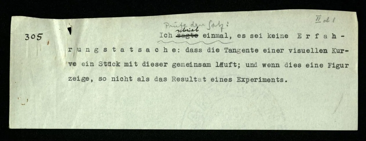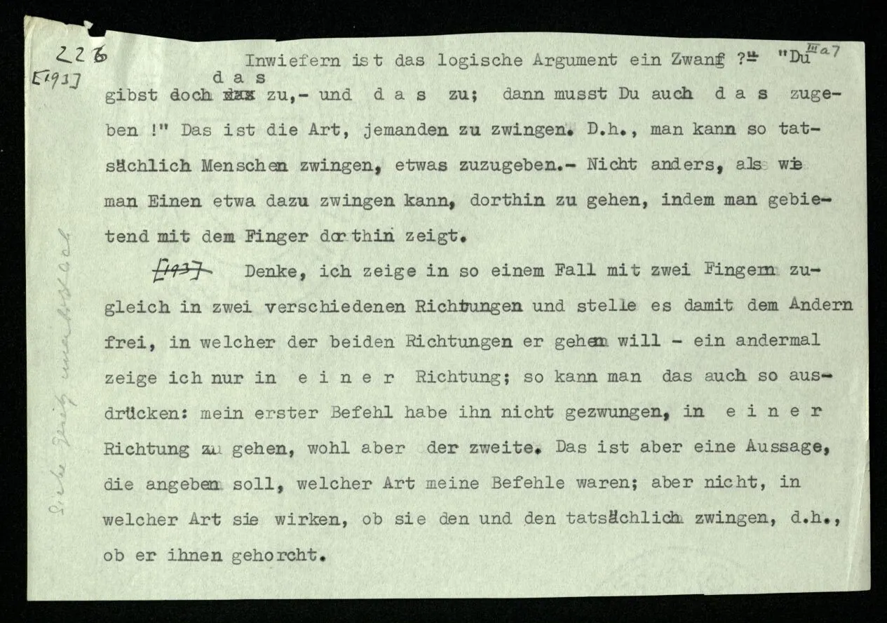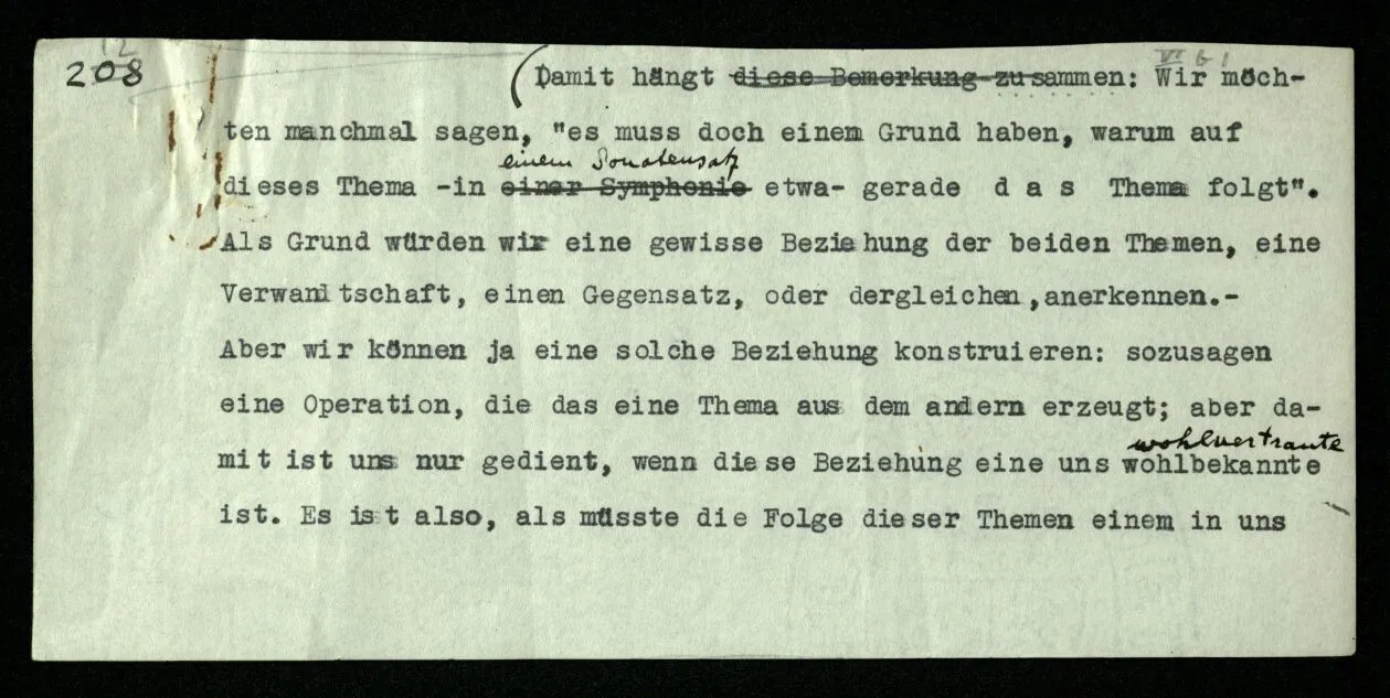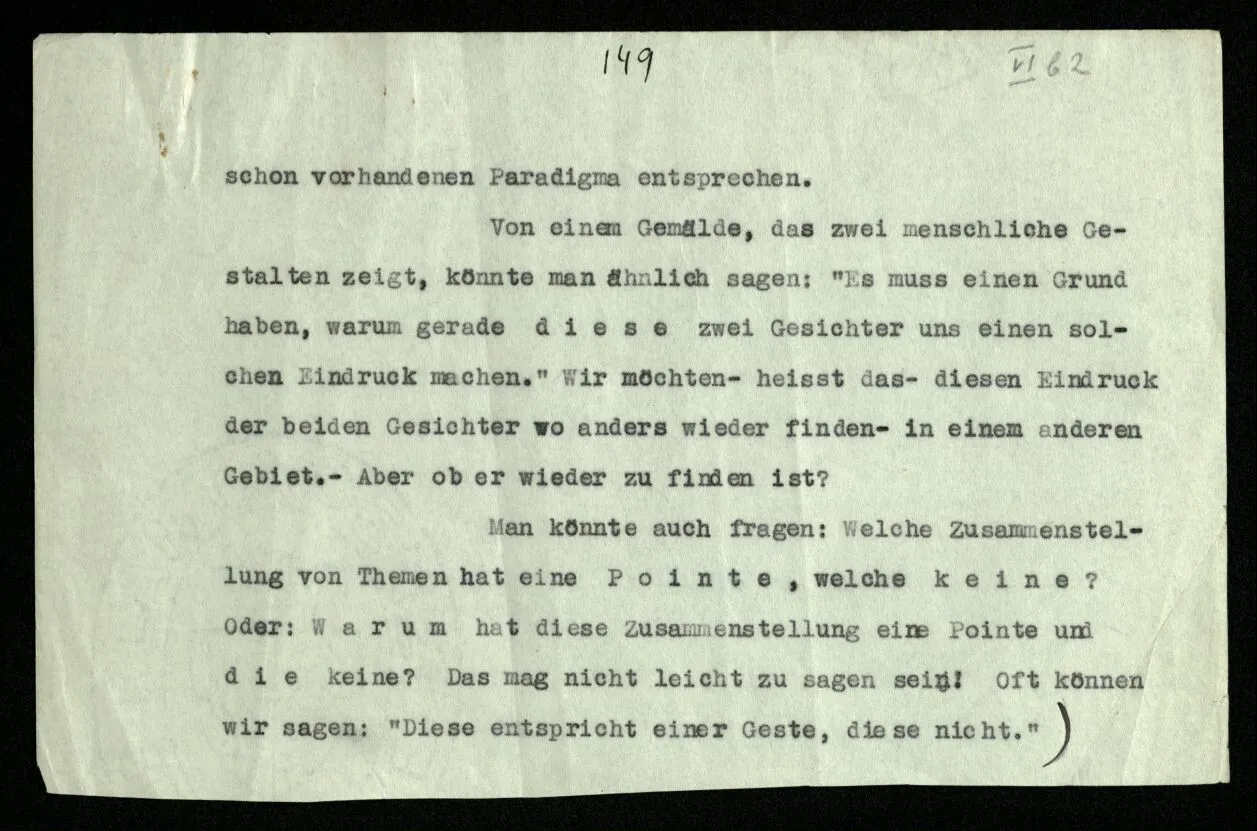 (Damit hängt zusammen: Wir möchten manchmal sagen, “es muß doch einen Grund haben, warum auf dieses Thema – in einem Sonatensatz etwa – gerade das Thema folgt”. Als Grund würden wir eine gewisse Beziehung der beiden Themen, eine Verwandtschaft, einen Gegensatz, oder dergleichen, anerkennen. – Aber wir können ja eine solche Beziehung konstruieren: sozusagen eine Operation, die das eine Thema aus dem andern erzeugt; aber damit ist uns nur gedient, wenn diese Beziehung eine uns wohlbekannte ist. Es ist also, als müßte die Folge dieser Themen einem in uns schon vorhandenen Paradigma entsprechen. Von einem Gemälde, das zwei menschliche Gestalten zeigt, könnte man ähnlich sagen: “Es muß einen Grund haben, warum gerade diese zwei Gesichter uns einen solchen Eindruck machen.” Wir möchten – heißt das – diesen Eindruck der beiden Gesichter wo anders wieder finden – in einem anderen Gebiet. – Aber ob er wieder zu finden ist? Man könnte auch fragen: Welche Zusammenstellung von Themen hat eine Pointe, welche keine? Oder: Warum hat diese Zusammenstellung eine Pointe und die keine? Das mag nicht leicht zu sagen sein! Oft können wir sagen: “Diese entspricht einer Geste, diese nicht.”)