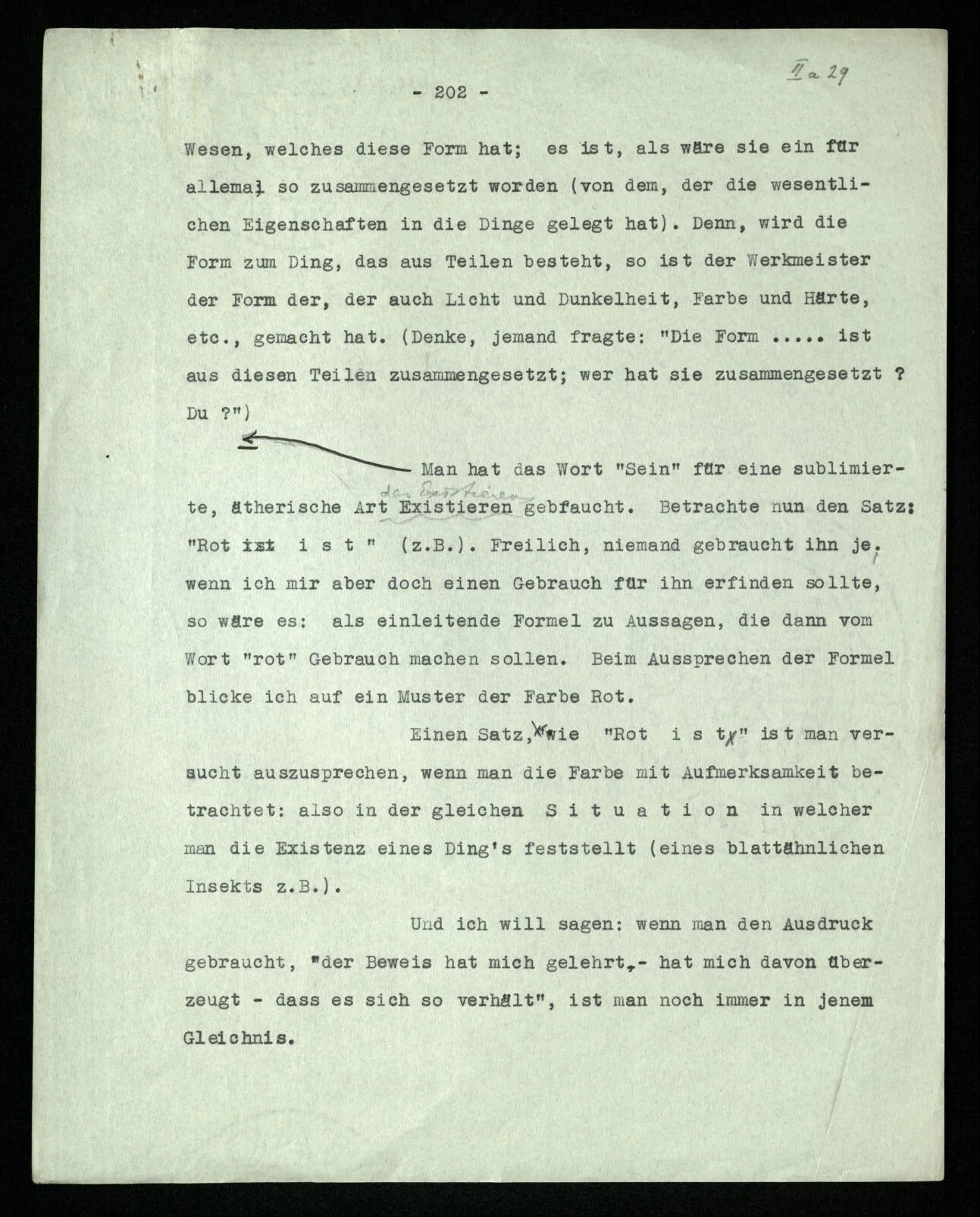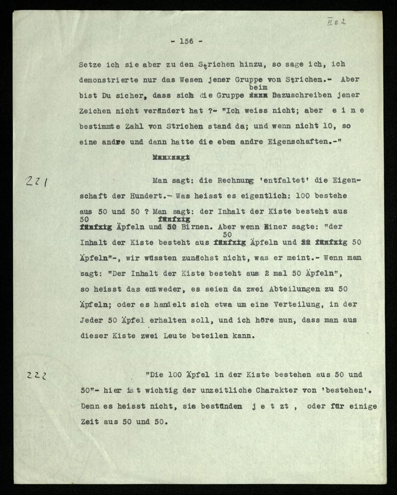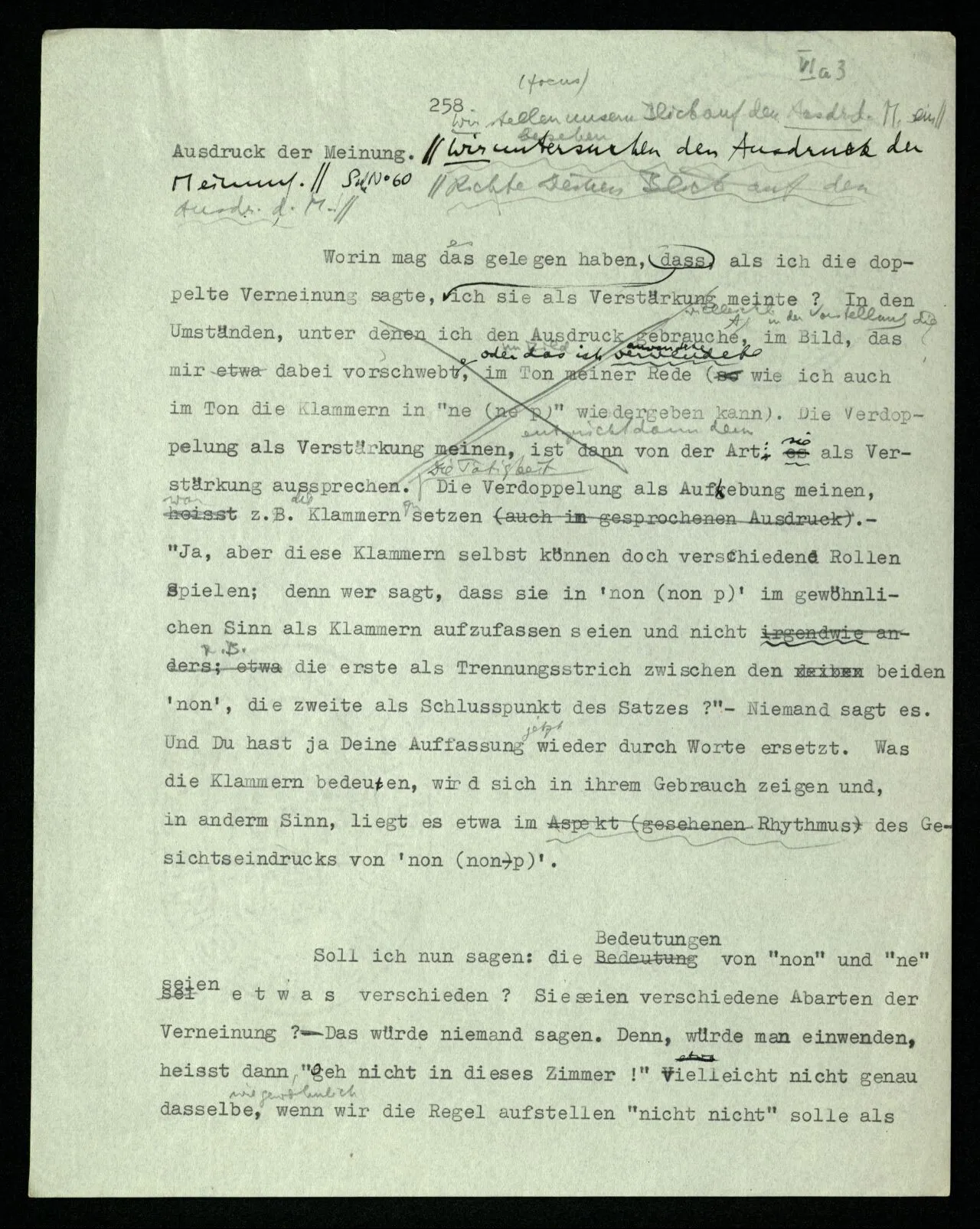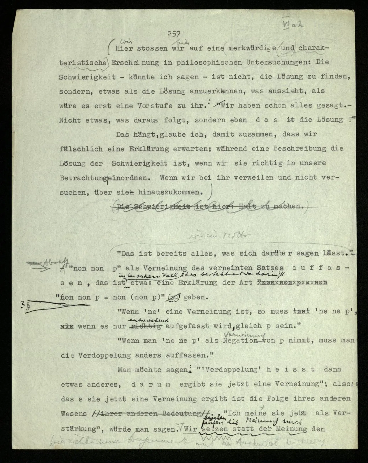 “non non p” als Verneinung des verneinten Satzes auffassen, das ist im besonderen Fall etwa: eine Erklärung der Art “non non p = non (non p)” geben. ?§ ⋎ “Wenn ‘ne’ eine Verneinung ist, so muß ‘ne ne p’, wenn es nur entsprechend aufgefaßt wird, gleich p sein.” “Wenn man ‘ne ne p’ als Negation von p nimmt, muß man die Verdoppelung anders auffassen.” Man möchte sagen: “‘Verdoppelung’ heißt dann etwas anderes, darum ergibt sie jetzt eine Verneinung”, also: daß sie jetzt eine Verneinung ergibt ist die Folge ihrer anderen Bedeutung. “Ich meine sie jetzt als Verstärkung”, würde man sagen. Wir setzen statt der Meinung den Ausdruck der Meinung. Richte Deinen Blick auf den Ausdruck der Meinung