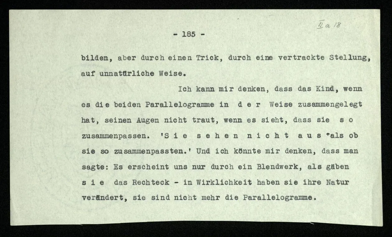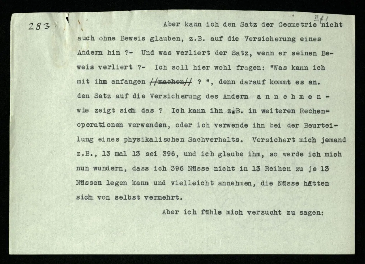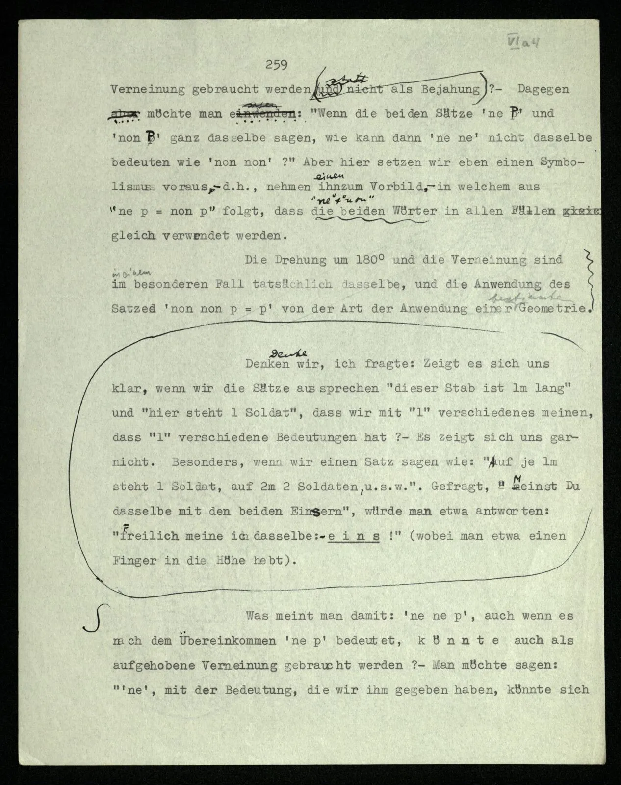 Soll ich nun sagen: die Bedeutungen von “non” und “ne” seien etwas verschieden? Sie seien verschiedene Abarten der Verneinung? – Das würde niemand sagen. Denn, würde man einwenden, heißt dann “geh nicht in dieses Zimmer!” vielleicht nicht genau dasselbe wie gewöhnlich, wenn wir die Regel aufstellen “nicht nicht” solle als Verneinung gebraucht werden? – Dagegen aber möchte man einwenden: “Wenn die beiden Sätze ‘ne P’ und ‘non P’ ganz dasselbe sagen, wie kann dann ‘ne ne’ nicht dasselbe bedeuten wie ‘non non’?” Aber hier setzen wir eben einen Symbolismus voraus – d.h., nehmen ihn zum Vorbild – in welchem aus ‘ne p = non p’ folgt, daß die beiden Wörter in allen Fällen gleich verwendet werden. Die Drehung um 180˚ und die Verneinung sind im besonderen Fall tatsächlich dasselbe, und die Anwendung des Satzes ‘non non p = p’ von der Art der Anwendung einer bestimmten Geometrie.