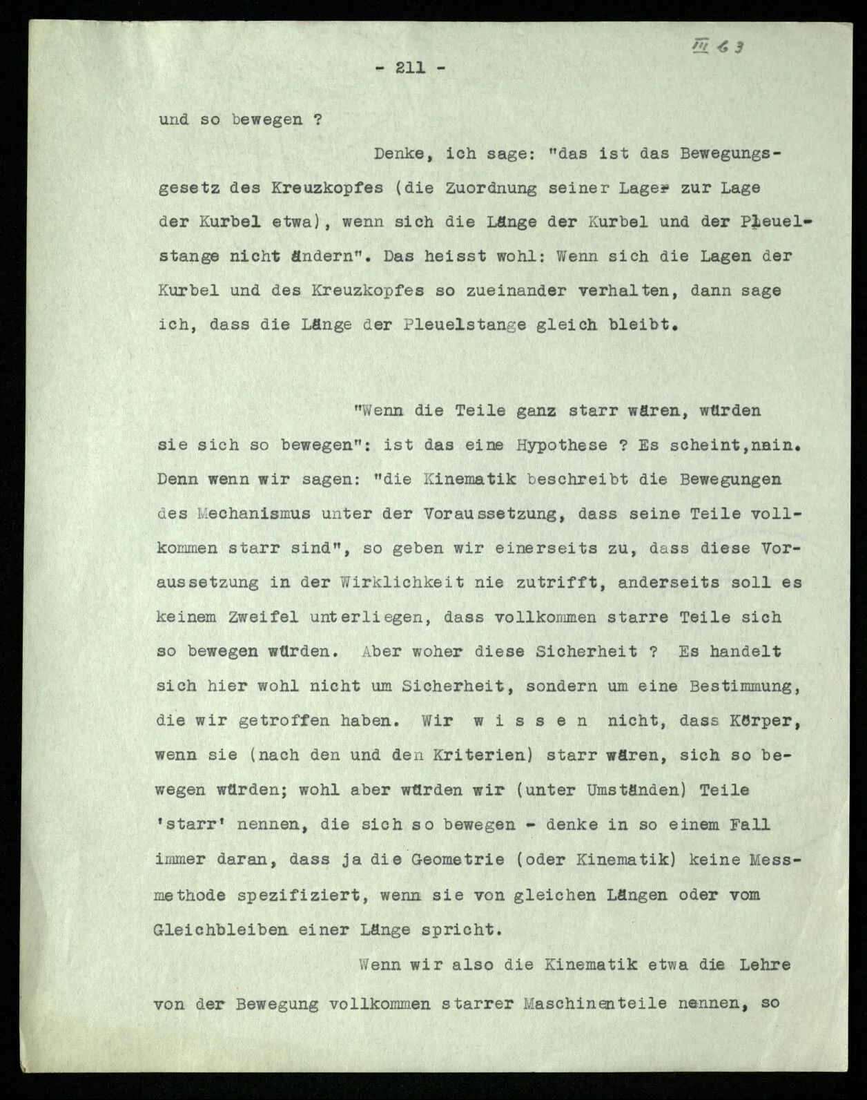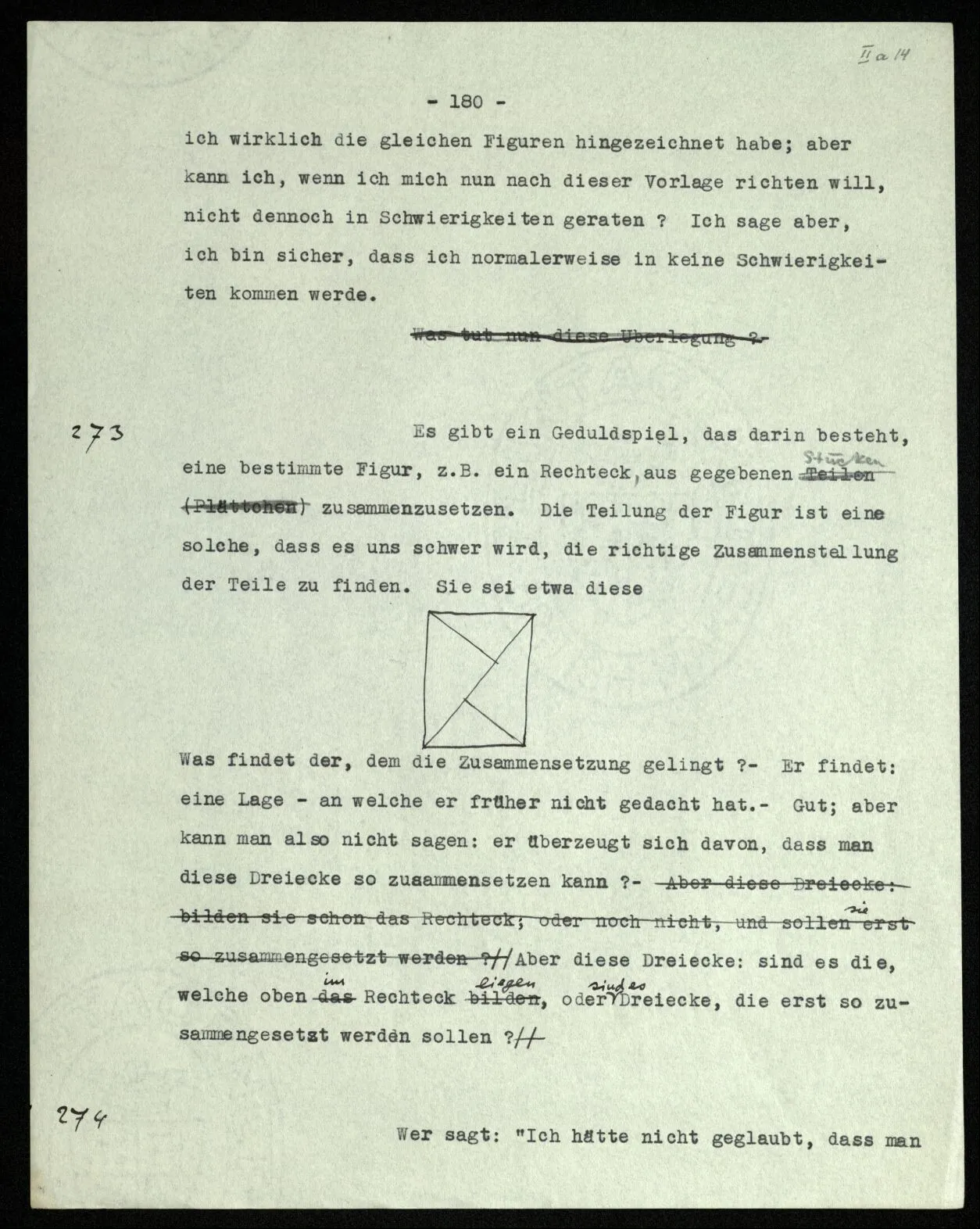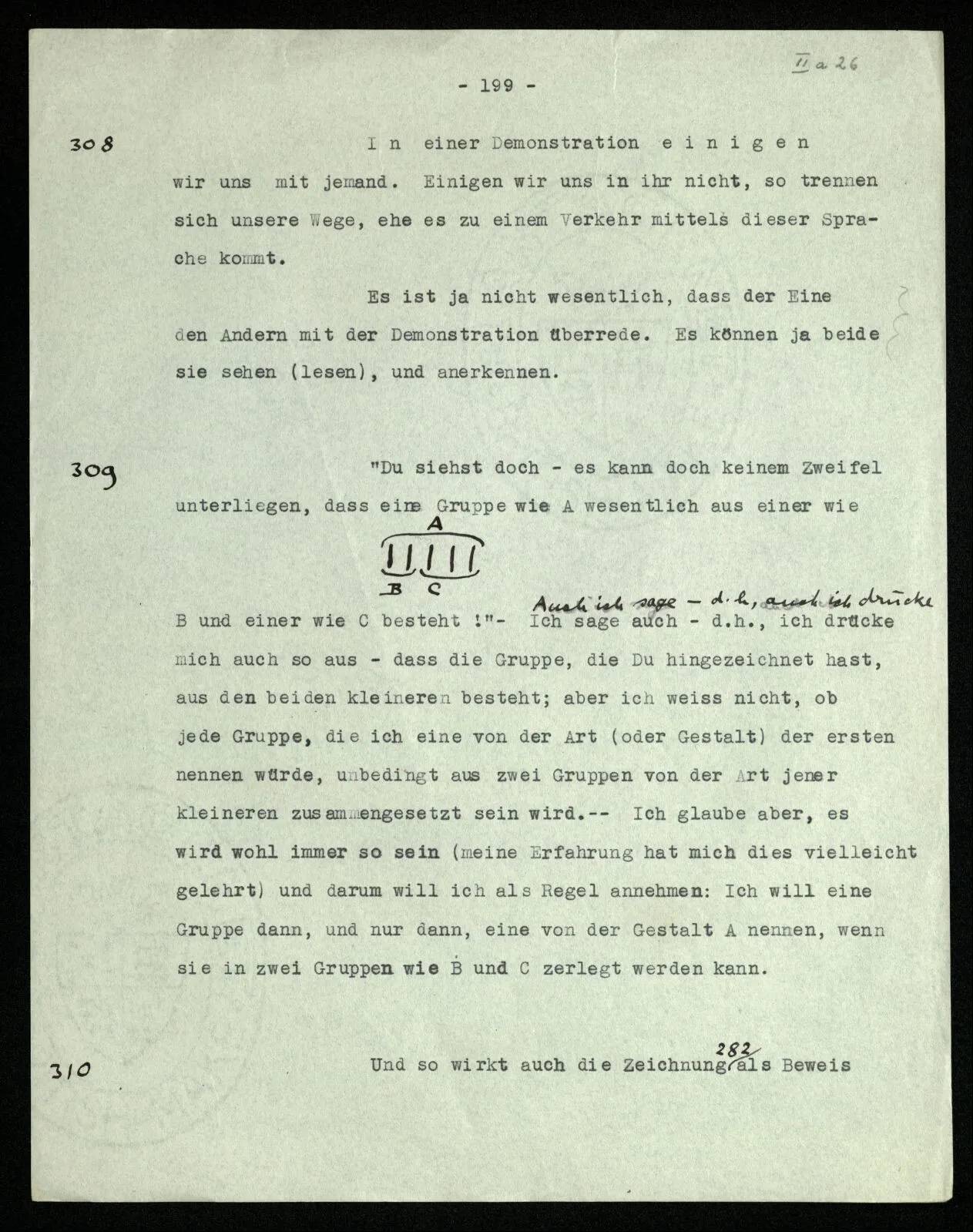 Soll ich nun sagen: die Bedeutungen von “non” und “ne” seien etwas verschieden? Sie seien verschiedene Abarten der Verneinung? – Das würde niemand sagen. Denn, würde man einwenden, heißt dann “geh nicht in dieses Zimmer!” vielleicht nicht genau dasselbe wie gewöhnlich, wenn wir die Regel aufstellen “nicht nicht” solle als Verneinung gebraucht werden? – Dagegen aber möchte man einwenden: “Wenn die beiden Sätze ‘ne P’ und ‘non P’ ganz dasselbe sagen, wie kann dann ‘ne ne’ nicht dasselbe bedeuten wie ‘non non’?” Aber hier setzen wir eben einen Symbolismus voraus – d.h., nehmen ihn zum Vorbild – in welchem aus ‘ne p = non p’ folgt, daß die beiden Wörter in allen Fällen gleich verwendet werden. Die Drehung um 180˚ und die Verneinung sind im besonderen Fall tatsächlich dasselbe, und die Anwendung des Satzes ‘non non p = p’ von der Art der Anwendung einer bestimmten Geometrie.