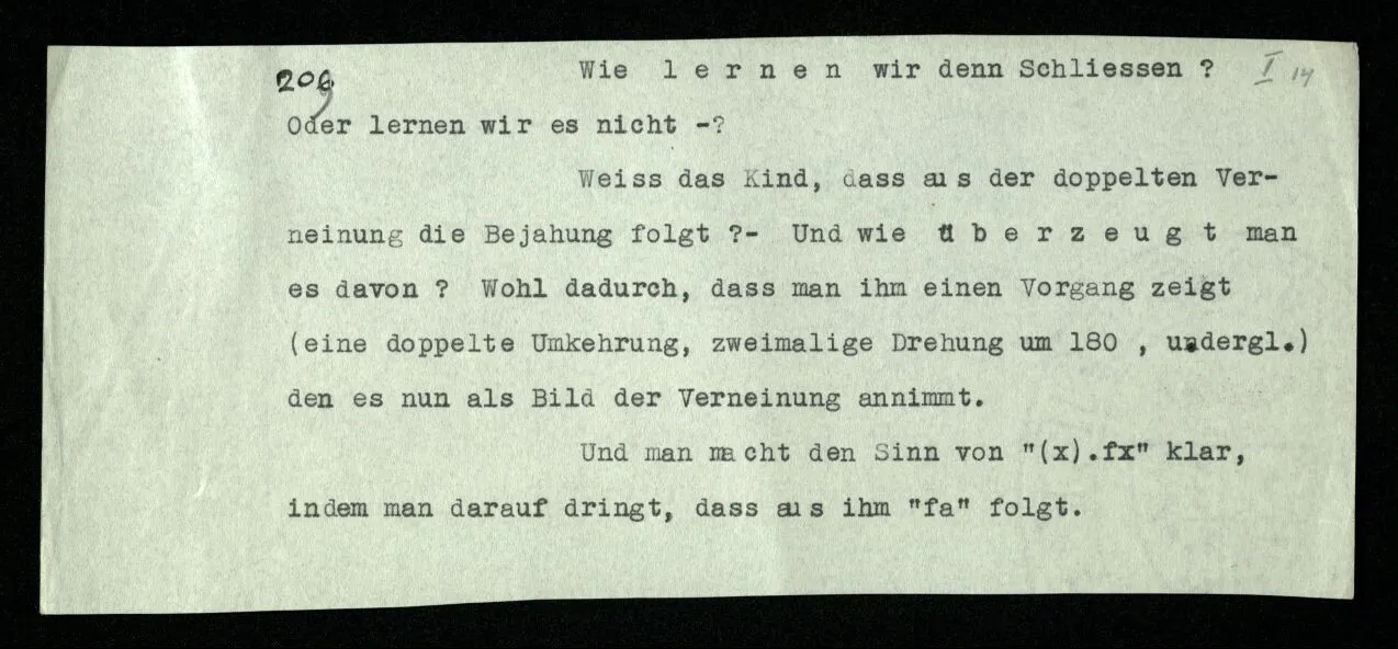 209 Wie lernen wir denn Schließen? Oder lernen wir es nicht –? Weiß das Kind, daß aus der doppelten Verneinung die Bejahung folgt? – Und wie überzeugt man es davon? Wohl dadurch, daß man ihm einen Vorgang zeigt (eine doppelte Umkehrung, zweimalige Drehung um 180, u. dergl.) den es nun als Bild der Verneinung annimmt. Und man macht den Sinn von “(x)․fx” klar, indem man darauf dringt, daß aus ihm “fa” folgt.