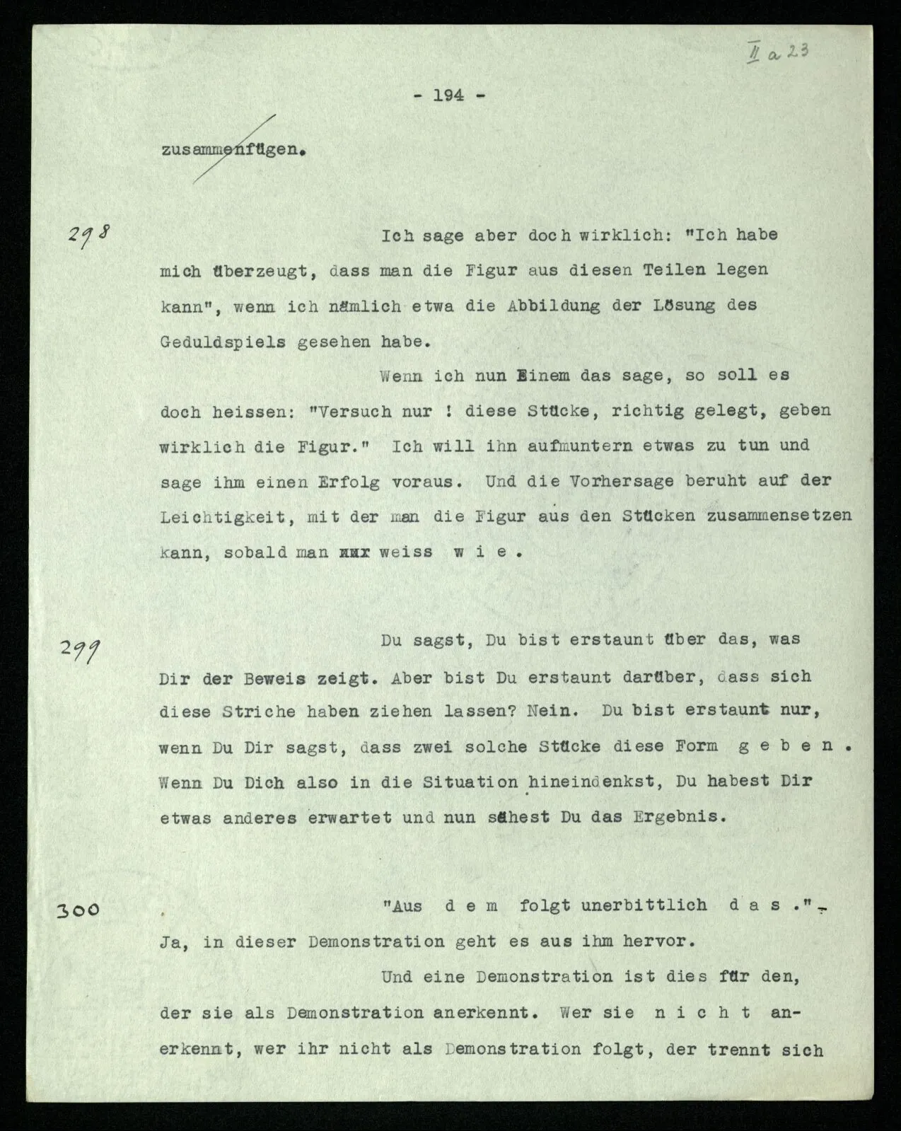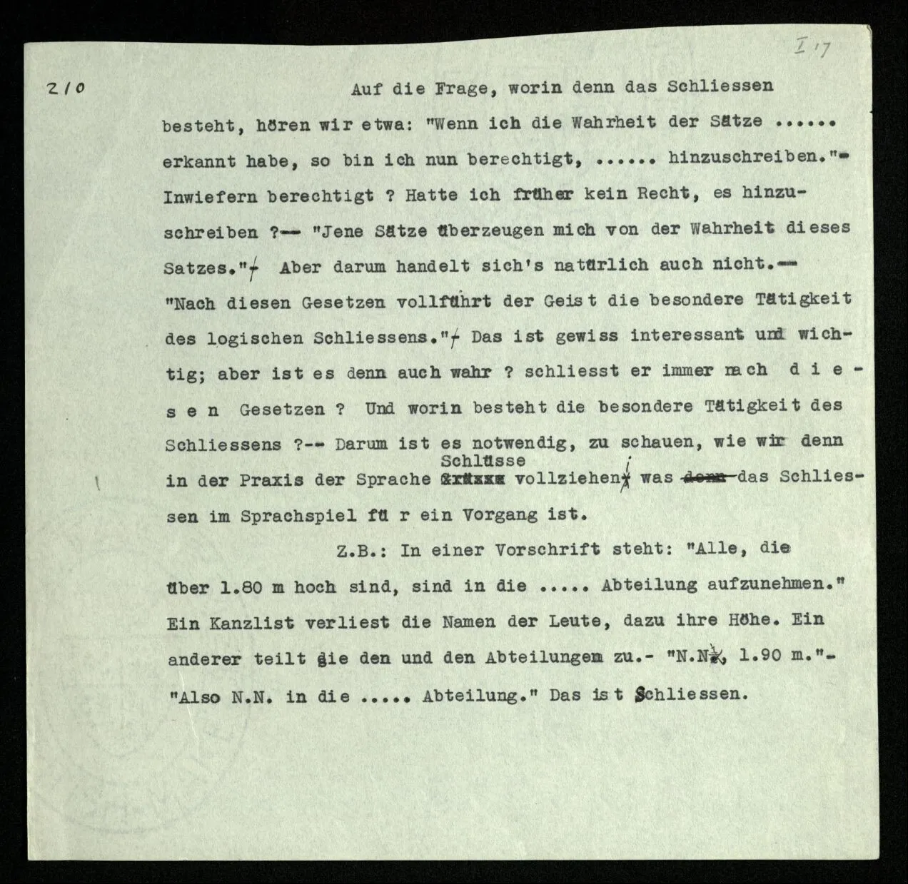 210 Auf die Frage, worin denn das Schließen besteht, hören wir etwa: “Wenn ich die Wahrheit der Sätze ‥‥‥ erkannt habe, so bin ich nun berechtigt, ‥‥‥ hinzuschreiben.” – Inwiefern berechtigt? Hatte ich früher kein Recht, es hinzuschreiben? ‒ ‒ “Jene Sätze überzeugen mich von der Wahrheit dieses Satzes.” Aber darum handelt sich’s natürlich auch nicht. ‒ ‒ “Nach diesen Gesetzen vollführt der Geist die besondere Tätigkeit des logischen Schließens.” Das ist gewiß interessant und wichtig; aber ist es denn auch wahr? schließt er immer nach diesen Gesetzen? Und worin besteht die besondere Tätigkeit des Schließens? ‒ ‒ Darum ist es notwendig, zu schauen, wie wir denn in der Praxis der Sprache Schlüsse vollziehen; was denn das Schließen im Sprachspiel für ein Vorgang ist. Z.B.: In einer Vorschrift steht: “Alle, die über 1.80 m hoch sind, sind in die ‥‥․ Abteilung aufzunehmen.” Ein Kanzlist verliest die Namen der Leute, dazu ihre Höhe. Ein anderer teilt sie den und den Abteilungen zu. – N.N., 1.90 m. – “Also N.N. in die ‥‥․ Abteilung.” Das ist Schließen.
