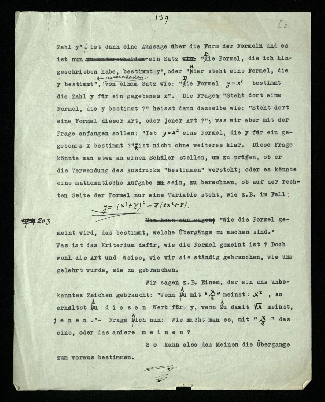 203 “Wie die Formel gemeint wird, das bestimmt, welche Übergänge zu machen sind.” Was ist das Kriterium dafür, wie die Formel gemeint ist? Doch wohl die Art und Weise, wie wir sie ständig gebrauchen, wie uns gelehrt wurde, sie zu gebrauchen. Wir sagen z.B. Einem, der ein uns unbekanntes Zeichen gebraucht: “Wenn du mit “” meinst x², so erhältst du diesen Wert für y, wenn du damit √x meinst, jenen.” – Frage dich nun: Wie macht man es, mit ‘’ das eine, oder das andere meinen? So kann also das Meinen die Übergänge zum voraus bestimmen.