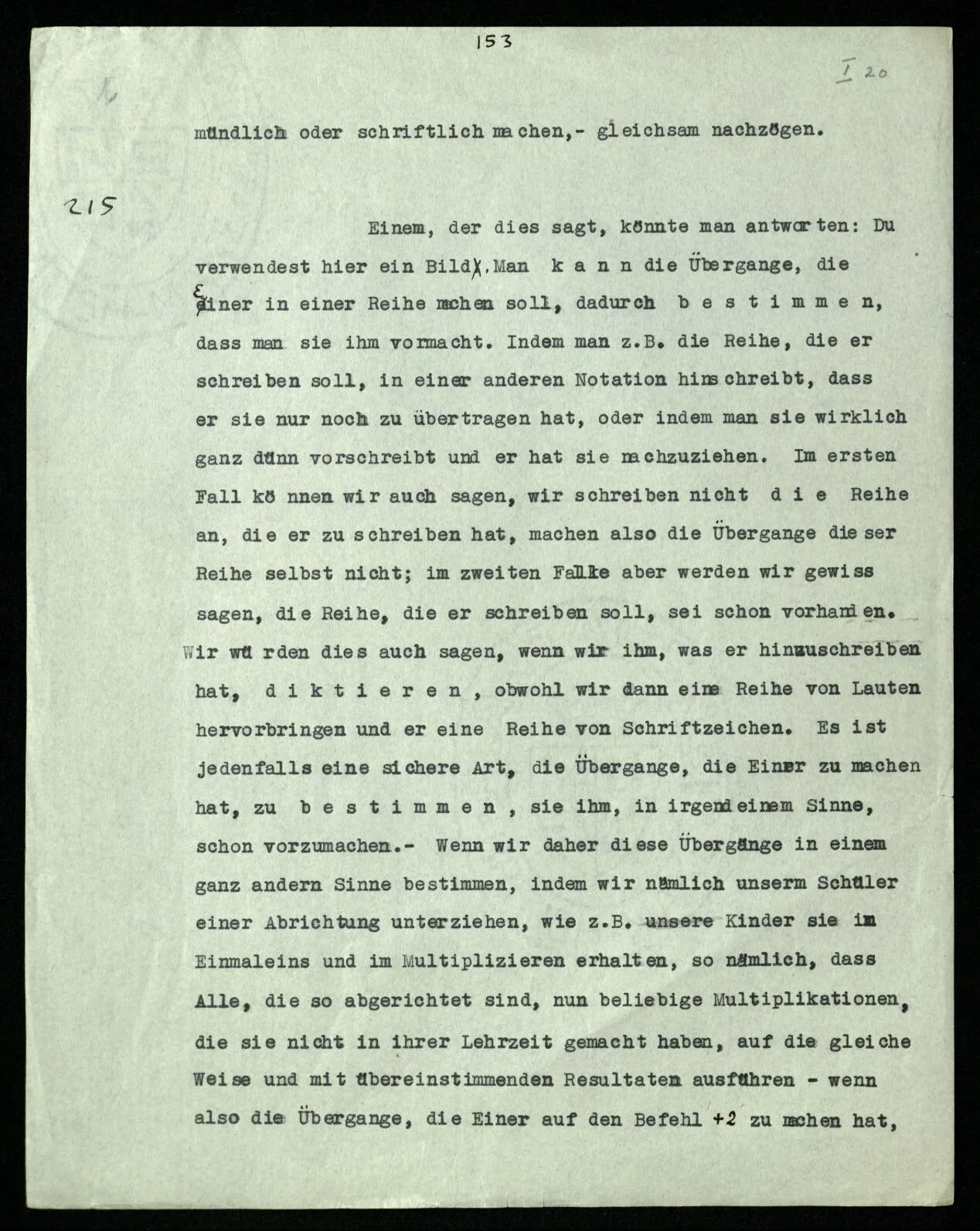 215 Einem, der dies sagt, könnte man antworten: Du verwendest hier ein Bild. Man kann die Übergänge, die Einer in einer Reihe machen soll, dadurch bestimmen, daß man sie ihm vormacht. Indem man z.B. die Reihe, die er schreiben soll, in einer anderen Notation hinschreibt, daß er sie nur noch zu übertragen hat, oder indem man sie wirklich ganz dünn vorschreibt und er hat sie nachzuziehen. Im ersten Fall können wir auch sagen, wir schreiben nicht die Reihe an, die er zu schreiben hat, machen also die Übergänge dieser Reihe selbst nicht; im zweiten Falle aber werden wir gewiß sagen, die Reihe, die er schreiben soll, sei schon vorhanden. Wir würden dies auch sagen, wenn wir ihm, was er hinzuschreiben hat, diktieren, obwohl wir dann eine Reihe von Lauten hervorbringen und er eine Reihe von Schriftzeichen. Es ist jedenfalls eine sichere Art, die Übergänge, die Einer zu machen hat, zu bestimmen, sie ihm, in irgendeinem Sinne, schon vorzumachen. – Wenn wir daher diese Übergänge in einem ganz andern Sinne bestimmen, indem wir nämlich unsern Schüler einer Abrichtung unterziehen, wie z.B. unsere Kinder sie im Einmaleins und im Multiplizieren erhalten, so nämlich, daß Alle, die so abgerichtet sind, nun beliebige Multiplikationen, die sie nicht in ihrer Lehrzeit gemacht haben, auf die gleiche Weise und mit übereinstimmenden Resultaten ausführen – wenn also die Übergänge, die Einer auf den Befehl +2 zu machen hat, durch Abrichtung so bestimmt sind, daß wir mit Sicherheit voraussagen können, wie er gehen wird, auch wenn er diesen Übergang bis jetzt noch nie gemacht hat, – dann kann es uns natürlich sein, als Bild dieses Sachverhalts den zu gebrauchen: die Übergänge seien bereits alle gemacht, er schriebe sie nur noch hin. [Von der Auffassung der Möglichkeit als Schatten der Wirklichkeit wird oft zu reden sein.]