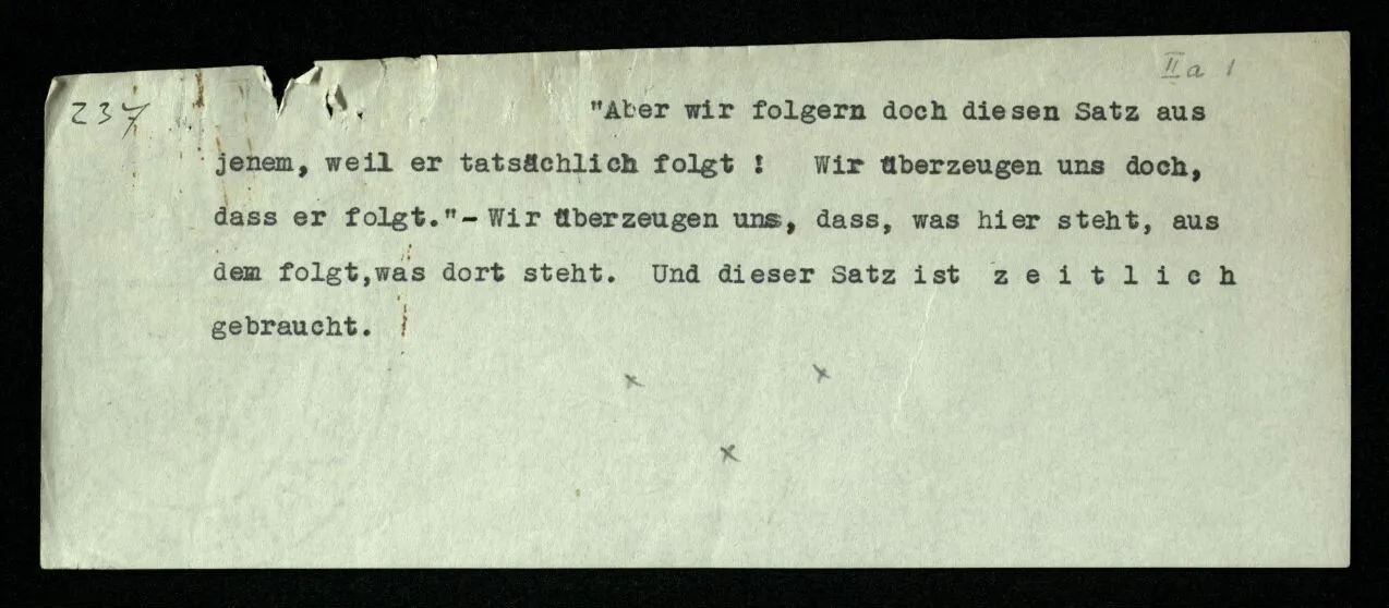 237 “Aber wir folgern doch diesen Satz aus jenem, weil er tatsächlich folgt! Wir überzeugen uns doch, daß er folgt.” Wir überzeugen uns, daß, was hier steht, aus dem folgt, was dort steht. Und dieser Satz ist zeitlich gebraucht.