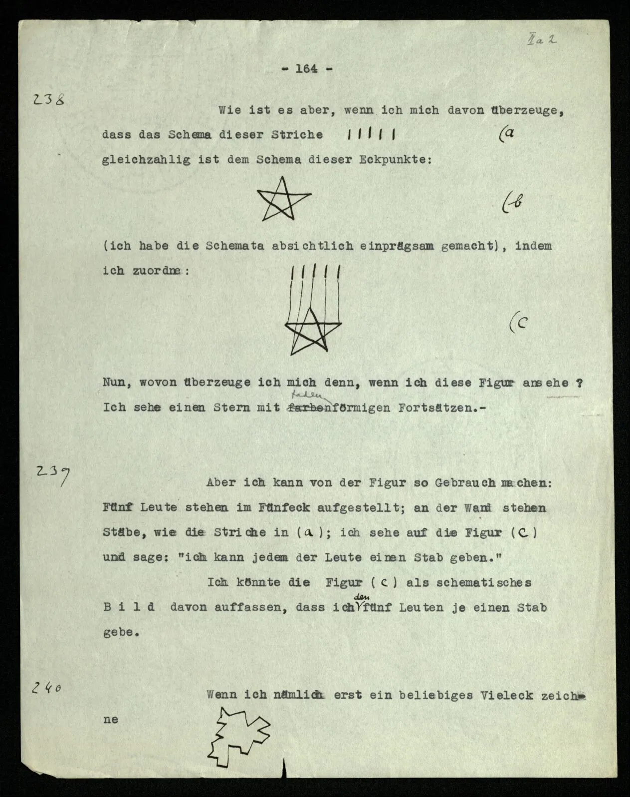 239 Aber ich kann von der Figur so Gebrauch machen: Fünf Leute stehen im Fünfeck aufgestellt; an der Wand stehen Stäbe, wie die Striche in (a); ich sehe auf die Figur (c) und sage: “ich kann jedem der Leute einen Stab geben.” Ich könnte die Figur (c) als schematisches Bild davon auffassen, daß ich den fünf Leuten je einen Stab gebe.