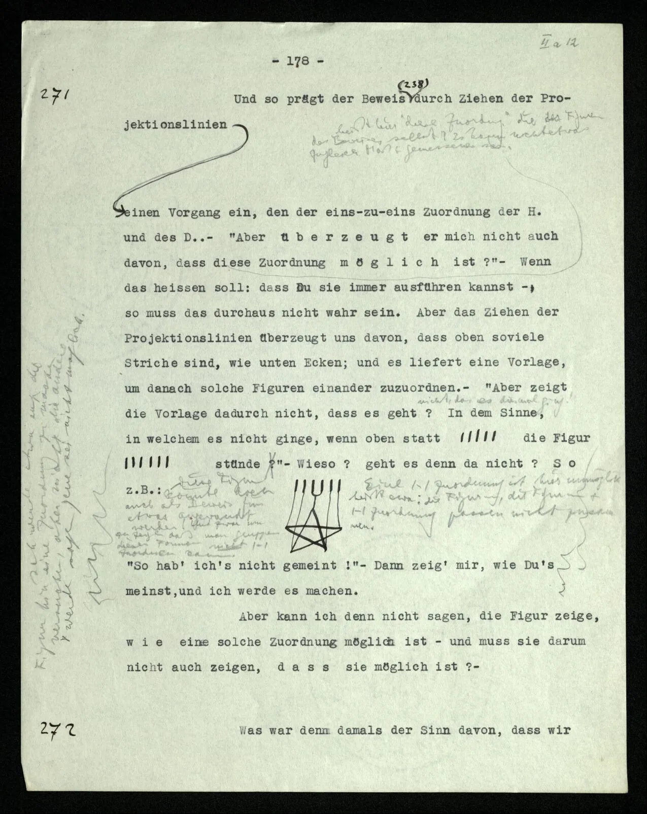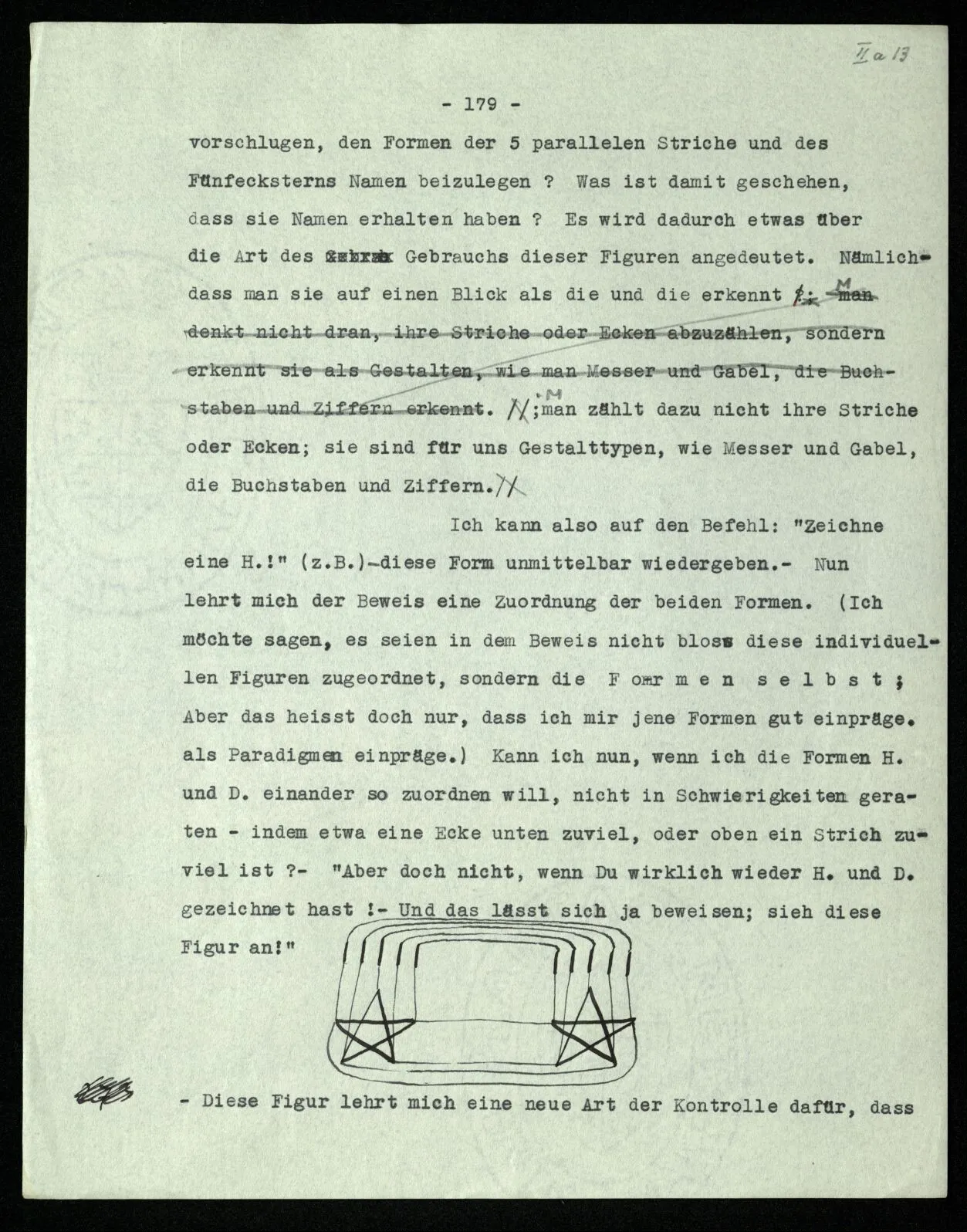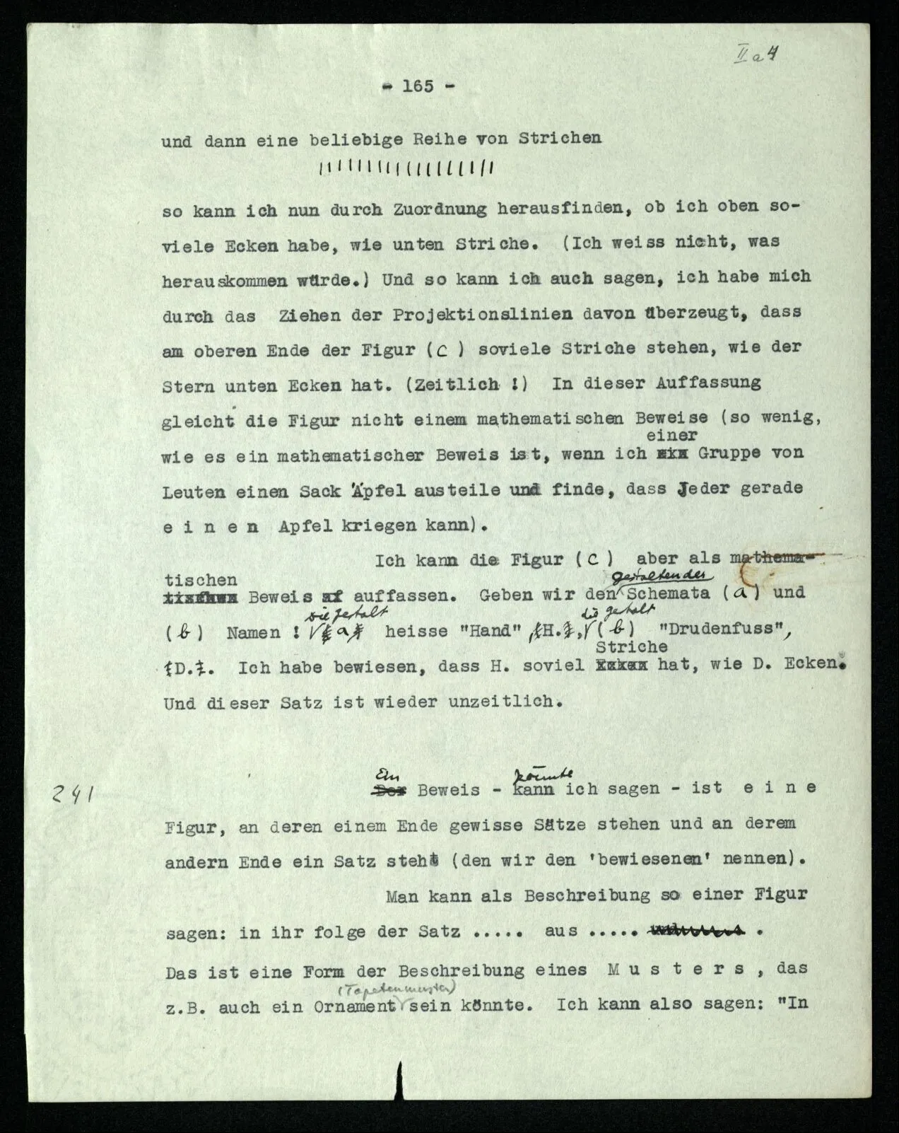 so kann ich nun durch Zuordnung herausfinden, ob ich oben soviele Ecken habe, wie unten Striche. (Ich weiß nicht, was herauskommen würde.) Und so kann ich auch sagen, ich habe mich durch das Ziehen der Projektionslinien davon überzeugt, daß am oberen Ende der Figur (c) soviele Striche stehen, wie der Stern unten Ecken hat. (Zeitlich!) In dieser Auffassung gleicht die Figur nicht einem mathematischen Beweise (so wenig, wie es ein mathematischer Beweis ist, wenn ich einer Gruppe von Leuten einen Sack Äpfel austeile und finde, daß Jeder gerade einen Apfel kriegen kann). Ich kann die Figur (c) aber als mathematischen Beweis auffassen. Geben wir den Gestalten der Schemata (a) und (b) Namen! Die Gestalt a heiße “Hand”, H., die Gestalt b “Drudenfuß”, D. Ich habe bewiesen, daß H. soviel Striche hat, wie D. Ecken. Und dieser Satz ist wieder unzeitlich.