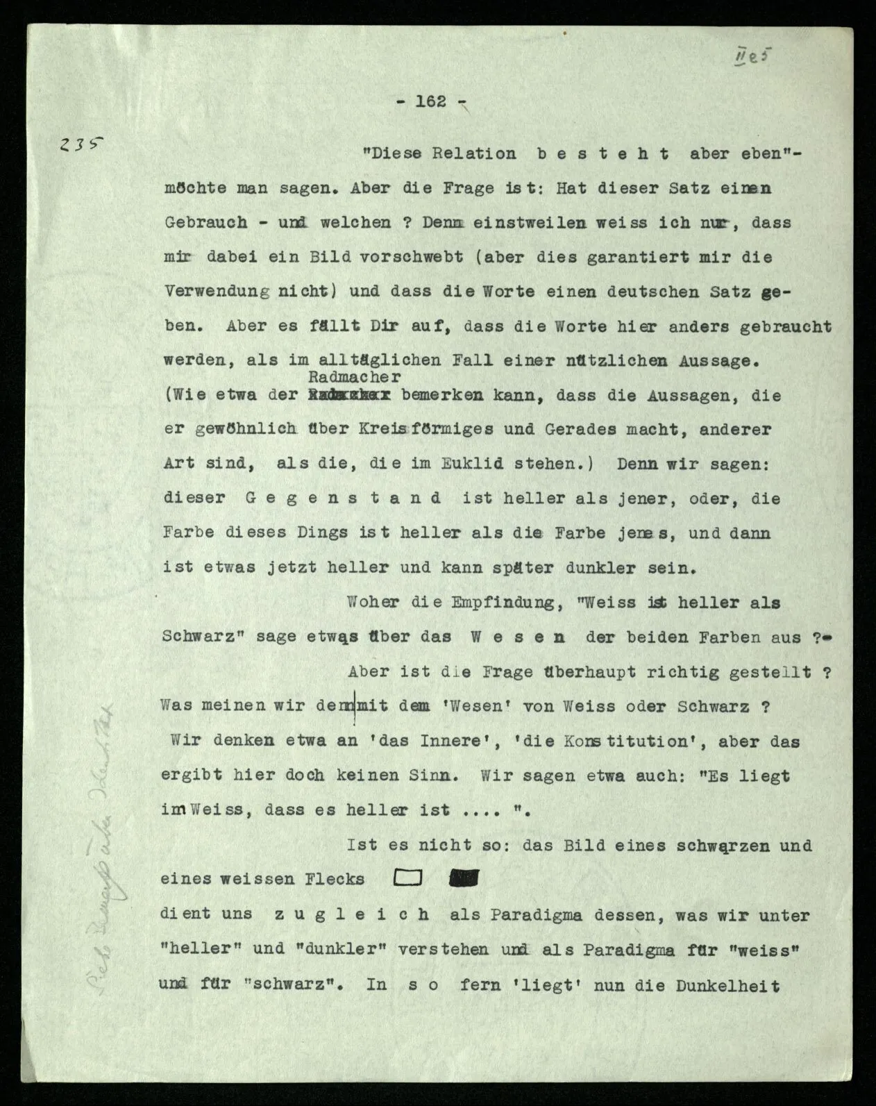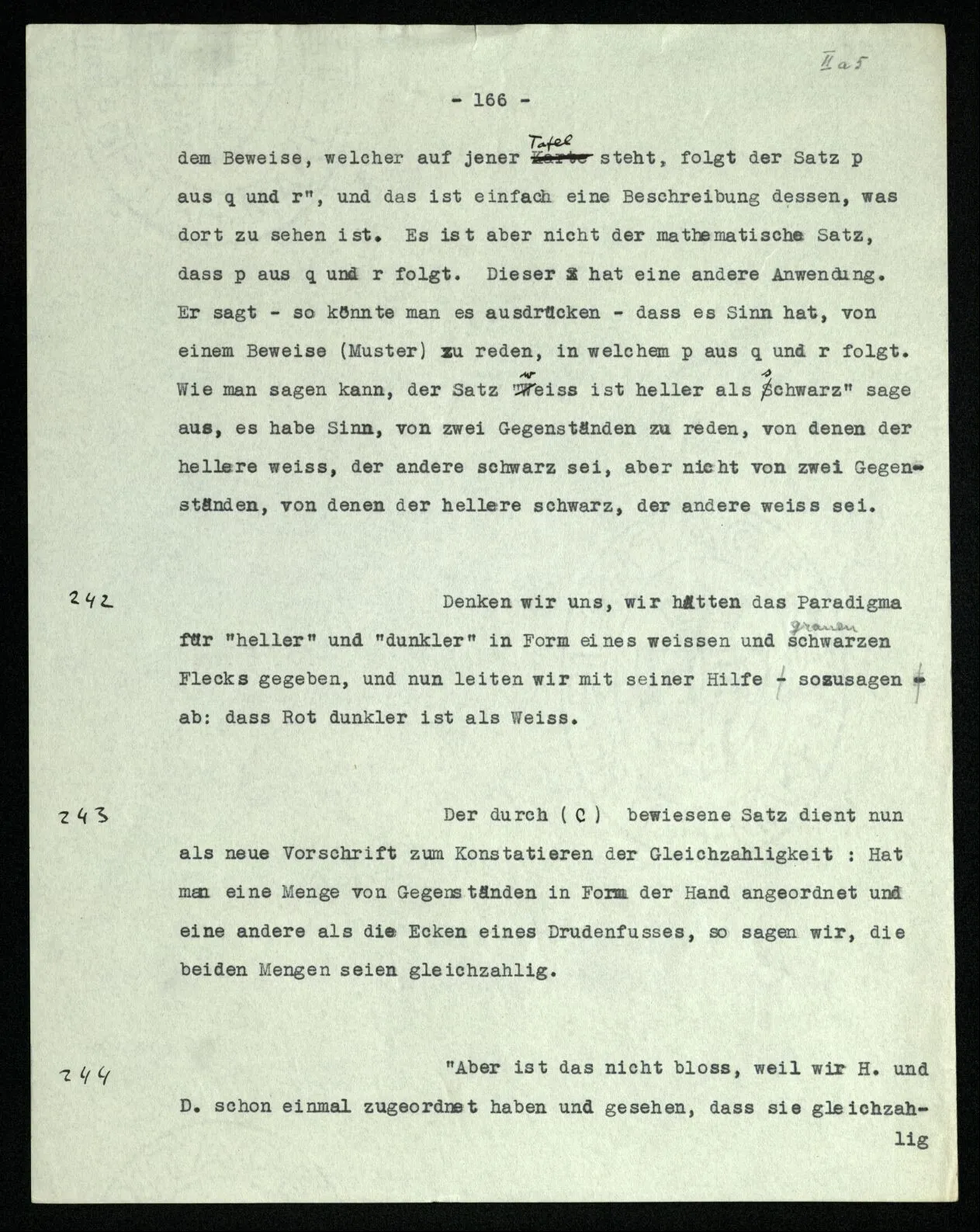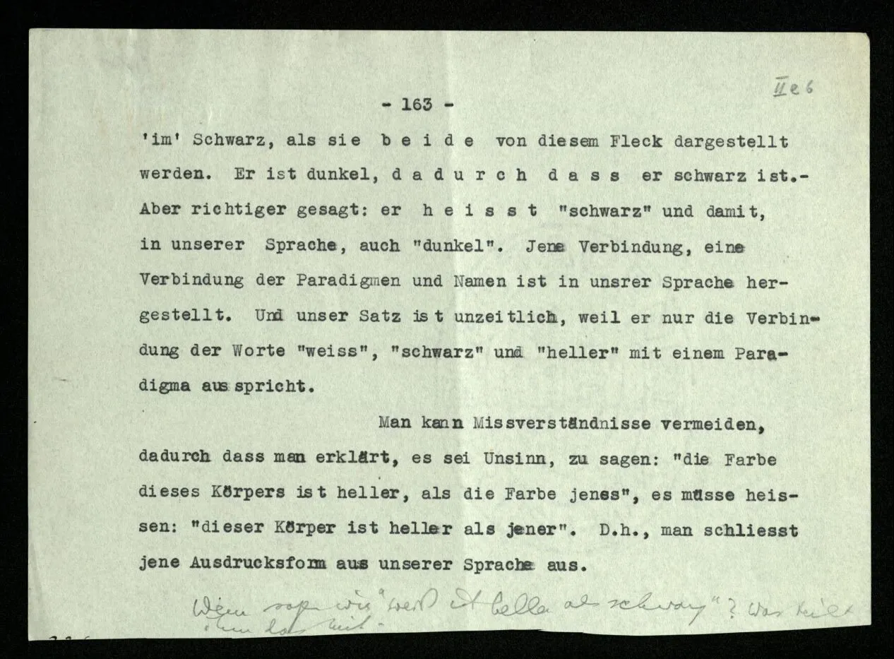 242 Denken wir uns, wir hätten das Paradigma für “heller” und “dunkler” in Form eines weißen und schwarzen Flecks gegeben, und nun leiten wir mit seiner Hilfe sozusagen ab: daß Rot dunkler ist als Weiß.