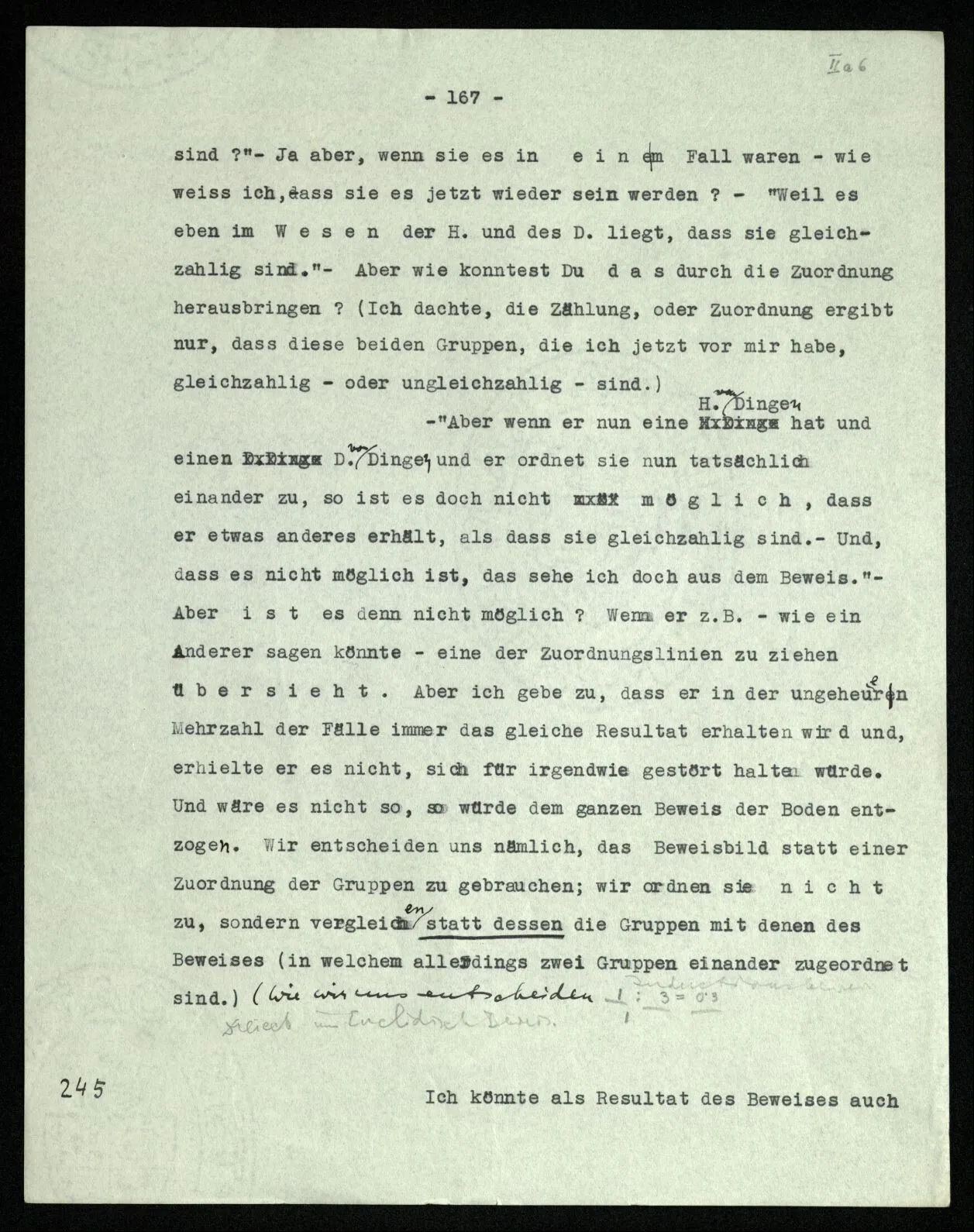 244 “Aber ist das nicht bloß, weil wir H. und D. schon einmal zugeordnet haben und gesehen, daß sie gleichzahlig sind?” – Ja aber, wenn sie es in einem Fall waren – wie weiß ich, daß sie es jetzt wieder sein werden? – “Weil es eben im Wesen der H. und des D. liegt, daß sie gleichzahlig sind.” – Aber wie konntest Du das durch die Zuordnung herausbringen? (Ich dachte, die Zählung, oder Zuordnung ergibt nur, daß diese beiden Gruppen, die ich jetzt vor mir habe, gleichzahlig – oder ungleichzahlig – sind.) – “Aber wenn er nun eine H. von Dingen hat und einen D. von Dingen und er ordnet sie nun tatsächlich einander zu, so ist es doch nicht möglich, daß er etwas anderes erhält, als daß sie gleichzahlig sind. – Und, daß es nicht möglich ist, das sehe ich doch aus dem Beweis.” – Aber ist es denn nicht möglich? Wenn er z.B. – wie ein Anderer sagen könnte – eine der Zuordnungslinien zu ziehen übersieht. Aber ich gebe zu, daß er in der ungeheuern Mehrzahl der Fälle immer das gleiche Resultat erhalten wird und, erhielte er es nicht, sich für irgendwie gestört halten würde. Und wäre es nicht so, so würde dem ganzen Beweis der Boden entzogen. Wir entscheiden uns nämlich, das Beweisbild statt einer Zuordnung der Gruppen zu gebrauchen; wir ordnen sie nicht zu, sondern vergleichen statt dessen die Gruppen mit denen des Beweises (in welchem allerdings zwei Gruppen einander zugeordnet sind). (Wie wir uns entscheiden …