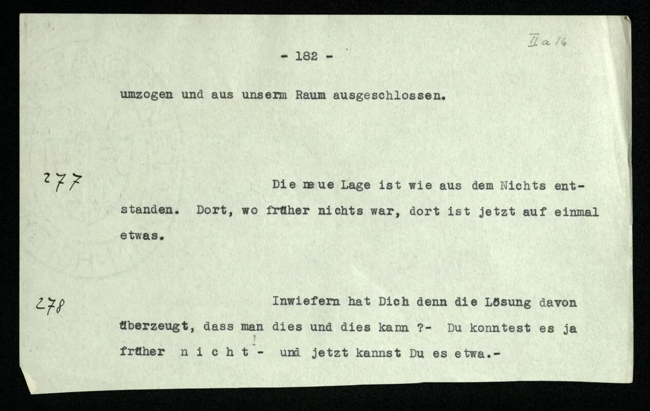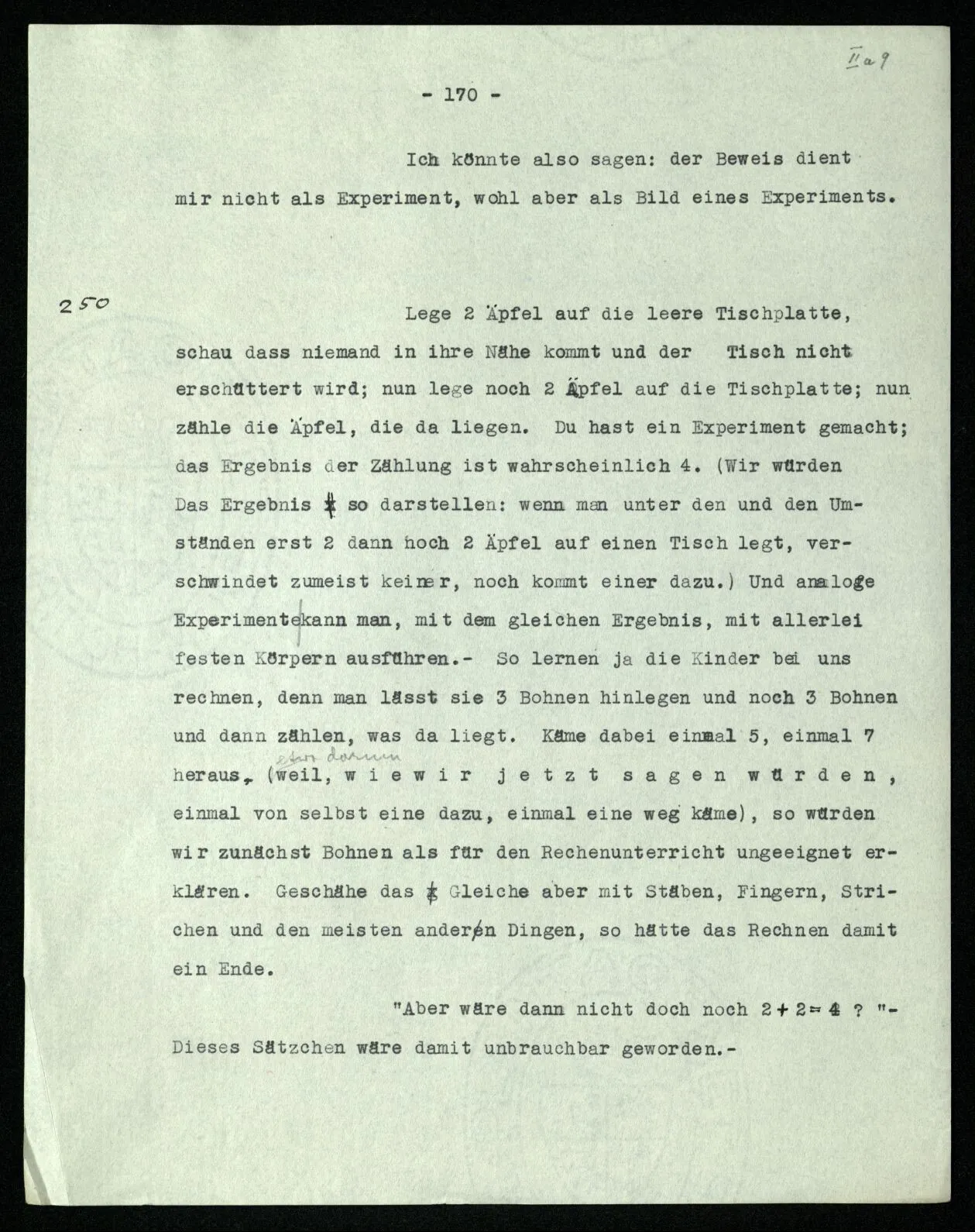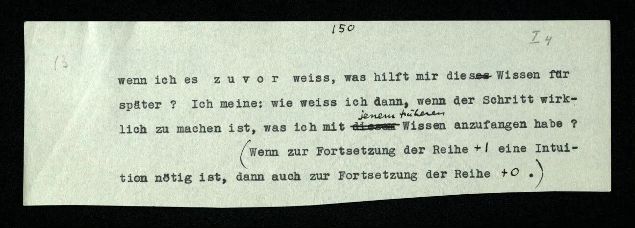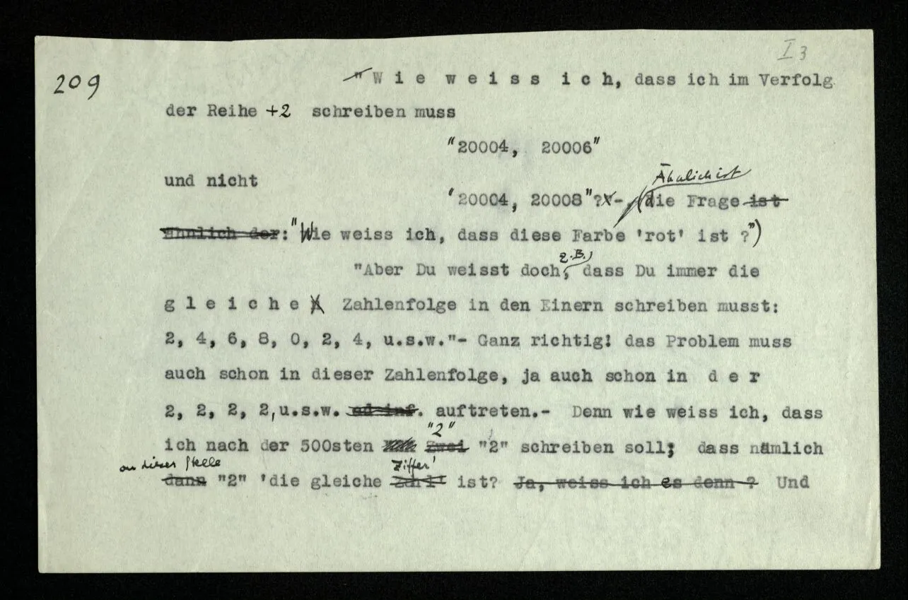 (Ähnlich ist die Frage: “Wie weiß ich, daß diese Farbe ‘rot’ ist?”) “Aber Du weißt doch z.B., daß Du immer die gleiche Zahlenfolge in den Einern schreiben mußt: 2, 4, 6, 8, 0, 2, 4, u.s.w.” – Ganz richtig! das Problem muß auch schon in dieser Zahlenfolge, ja auch schon in der 2, 2, 2, 2, u.s.w. auftreten. – Denn wie weiß ich, daß ich nach der 500sten “2” “2” schreiben soll? daß nämlich an dieser Stelle “2” ‘die gleiche Ziffer’ ist? Und wenn ich es zuvor weiß, was hilft mir dies Wissen für später? Ich meine: wie weiß ich dann, wenn der Schritt wirklich zu machen ist, was ich mit jenem früheren Wissen anzufangen habe? (Wenn zur Fortsetzung der Reihe +1 eine Intuition nötig ist, dann auch zur Fortsetzung der Reihe +0.)