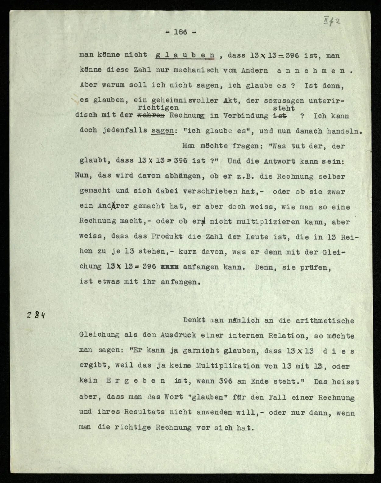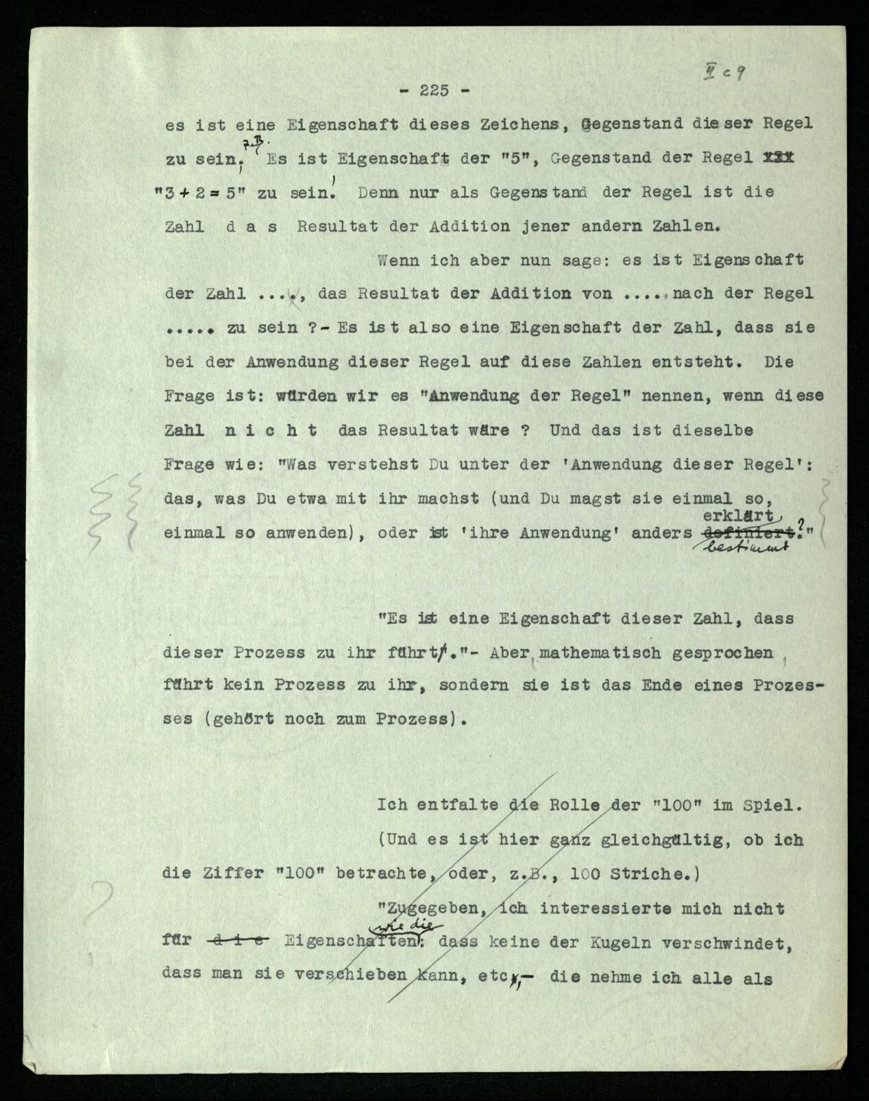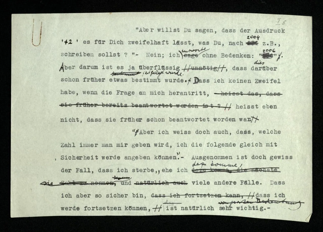 “Aber willst Du sagen, daß der Ausdruck ‘+2’ es für Dich zweifelhaft läßt, was Du, nach 2004 z.B., schreiben sollst?” – Nein; ich antworte ohne Bedenken: “2006”. Aber darum ist es ja überflüssig, daß darüber schon früher etwas bestimmt wurde. Daß ich keinen Zweifel habe, wenn die Frage an mich herantritt, heißt eben nicht, daß sie früher schon beantwortet worden war. “Aber ich weiß doch auch, daß, welche Zahl immer man mir geben wird, ich die folgende gleich mit Sicherheit werde angeben können.” – Ausgenommen ist doch gewiß der Fall, daß ich sterbe, ehe ich dazu komme, und viele andere Fälle. Daß ich aber so sicher bin, daß ich werde fortsetzen können, ist natürlich sehr wichtig. –