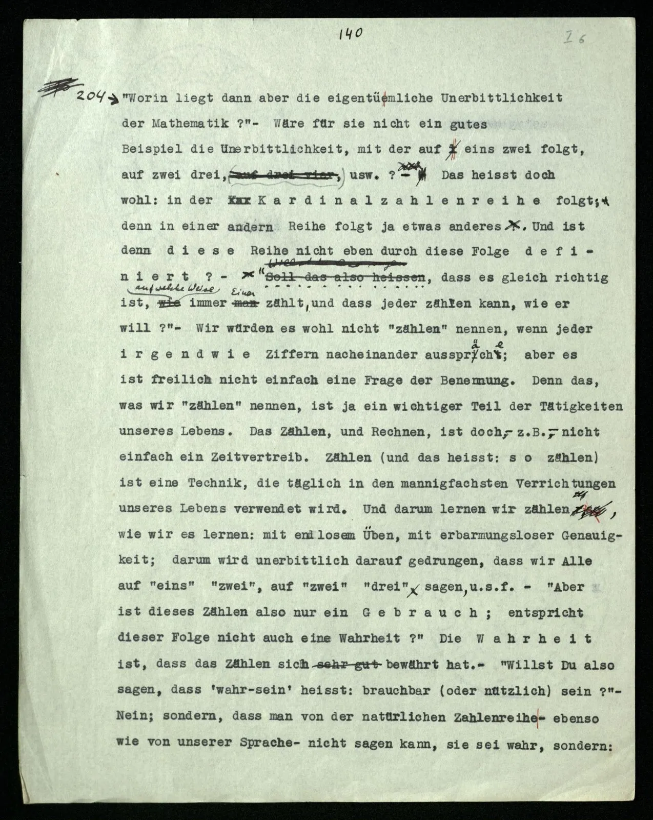 204 “Worin liegt dann aber die eigentümliche Unerbittlichkeit der Mathematik?” – Wäre für sie nicht ein gutes Beispiel die Unerbittlichkeit, mit der auf eins zwei folgt, auf zwei drei, usw.? – Das heißt doch wohl: in der Kardinalzahlenreihe folgt, denn in einer andern Reihe folgt ja etwas anderes. Und ist denn diese Reihe nicht eben durch diese Folge definiert? – “Soll das also heißen, daß es gleich richtig ist, auf welche Weise immer Einer zählt, und daß jeder zählen kann, wie er will?” – Wir würden es wohl nicht “zählen” nennen, wenn jeder irgendwie Ziffern nacheinander ausspräche; aber es ist freilich nicht einfach eine Frage der Benennung. Denn das, was wir “zählen” nennen, ist ja ein wichtiger Teil der Tätigkeiten unseres Lebens. Das Zählen, und Rechnen, ist doch – z.B. – nicht einfach ein Zeitvertreib. Zählen (und das heißt: so zählen) ist eine Technik, die täglich in den mannigfachsten Verrichtungen unseres Lebens verwendet wird. Und darum lernen wir zählen, wie wir es lernen: mit endlosem Üben, mit erbarmungsloser Genauigkeit; darum wird unerbittlich darauf gedrungen, daß wir Alle auf “eins” “zwei”, auf “zwei” “drei” sagen, u.s.f. – “Aber ist dieses Zählen also nur ein Gebrauch; entspricht dieser Folge nicht auch eine Wahrheit?” Die Wahrheit ist, daß das Zählen sich bewährt hat. – “Willst du also sagen, daß ‘wahr-sein’ heißt: brauchbar (oder nützlich) sein?” – Nein; sondern, daß man von der natürlichen Zahlenreihe – ebenso wie von unserer Sprache – nicht sagen kann, sie sei wahr, sondern: sie sei brauchbar und, vor allem, sie werde verwendet.