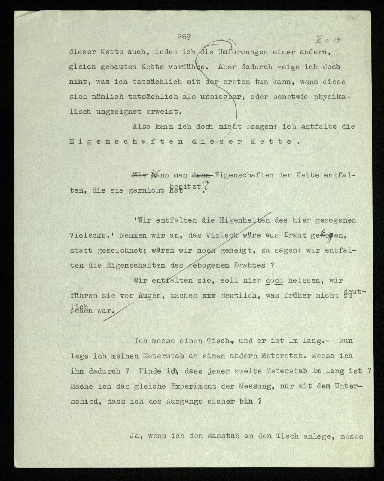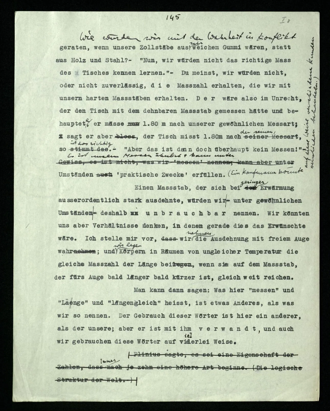 Wie würden wir mit der Wahrheit in Konflikt geraten, wenn unsere Zollstäbe aus sehr weichem Gummi wären, statt aus Holz und Stahl? – “Nun, wir würden nicht das richtige Maß des Tisches kennen lernen.” – Du meinst, wir würden nicht, oder nicht zuverlässig, die Maßzahl erhalten, die wir mit unsern harten Maßstäben erhalten. Der wäre also im Unrecht, der den Tisch mit dem dehnbaren Maßstab gemessen hätte und behauptete, er mäße 1.80 m nach unserer gewöhnlichen Meßart; sagt er aber, der Tisch mißt 1.80 m nach der seinen, so ist das richtig. – “Aber das ist dann doch überhaupt kein Messen!” – Es ist unserm Messen ähnlich & kann unter Umständen ‘praktische Zwecke’ erfüllen. (Ein Kaufmann könnte auf diese Weise verschiedene Kunden verschieden behandeln.) Einen Maßstab, der sich bei geringer Erwärmung außerordentlich stark ausdehnte, würden wir – unter gewöhnlichen Umständen – deshalb unbrauchbar nennen. Wir könnten uns aber Verhältnisse denken, in denen gerade dies das Erwünschte wäre. Ich stelle mir vor, wir nehmen die Ausdehnung mit freiem Auge wahr; und wir legen Körpern in Räumen von ungleicher Temperatur die gleiche Maßzahl der Länge bei, wenn sie auf dem Maßstab, der fürs Auge bald länger bald kürzer ist, gleich weit reichen. Man kann dann sagen: Was hier “messen” und “Länge” und “längengleich” heißt, ist etwas Anderes, als was wir so nennen. Der Gebrauch dieser Wörter ist hier ein anderer, als der unsere; aber er ist mit ihm verwandt, und auch wir gebrauchen diese Wörter auf vielerlei Weise.