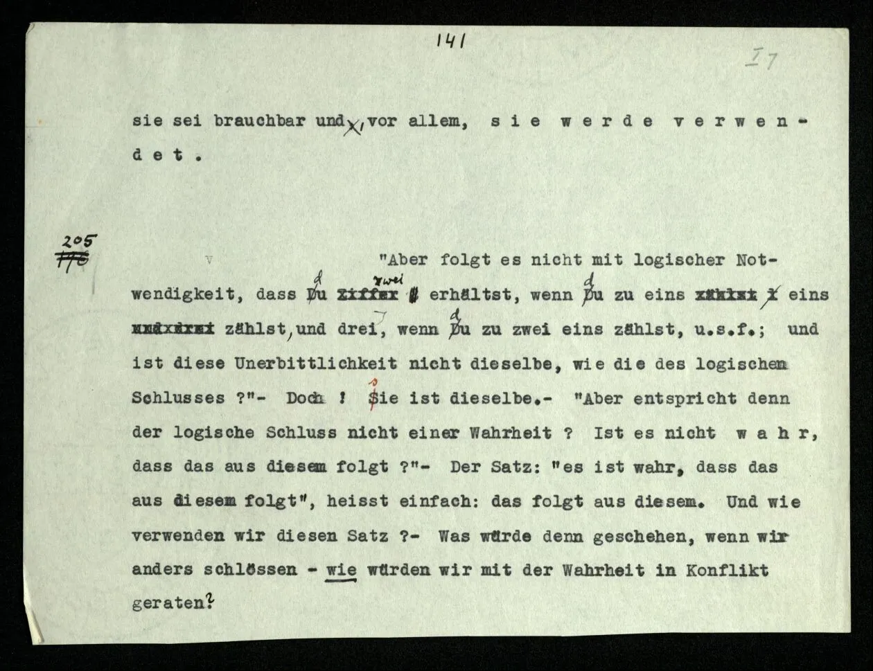 205 “Aber folgt es nicht mit logischer Notwendigkeit, daß du Zwei erhältst, wenn du zu eins eins zählst, und drei, wenn du zu zwei eins zählst, u.s.f.; und ist diese Unerbittlichkeit nicht dieselbe, wie die des logischen Schlusses?” – Doch! sie ist dieselbe. – “Aber entspricht denn der logische Schluß nicht einer Wahrheit? Ist es nicht wahr, daß das aus diesem folgt?” – Der Satz: “es ist wahr, daß das aus diesem folgt”, heißt einfach: das folgt aus diesem. Und wie verwenden wir diesen Satz? – Was würde denn geschehen, wenn wir anders schlössen – wie würden wir mit der Wahrheit in Konflikt geraten?