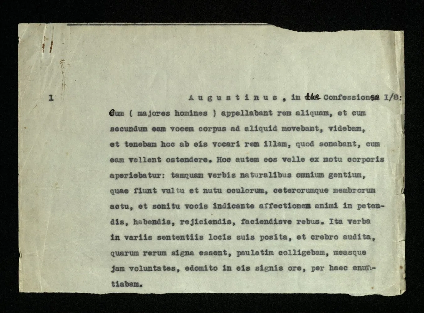 1 Augustinus, in the Confessions I/8: Cum (majores homines) appellabant rem aliquam, et cum secundum eam vocem corpus ad aliquid movebant, videbam, et tenebam hoc ab eis vocari rem illam, quod sonabant, cum eam vellent ostendere. Hoc autem eos velle ex motu corporis aperiebatur: tamquam verbis naturalibus omnium gentium, quae fiunt vultu et nutu oculorum, ceterorumque membrorum actu, et sonitu vocis indicante affectionem animi in petendis, habendis, rejiciendis, faciendisve rebus. Ita verba in variis sententiis locis suis posita, et crebro audita, quarum rerum signa essent, paulatim colligebam, measque jam voluntates, edomito in eis signis ore, per haec enuntiabam. In these words we get – it seems to me – a definite picture of the nature of human language. Namely this: the words of language name objects – sentences are combinations of such names. In this picture of human language we find the root of the idea: every word has a meaning. This meaning is correlated to the word. It is the object which the word stands for. Augustine however does not speak of a distinction between parts of speech. If one describes the learning of language in this way, one thinks – I should imagine – primarily of substantives, like “table”, “chair”, “bread” and the names of persons; and of the other parts of speech as something that will come out all right eventually.