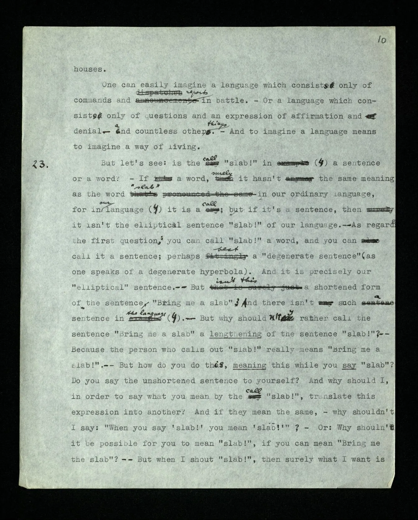 23 But let’s see: is the call “slab!” in (4) a sentence or a word? – If a word, surely it hasn’t the same meaning as the word “slab” in our ordinary language, for in our language (4) it is a call; but if it’s a sentence, then it isn’t the elliptical sentence “slab!” of our language. – – – As regards the first question: you can call “slab!” a word, and you can call it a sentence; perhaps best a “degenerate sentence” (as one speaks of a degenerate hyperbola). And it is precisely our “elliptical” sentence. – – – But isn’t this a shortened form of the sentence “Bring me a slab”? And there isn’t such a sentence in the language (4). – But why shouldn’t I rather call the sentence “Bring me a slab” a lengthening of the sentence “slab!”? – – – Because the person who calls out “slab!” really means “Bring me a slab!”. – – – But how do you do this, meaning this while you say “slab”? Do you say the unshortened sentence to yourself? And why should I, in order to say what you mean by the call “slab!”, translate this expression into another? And if they mean the same, – why shouldn’t I say: “When you say ‘slab!’ you mean ‘slab!’”? – Or: Why shouldn’t it be possible for you to mean “slab!”, if you can mean “Bring me the slab”? – – – But when I shout “slab!”, then surely what I want is that he shall bring me a slab. – – – Certainly, but does “wanting this” consist in the fact that you think in any form a different sentence from the one you speak? –