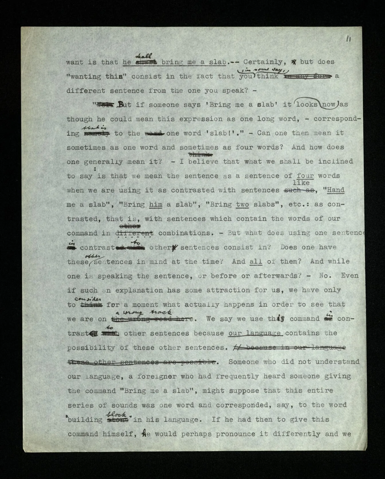 24 “But if someone says ‘Bring me a slab’ it now looks as though he could mean this expression as one long word, – corresponding, that is, to the one word ‘slab!’.” – Can one mean it sometimes as one word and sometimes as four words? And how does one generally mean it? – I believe that what we shall be inclined to say: is that we mean the sentence as a sentence of four words when we are using it as contrasted with sentences like, “Hand me a slab”, “Bring him a slab”, “Bring two slabs”, etc.: as contrasted, that is, with sentences which contain the words of our command in different combinations. – But what does using one sentence in contrast to other sentences consist in? Does one have these other sentences in mind at the time? And all of them? And while one is speaking the sentence, or before or afterwards? – No. Even if such an explanation has some attraction for us, we have only to consider for a moment what actually happens in order to see that we are on a wrong track. We say we use this command in contrast to other sentences. because our language contains the possibility of these other sentences. Someone who did not understand our language, a foreigner who had frequently heard someone giving the command “Bring me the slab”, might suppose that this entire series of sounds was one word and corresponded, say, to the word “building block” in his language. If he had then to give this command himself, he would perhaps pronounce it differently and we should say: He pronounces it so queerly because he thinks it is one word. – But doesn’t something different happen in him when he utters it, corresponding to the fact that he regards the sentence as one word? The same thing may happen in him, or again something different may. What happens in you when you give a command of that sort? Are you conscious that it consists of four words while you are uttering it? Of course, you know this language, in which there are those other sentences also, but is this knowing something that happens while you are uttering the sentence? – And I have admitted, that the foreigner who views the sentence differently will probably also pronounce it differently, but what we call his wrong view doesn’t necessarily consist in anything that accompanies the uttering of the command. (Of this more later.)