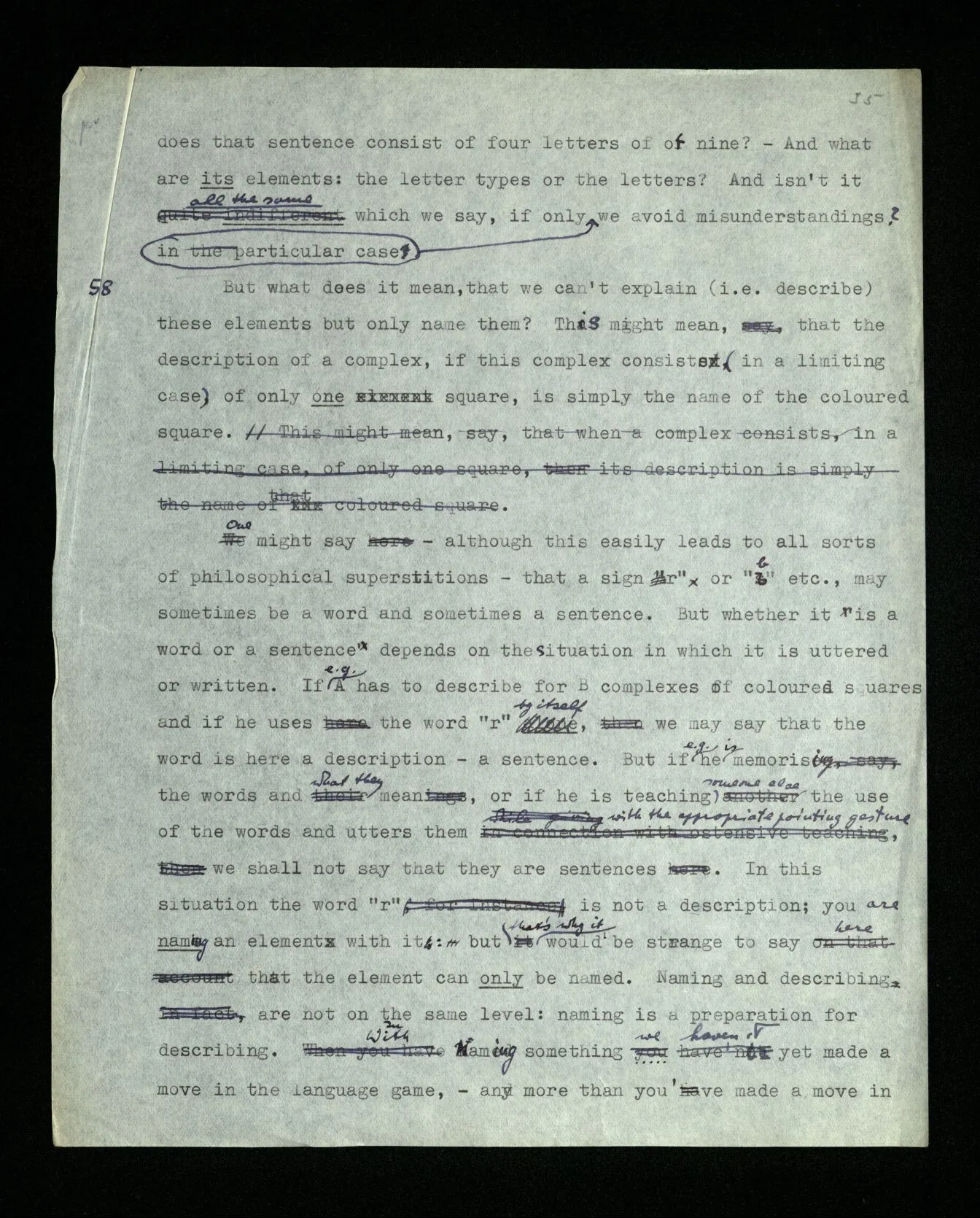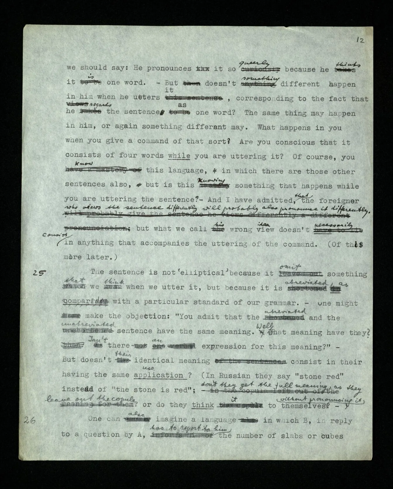 25 The sentence is not ‘elliptical’ because it omits something that we think when we utter it, but because it is abbreviated, as compared with a particular standard of our grammar. – One might make the objection: “You admit that the abbreviated and the unabbreviated sentence have the same meaning. Well, what meaning have they? Isn’t there an expression for this meaning?” – But doesn’t their identical meaning consist in their having the same application? (In Russian they say “stone red” instead of “the stone is red”; don’t they get the full meaning, as they leave out the copula? or do they think it to themselves without pronouncing it? –)