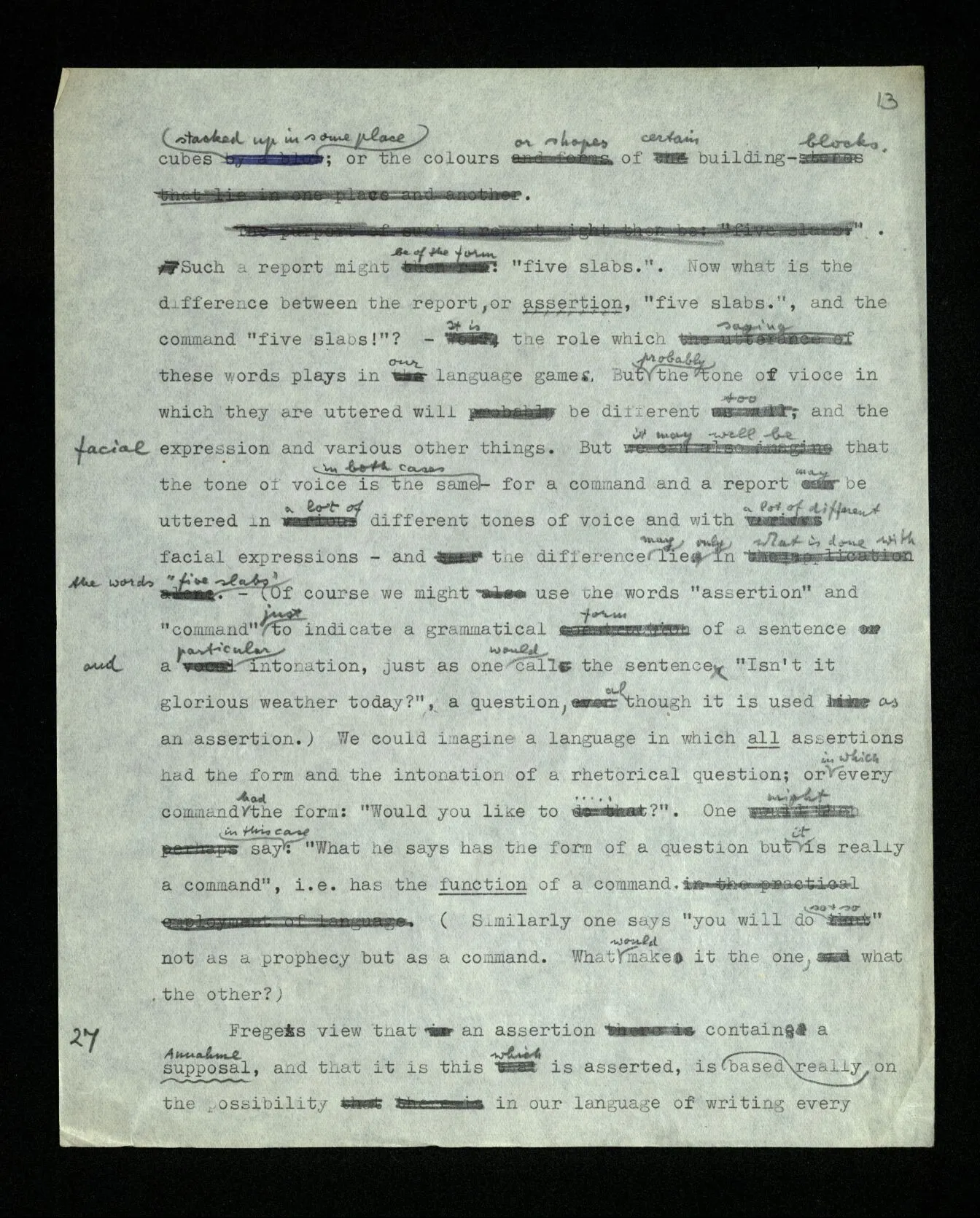 26 One can also imagine a language in which B, in reply to a question by A, has to report to him the number of slabs or cubes stacked up in some place; or the colours or shapes of certain building-blocks. Such a report might be of the form: “five slabs.”. Now what is the difference between the report, or assertion, “five slabs.”, and the command “five slabs!”? – It is the role which saying these words plays in our language games. But probably the tone of voice in which they are uttered will be different too, and the facial expression and various other things. But it may well be that the tone of voice is the same in both cases – for a command and a report may be uttered in a lot of different tones of voice and with a lot of different facial expressions – and the difference may lie only in what is done with the words “five slabs”. – (Of course we might use the words “assertion” and “command” just to indicate a grammatical form of a sentence and a particular intonation, just as one would call the sentence “Isn’t it glorious weather today?”, a question, although it is used as an assertion.) We could imagine a language in which all assertions had the form and the intonation of a rhetorical question; or in which every command had the form: “Would you like to …?”. One might say in this case: “What he says has the form of a question but it is really a command”, i.e. has the function of a command. (Similarly one says “you will do so & so” not as a prophecy but as a command. What would make it the one, what the other?)
