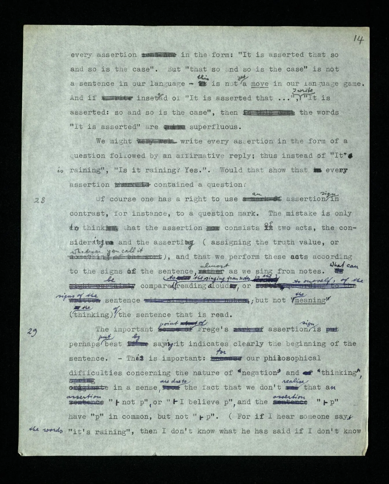 28 Of course one has a right to use an assertion sign in contrast, for instance, to a question mark. The mistake is only to think that the assertion consists of two acts, the considering and the asserting (assigning the truth value, or whatever you call it), and that we perform these acts according to the signs of the sentence, almost as we sing from notes. What can be compared to the singing from notes is the reading aloud, or to oneself, of the signs of the sentence; but not the meaning (the thinking) of the sentence that is read.