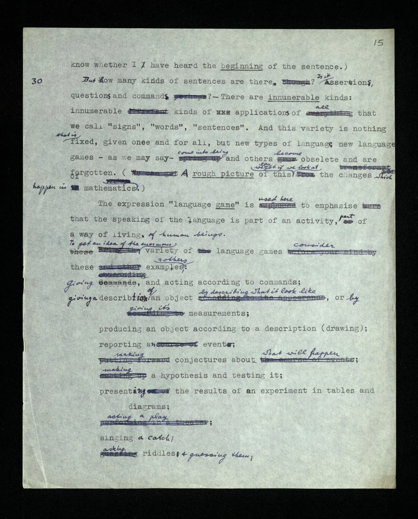 30 But how many kinds of sentence are there? Is it assertions, questions and commands? – There are innumerable kinds: innumerable kinds of applications of all that we call “signs”, “words”, “sentences”. And this variety is nothing that is fixed, given once and for all, but new types of language, new language games – as we may say – come into being and others become obsolete and are forgotten. (A rough picture of this we can get if we look at the changes which happen in mathematics.) The expression “language game” is used here to emphasise that the speaking of the language is part of an activity, part of a way of living of human beings. To get an idea of the enormous variety of language games consider these examples, & others: giving commands, and acting according to commands; giving a description of an object by describing what it looks like, or by giving its measurements; producing an object according to a description (drawing); reporting an event; making a hypothesis and testing it; presenting the results of an experiment in tables and diagrams; acting a play; singing a catch; asking riddles and guessing them; making a joke, or telling one; solving a problem in applied arithmetic; translating from one language into another; requesting, thanking, swearing, greeting, praying.