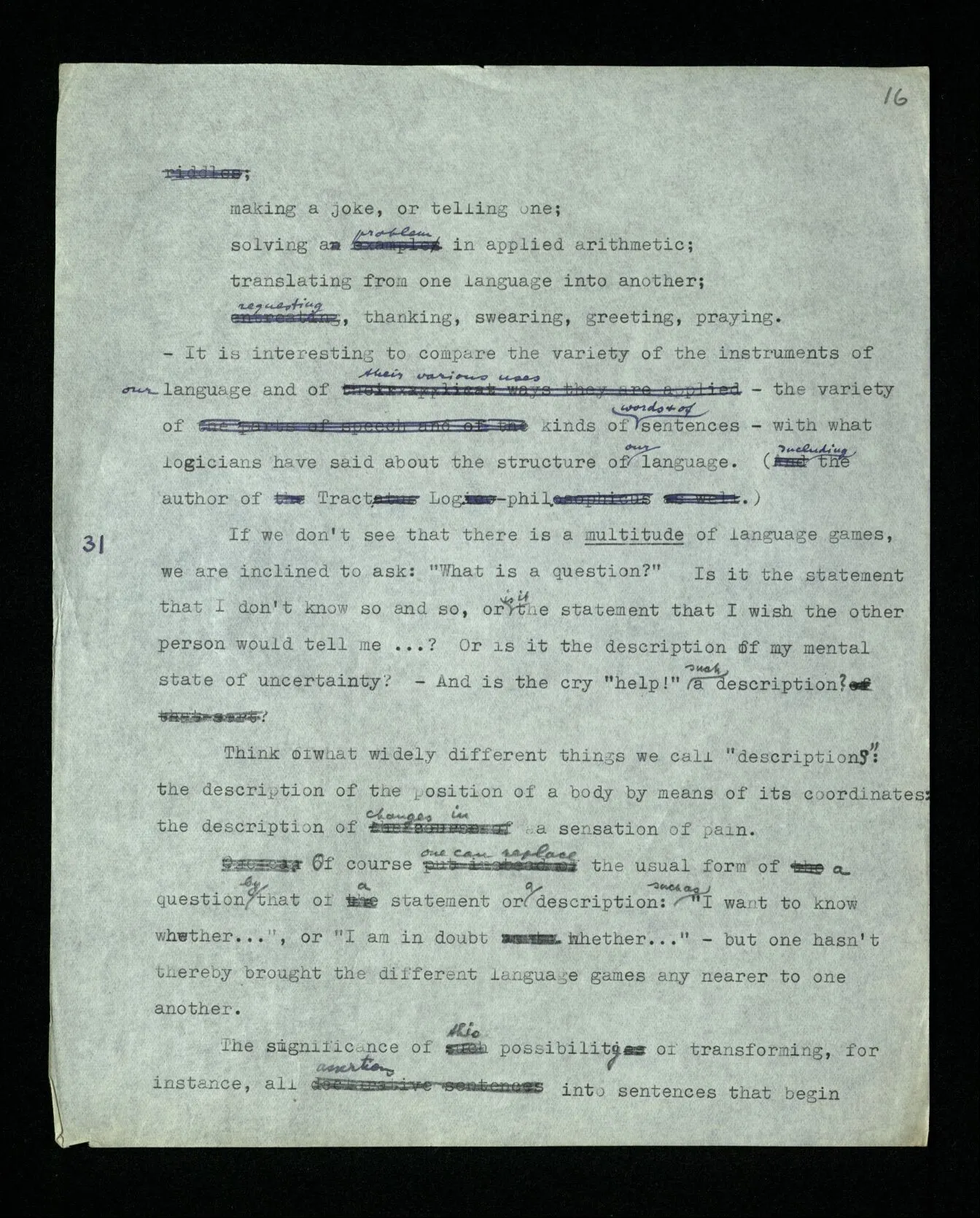 31 If we don’t see that there is a multitude of language games, we are inclined to ask: “What is a question?” Is it the statement that I don’t know so and so, or is it the statement that I wish the other person would tell me …? Or is it the description of my mental state of uncertainty? – And is the cry “help!” such a description? Think of what widely different things we call “descriptions”: the description of the position of a body by means of its coordinates: the description of changes in a sensation of pain. Of course one can replace the usual form of a question by that of a statement or a description: such as “I want to know whether …”, or “I am in doubt whether …” – but one hasn’t thereby brought the different language games any nearer to one another. The significance of this possibility of transforming, for instance, all assertions into sentences that begin with the words “I think” or “I believe” (i.e. so to speak into descriptions of my mental states) will appear later.