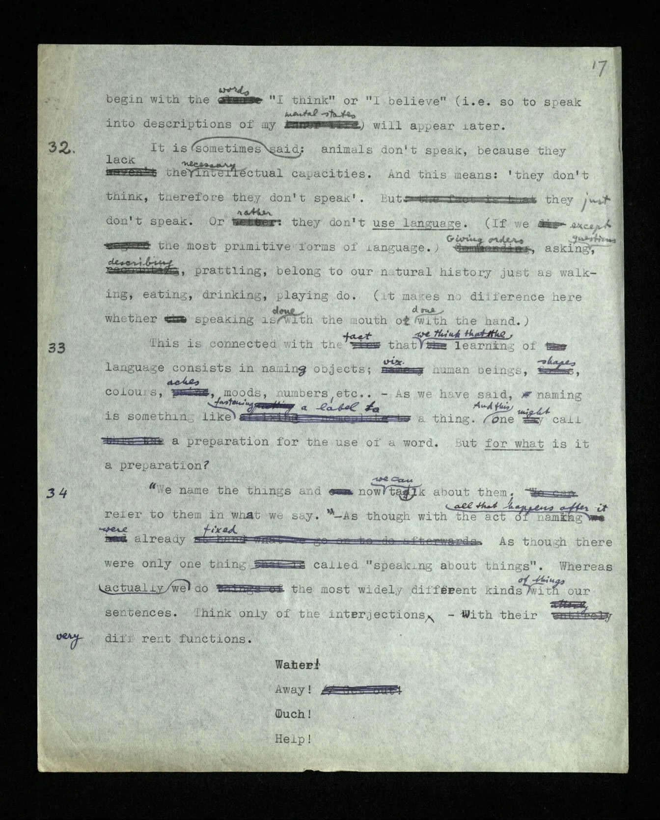34 “We name things and now we can talk about them; refer to them in what we say.” – As though with the act of naming all that happens after it were already fixed. As though there were only one thing called “speaking about things”. Whereas we actually do the most widely different kinds of things with our sentences. Think only of the interjections– with their very different functions. Water! Away! Ouch! Help! Beautiful! No!
