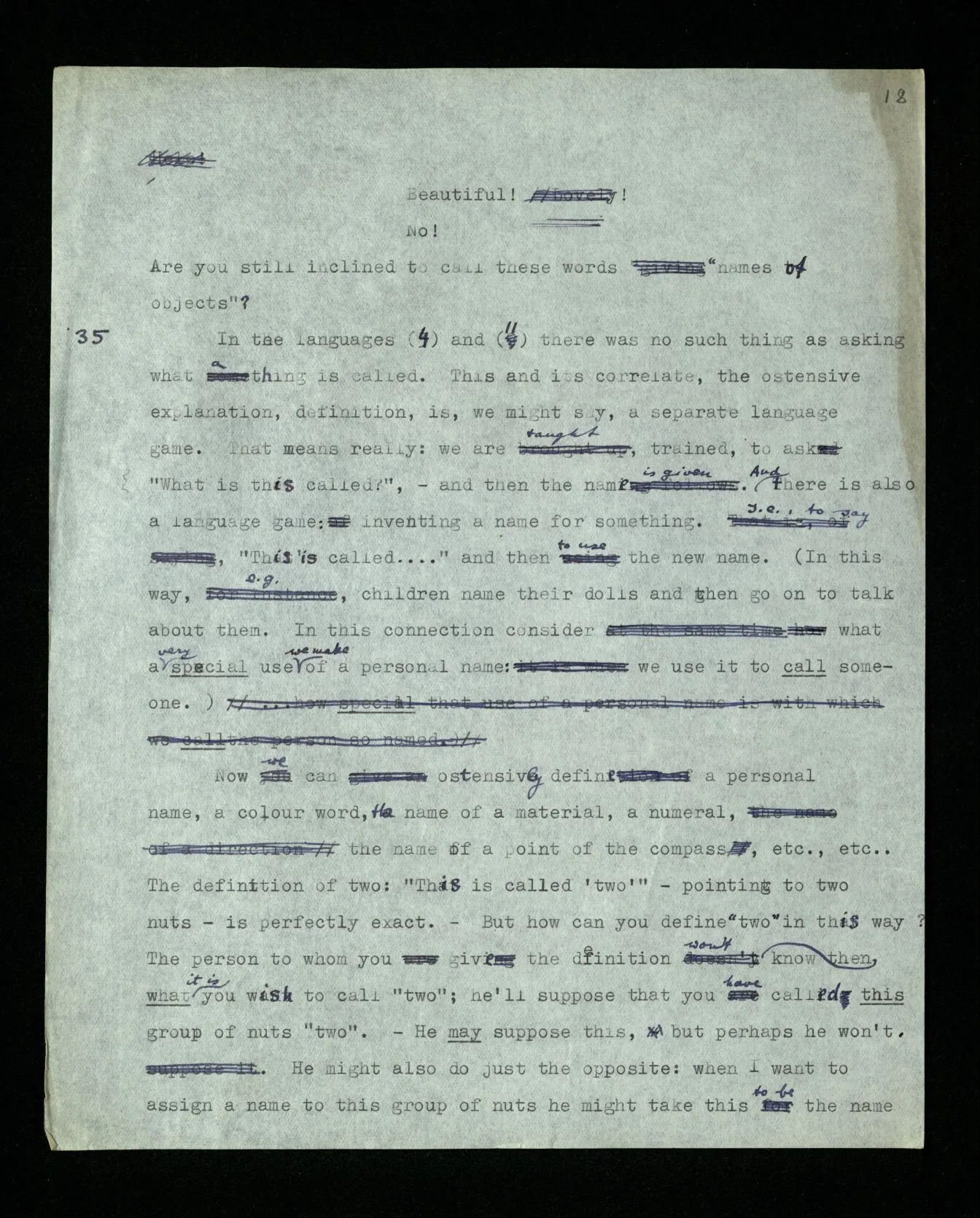 35 In the languages (4) and (11) there was no such thing as asking what a thing is called. This and its correlate, the ostensive explanation, definition, is, we might say, a separate language game. That means really: we are taught, trained, to ask “What is this called?”, – and then the name is given. And there is also a language game: inventing a name for something. I.e., to say, “This is called …” and then to use the new name. (In this way, e.g., children name their dolls and then go on to talk about them. In this connection consider what a very special use we make of a personal name: we use it to call someone.) Now we can ostensively define a personal name, a colour word, the name of a material, a numeral, the name of a point of the compass, etc., etc.. The definition of two: “This is called ‘two’” – pointing to two nuts – is perfectly exact. – But how can you define “two” in this way? The person to whom you give the definition won’t then know what it is you wish to call “two”; he’ll suppose that you have called this group of nuts “two”. – He may suppose this, but perhaps he won’t. He might also do just the opposite: when I want to assign a name to this group of nuts he might take this to be the name of a number. And equally, if I give an ostensive definition of a personal name, he might take it to be the name of a colour, the name of a race, even the name of a point of the compass. That is, the ostensive definition can in all cases be interpreted in this way or in that way.