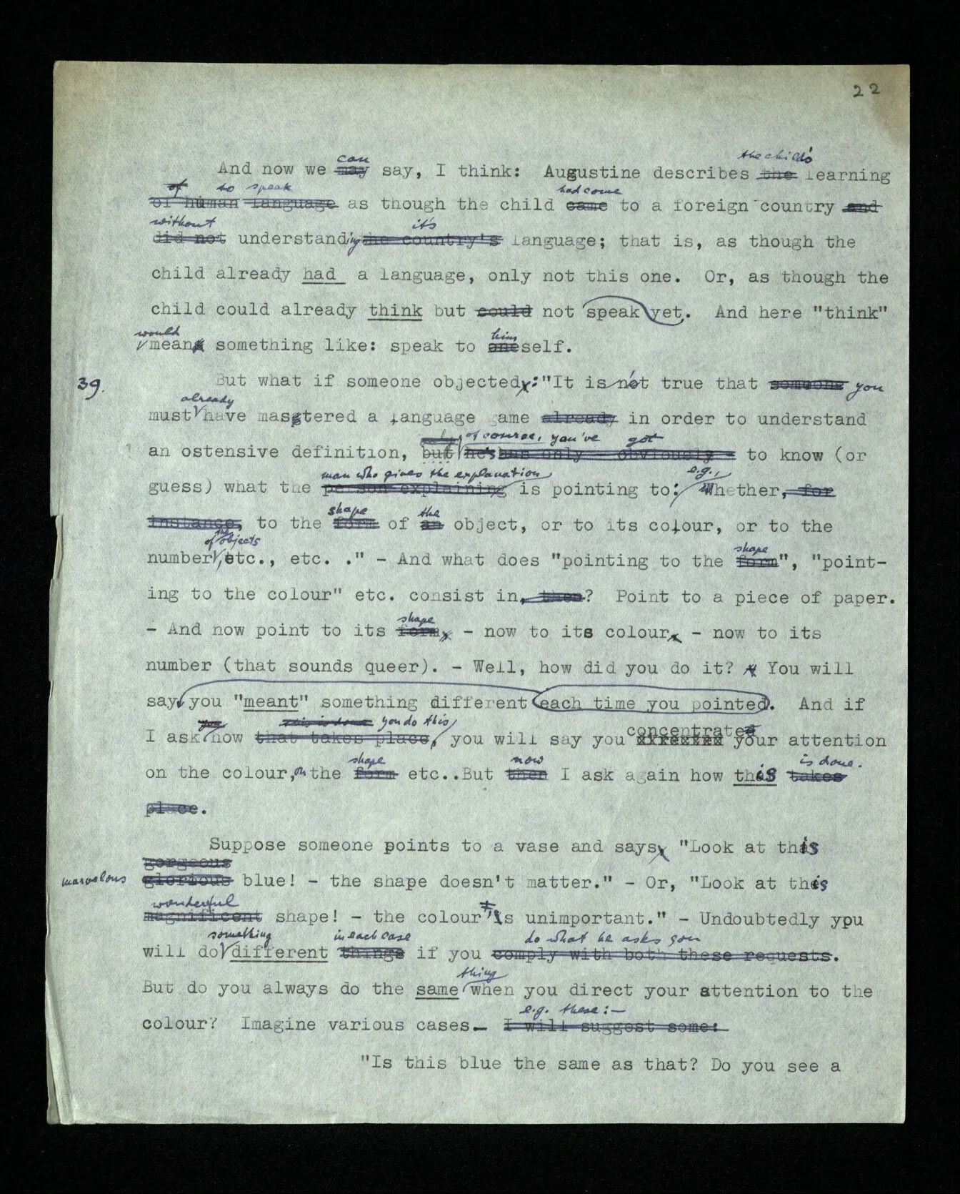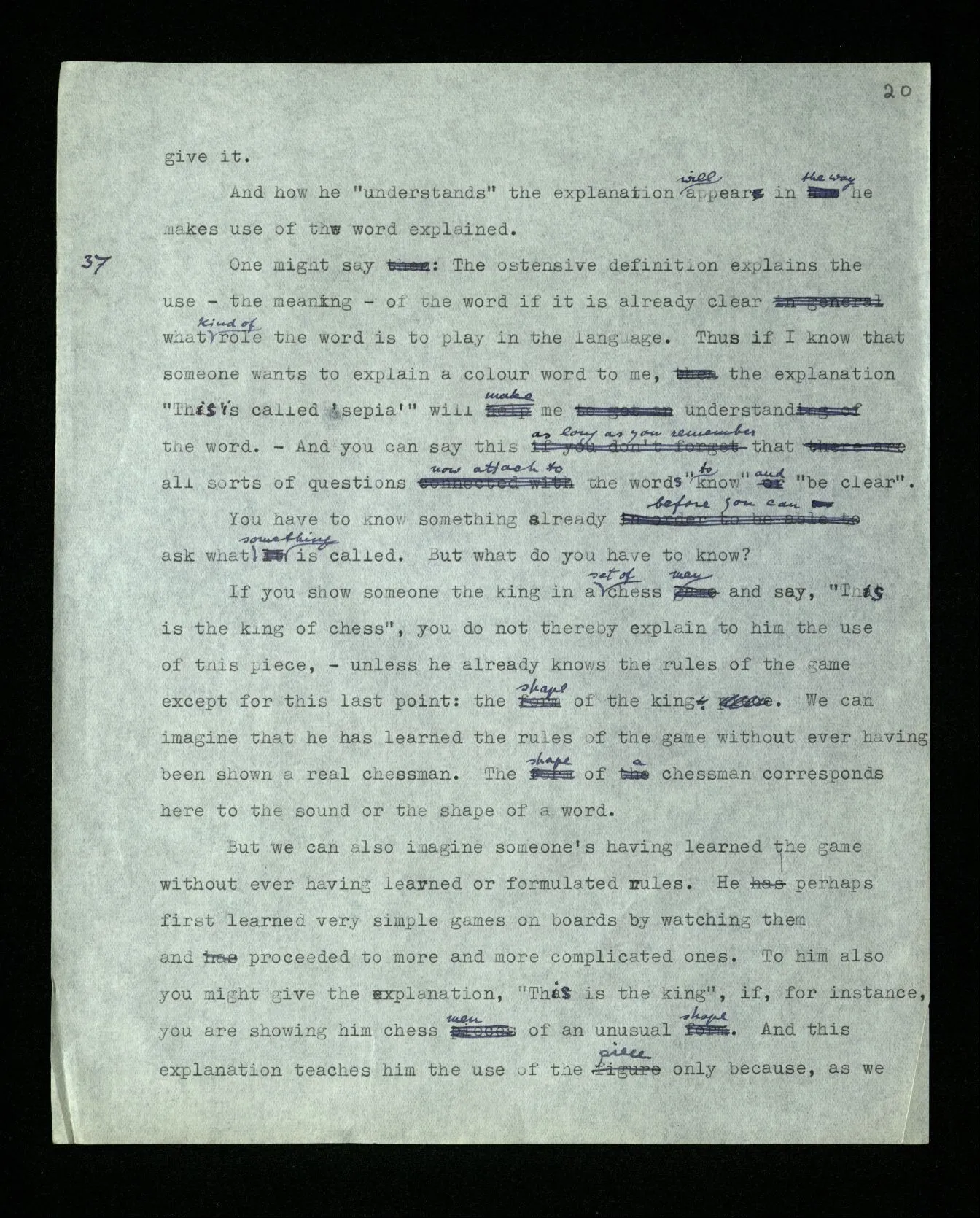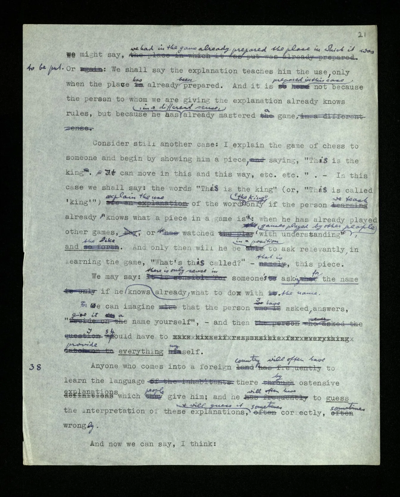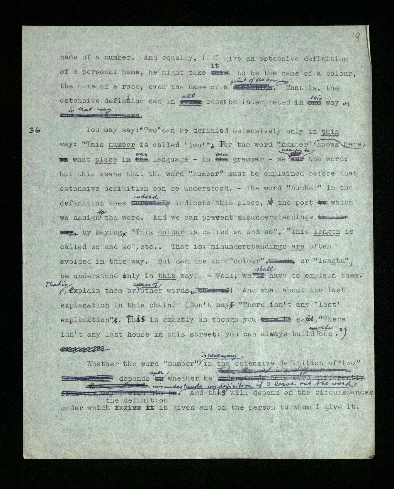 36 You may say: “Two” can be defined ostensively only in this way: “This number is called ‘two’”. For the word “number” here shows what place in our language – in our grammar – we assign to the word; but this means that the word “number” must be explained before that ostensive definition can be understood. – The word “number” in the definition does indeed indicate this place, the post which we assign to the word. And we can prevent misunderstandings by saying “This colour is called so and so”, “This length is called so and so”, etc.. That is: misunderstandings are often avoided in this way. But can the word “colour”, or “length”, be understood only in this way? – Well, we shall have to explain them. That is, explain them by means of other words! And what about the last explanation in this chain? (Don’t say “There isn’t any ‘last’ explanation”. This is exactly as though you said, “There isn’t any last house in this street: you can always build another one.”) Whether the word “number” is necessary in the ostensive definition of “two” depends upon whether he misunderstands my definition if I leave out the word. And this will depend on the circumstances under which the definition is given and on the person to whom I give it. And how he “understands” the explanation will appear in the way he makes use of the word explained.